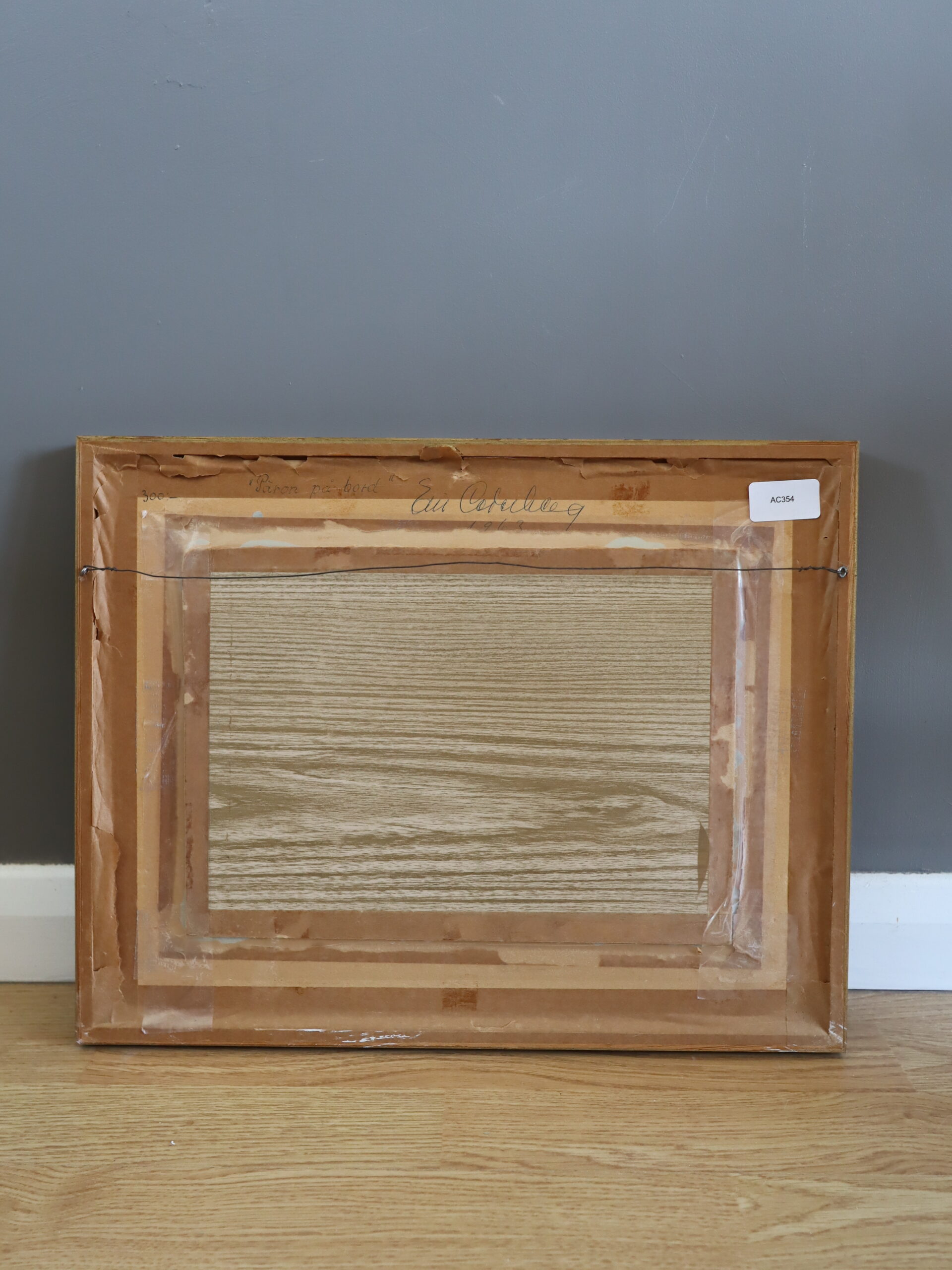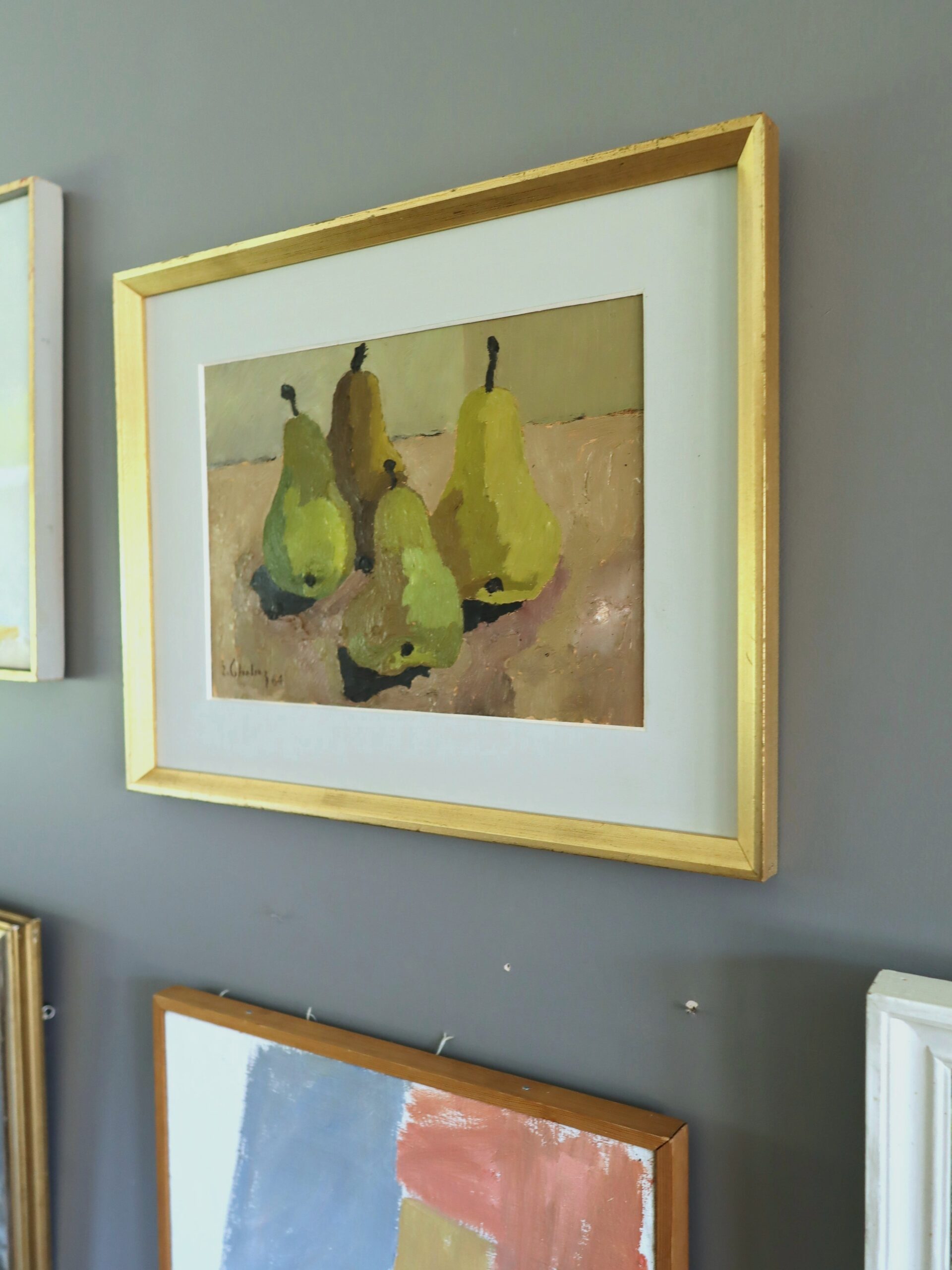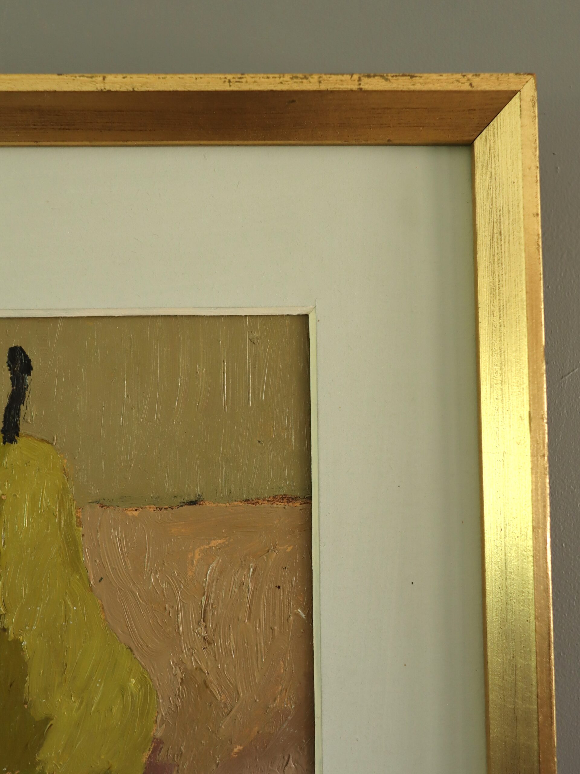This oil on board is housed in a complementary gilt frame with an inner border. The painting is in excellent vintage condition. The frame has some minor scuffing but is in good condition overall.
