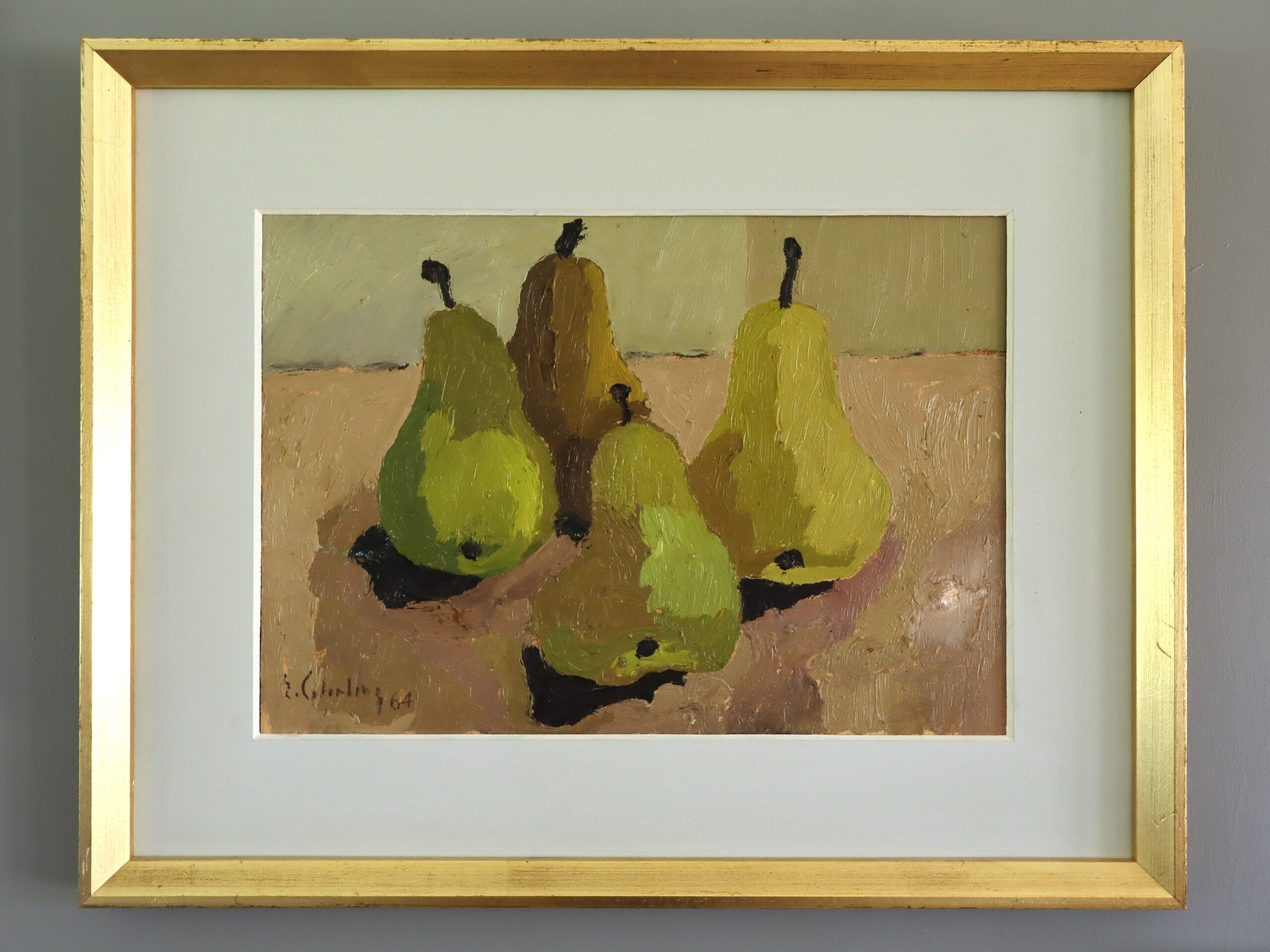 The composition features four pears clustered in an intimate arrangement, their irregular forms casting deep shadows on a softly textured tabletop. Rendered in thick, deliberate strokes, the pears exhibit a range of green and golden tones, highlighting the subtle variations in ripeness and light. The background is divided into muted blocks of beige and muted pink, adding a sense of modernist abstraction while allowing the forms to remain grounded and tangible.