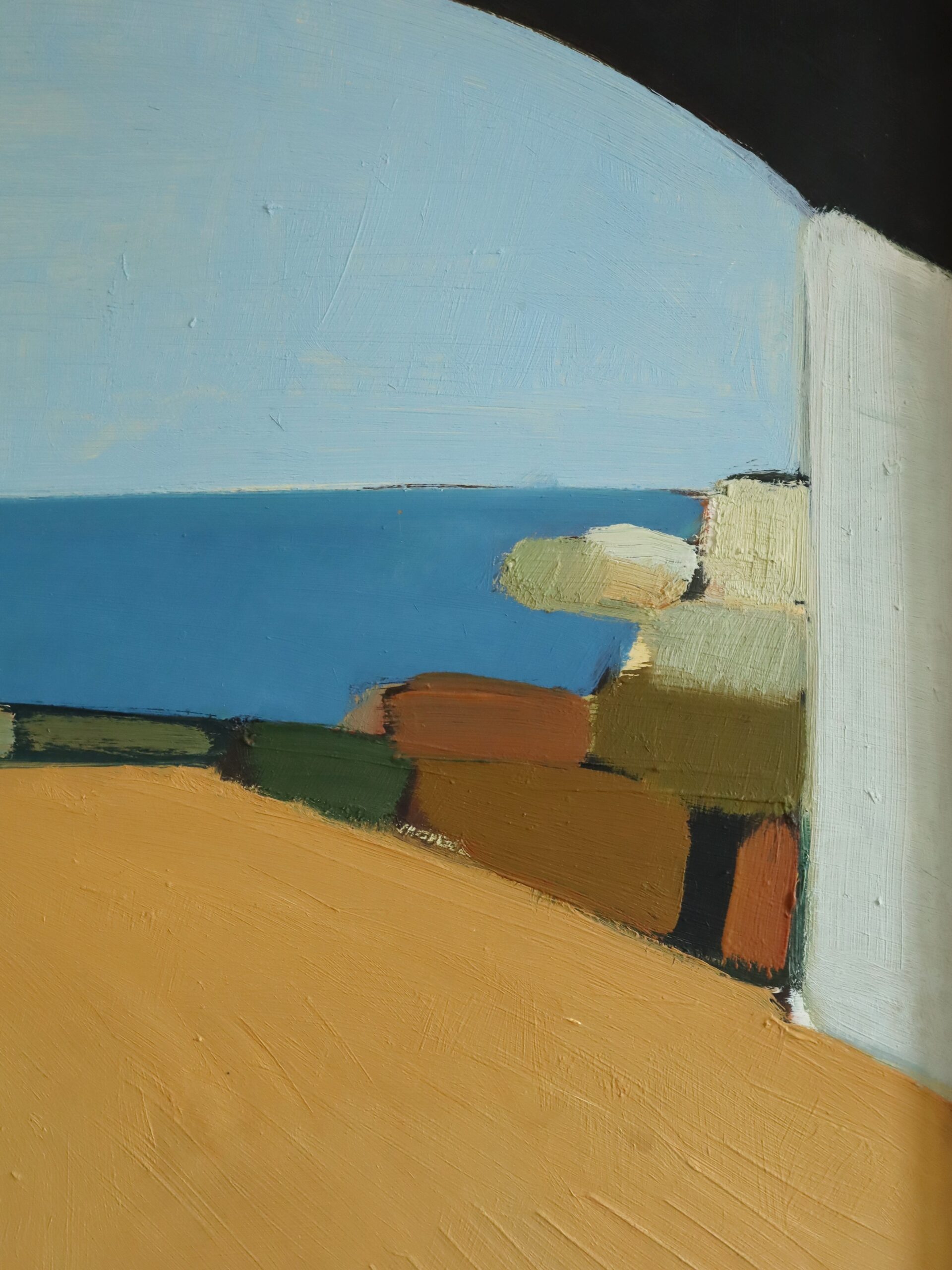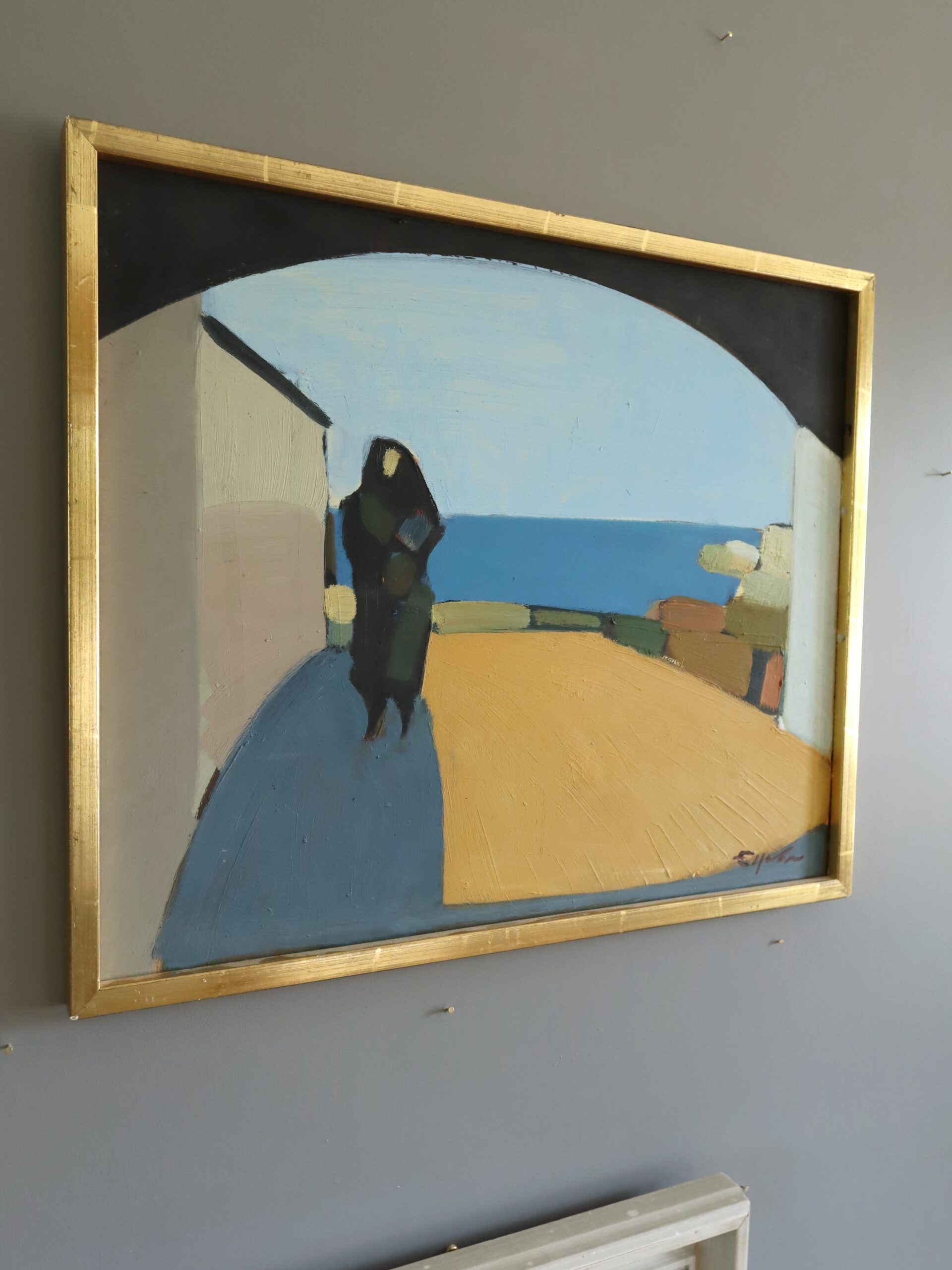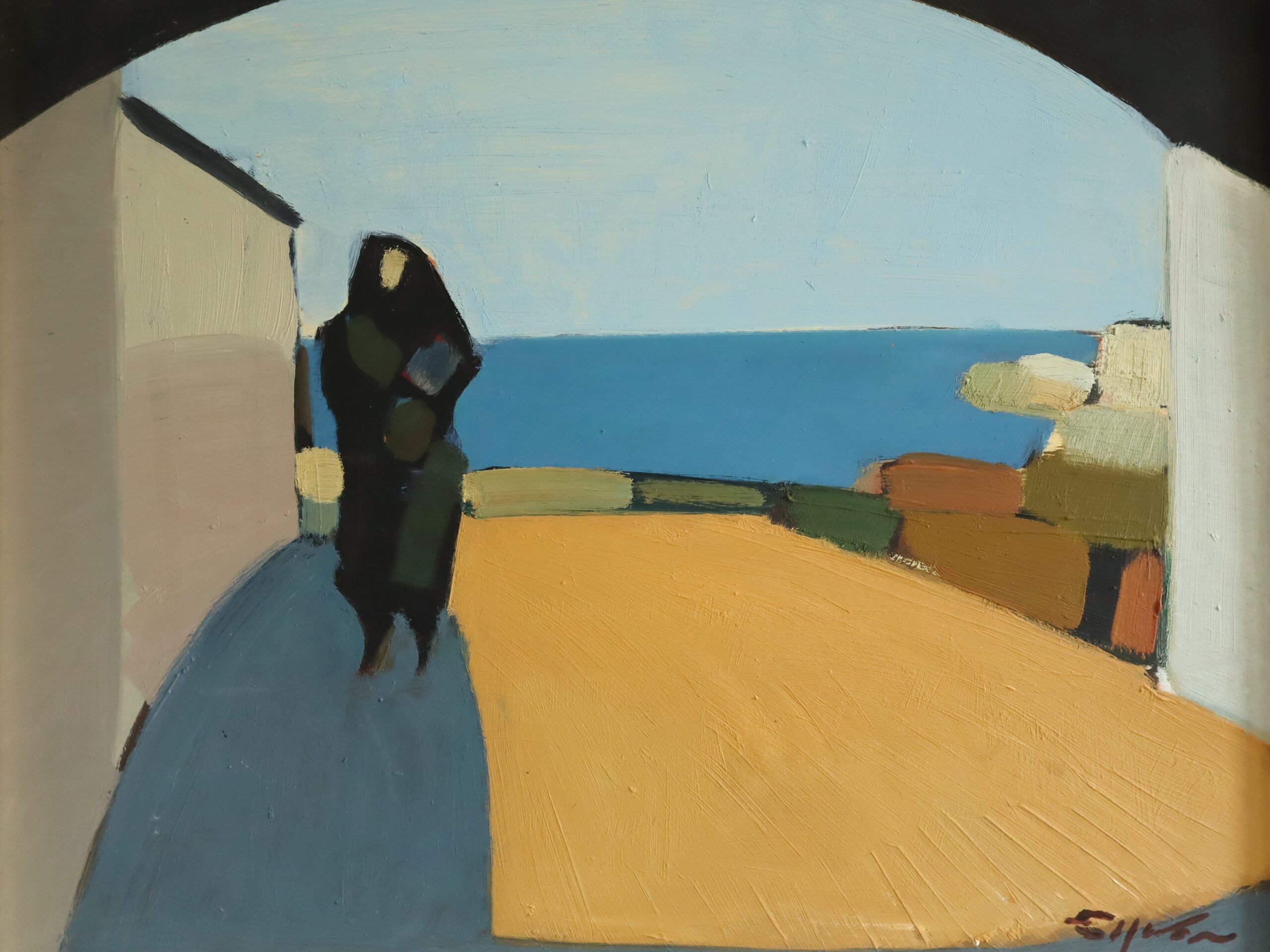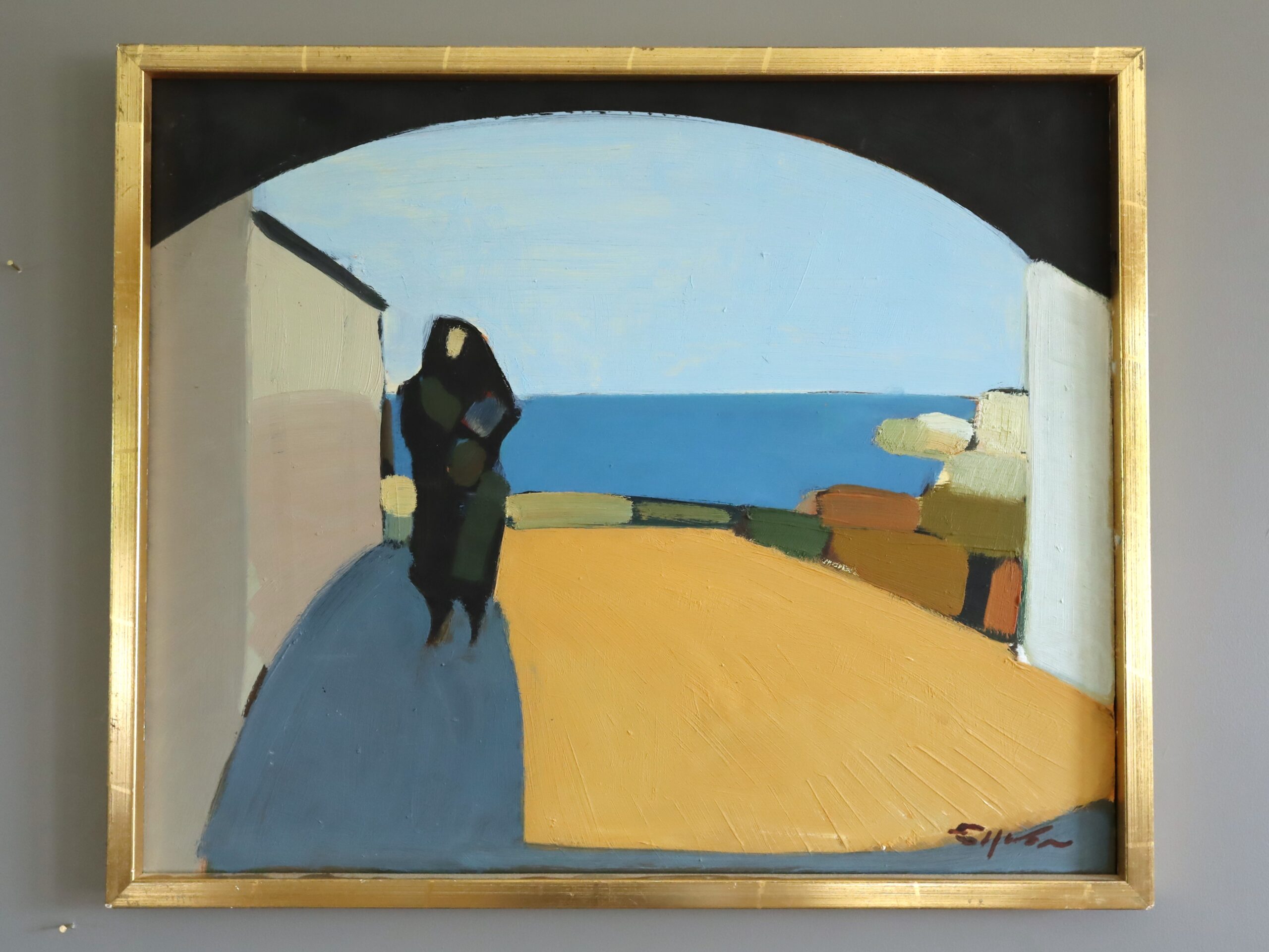 A striking modernist style coastal landscape with figure oil painting, by Swedish artist Eric Elfvén (1921–2008), whose works have been exhibited in public collections including the Moderna Museet in Stockholm, Jönköping Museum, Borås Art Museum, and the Victoria and Albert Museum in London.
