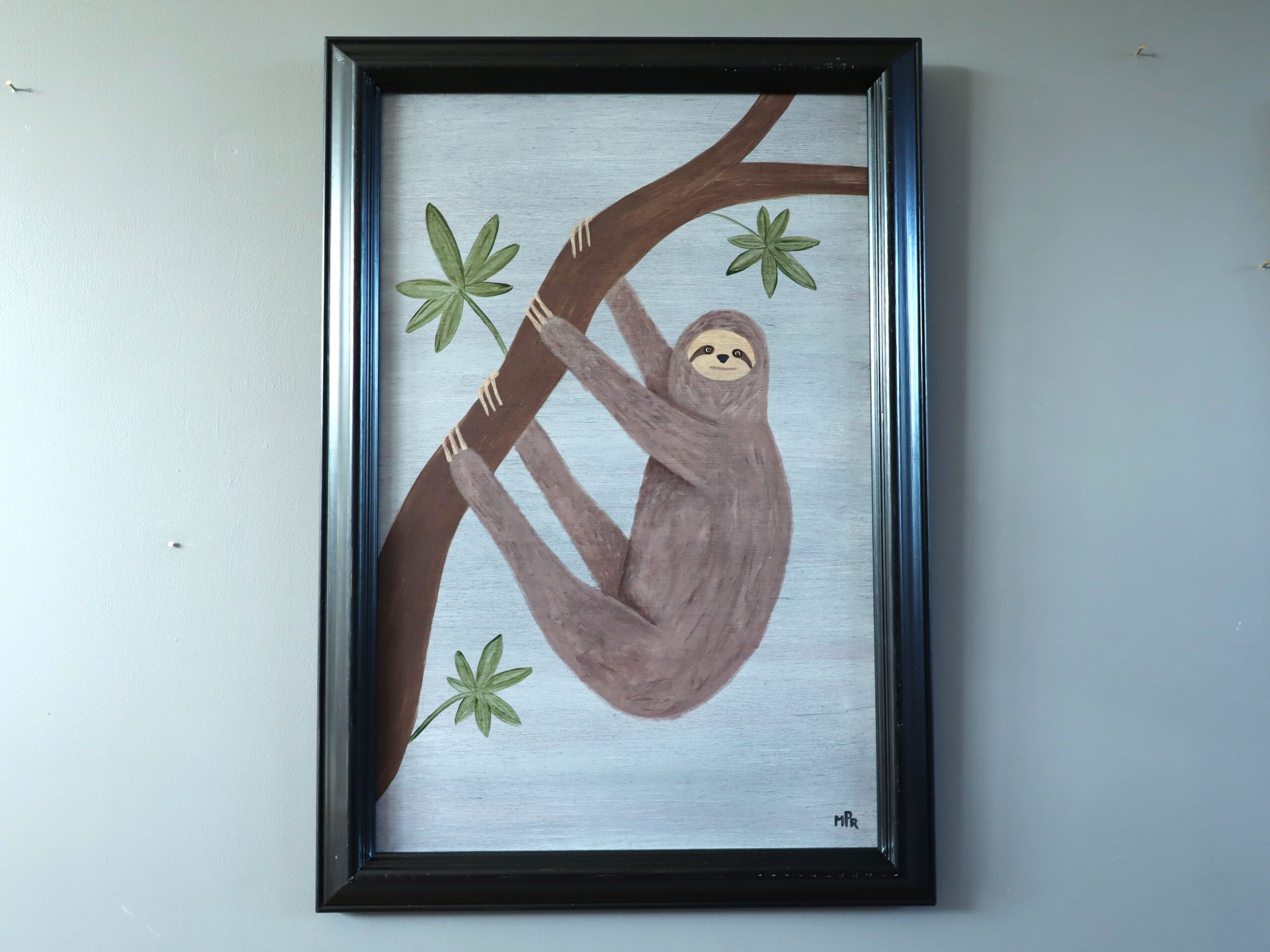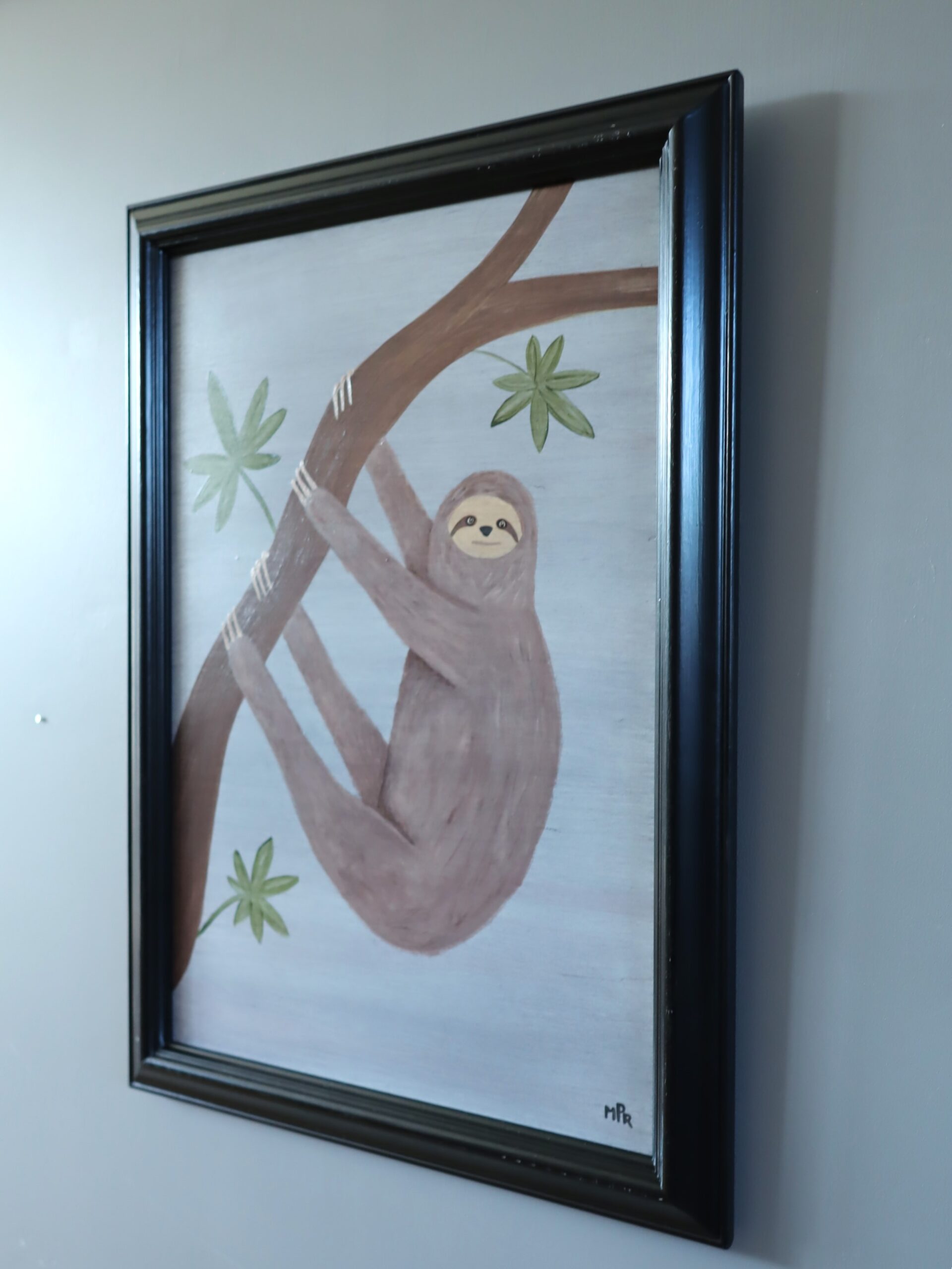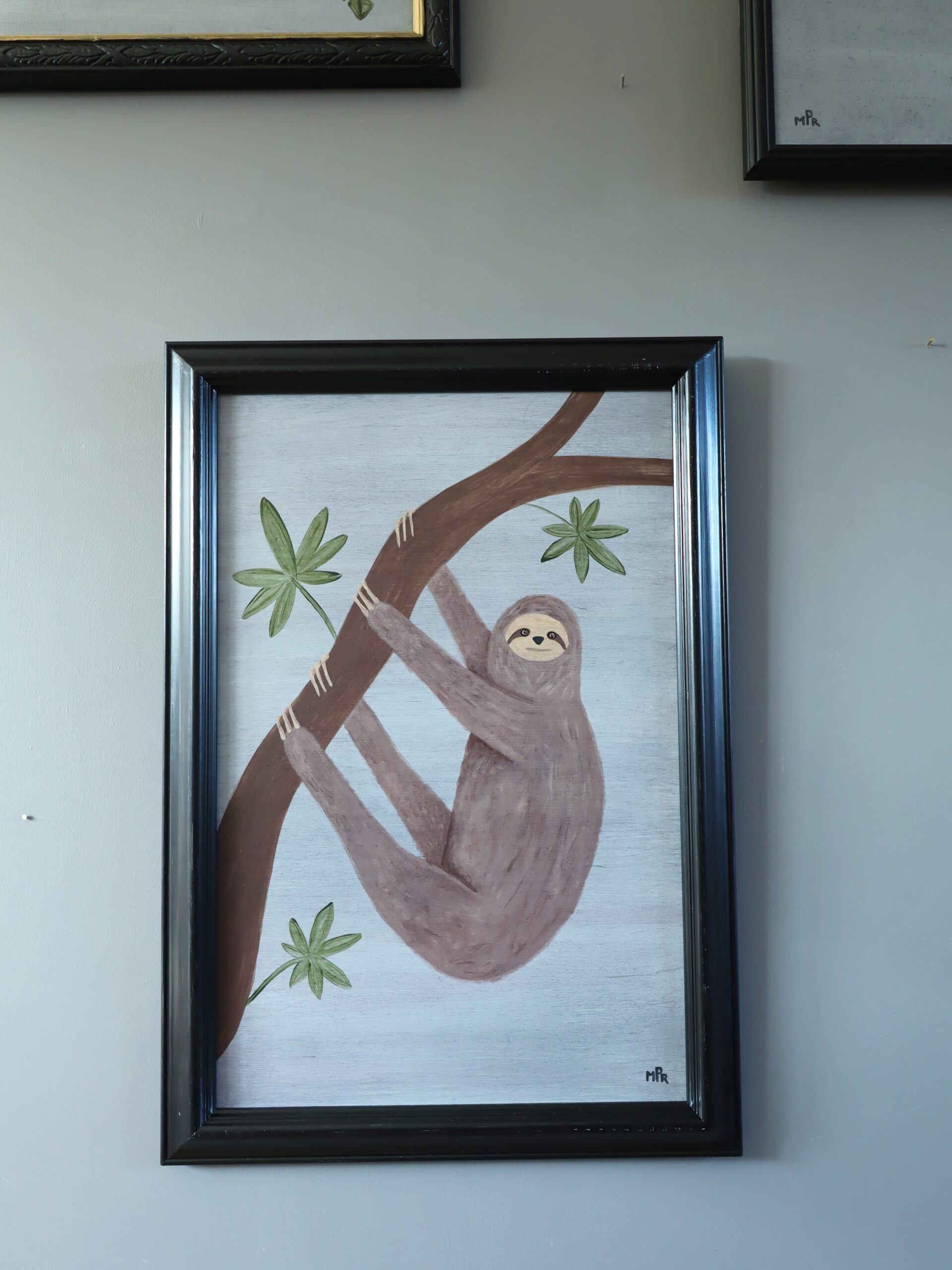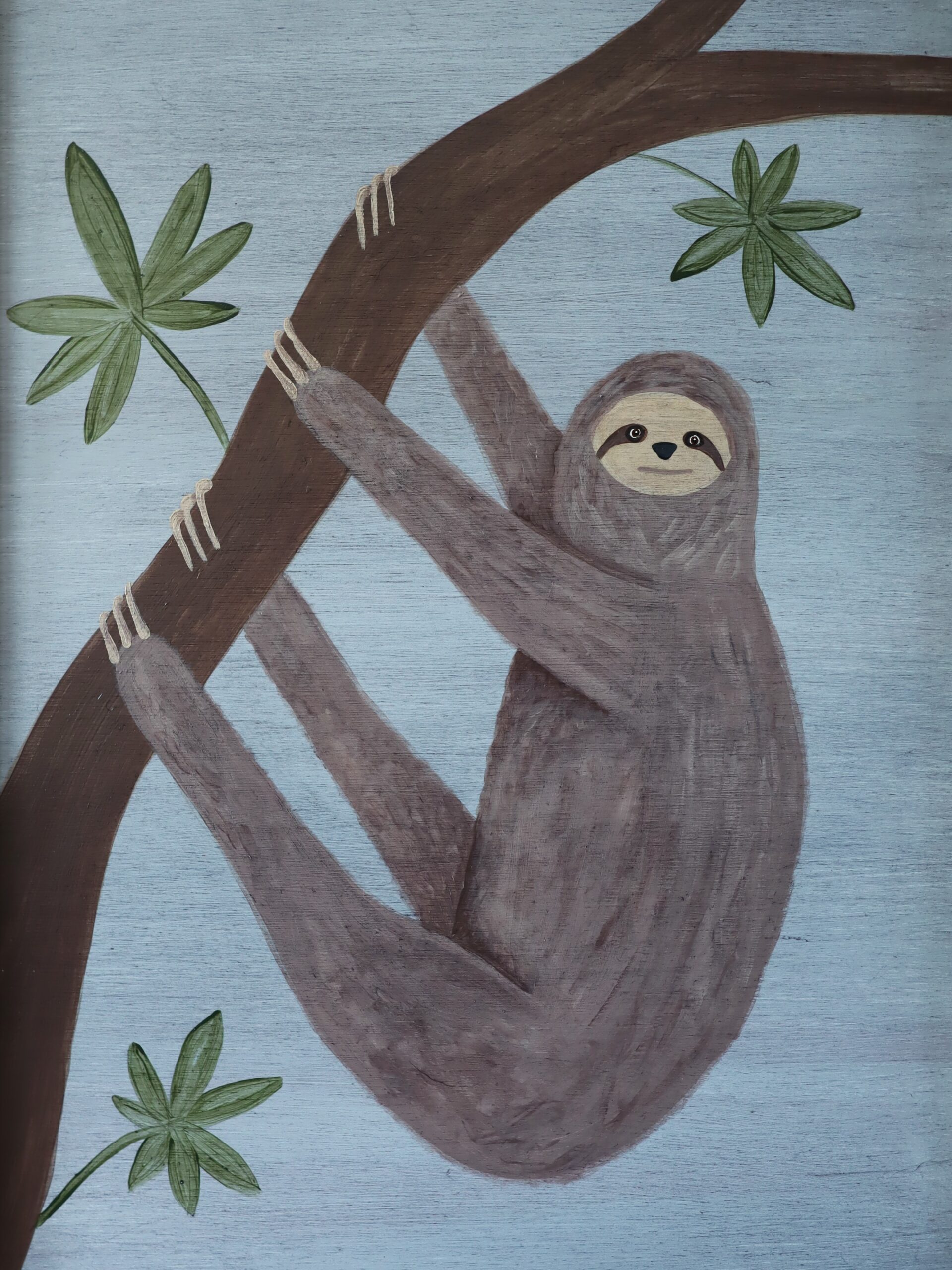 A contemporary painting depicting a sloth gently clinging to a curved tree branch, painted in oil on panel in a deliberately naïve style by British artist Matt Rix.