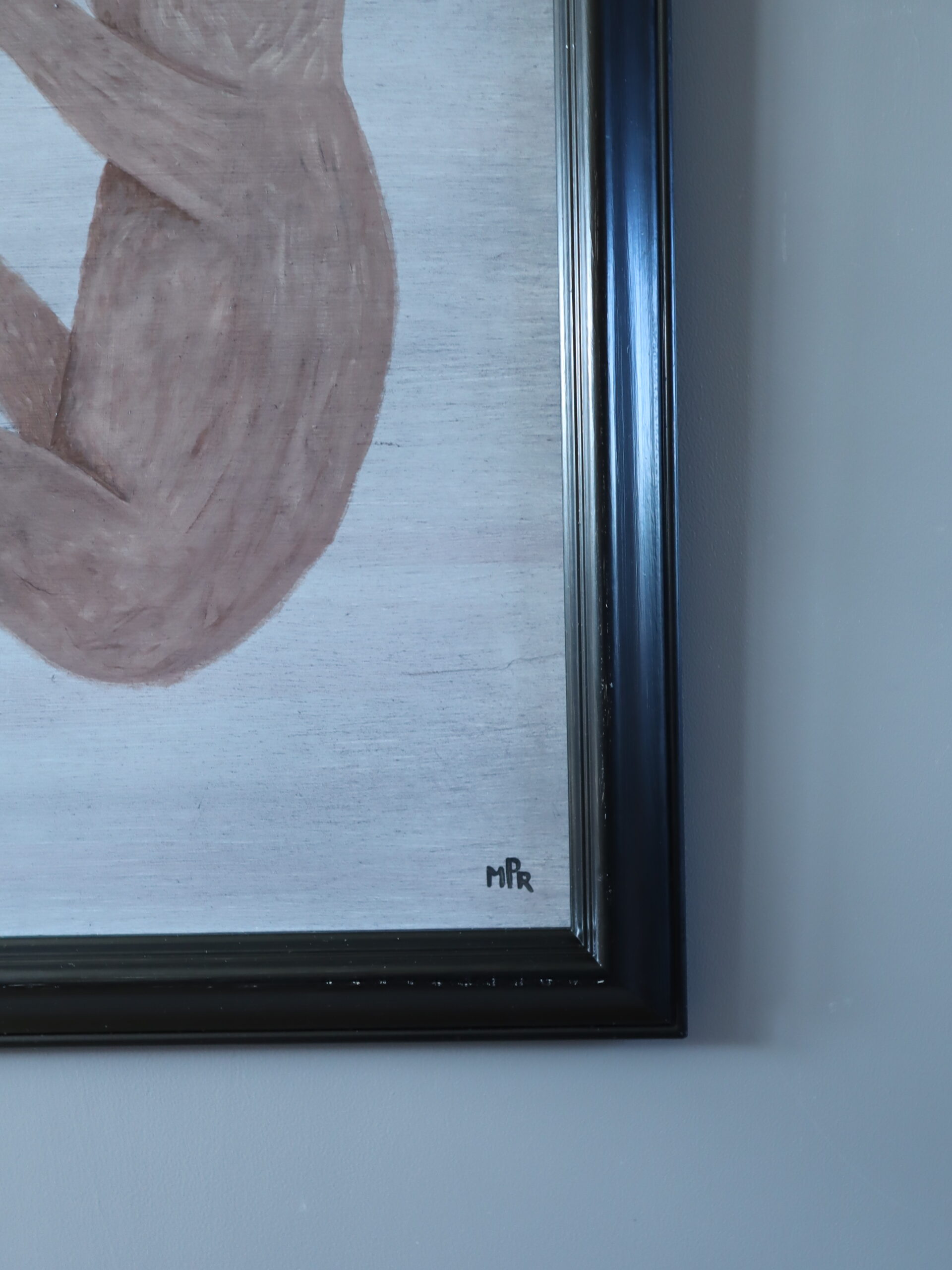 Brushstrokes are smooth and controlled with a matte finish, emphasising shape and line over texture. The overall effect is tranquil and subtly whimsical, capturing a moment of rest and balance that feels both tender and contemplative.
