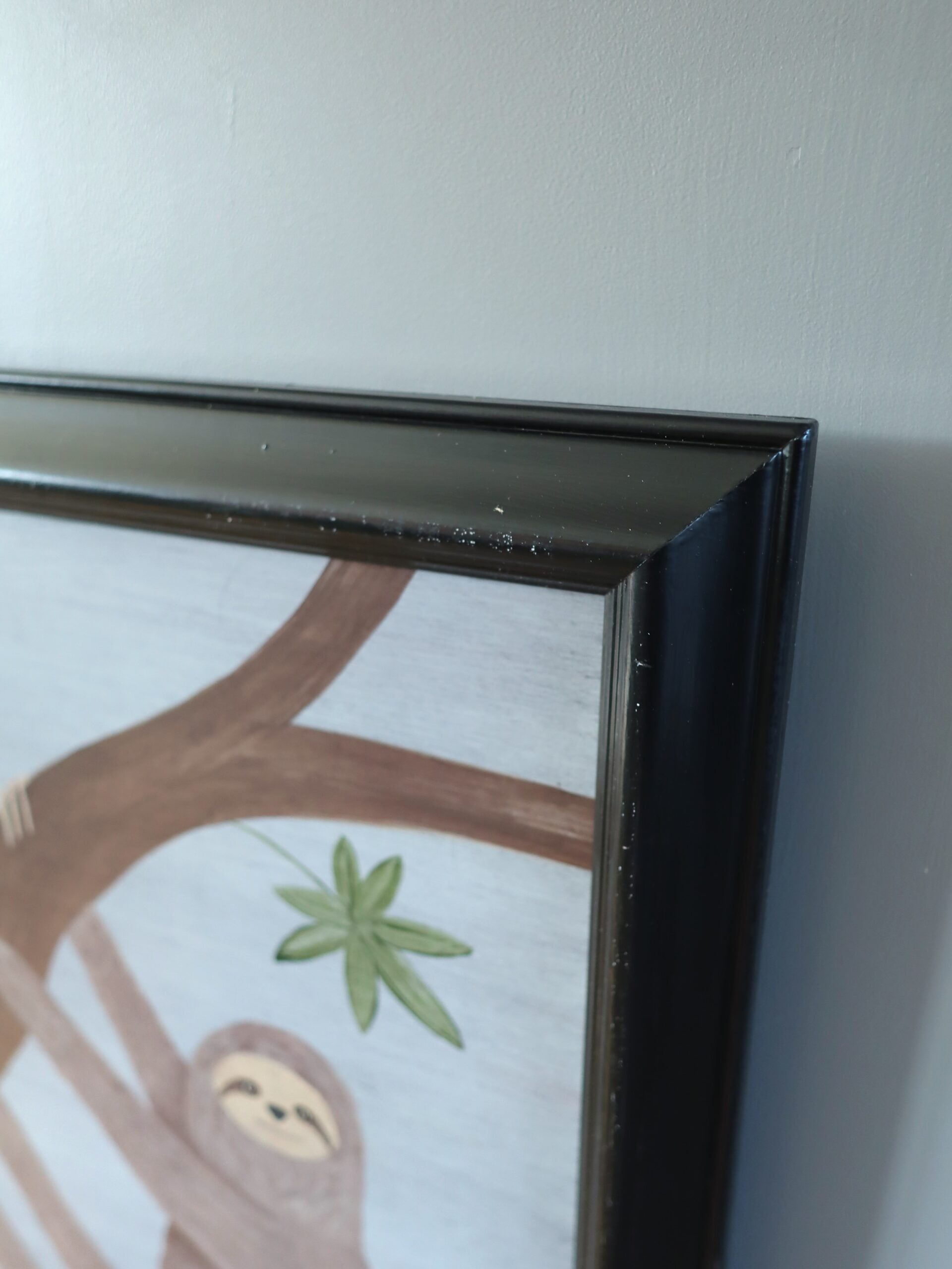 The style is intentionally naïve and pared back, with flattened forms and simplified anatomy that draw on folk art influences. The sloth’s softly expressive face adds warmth and approachability.