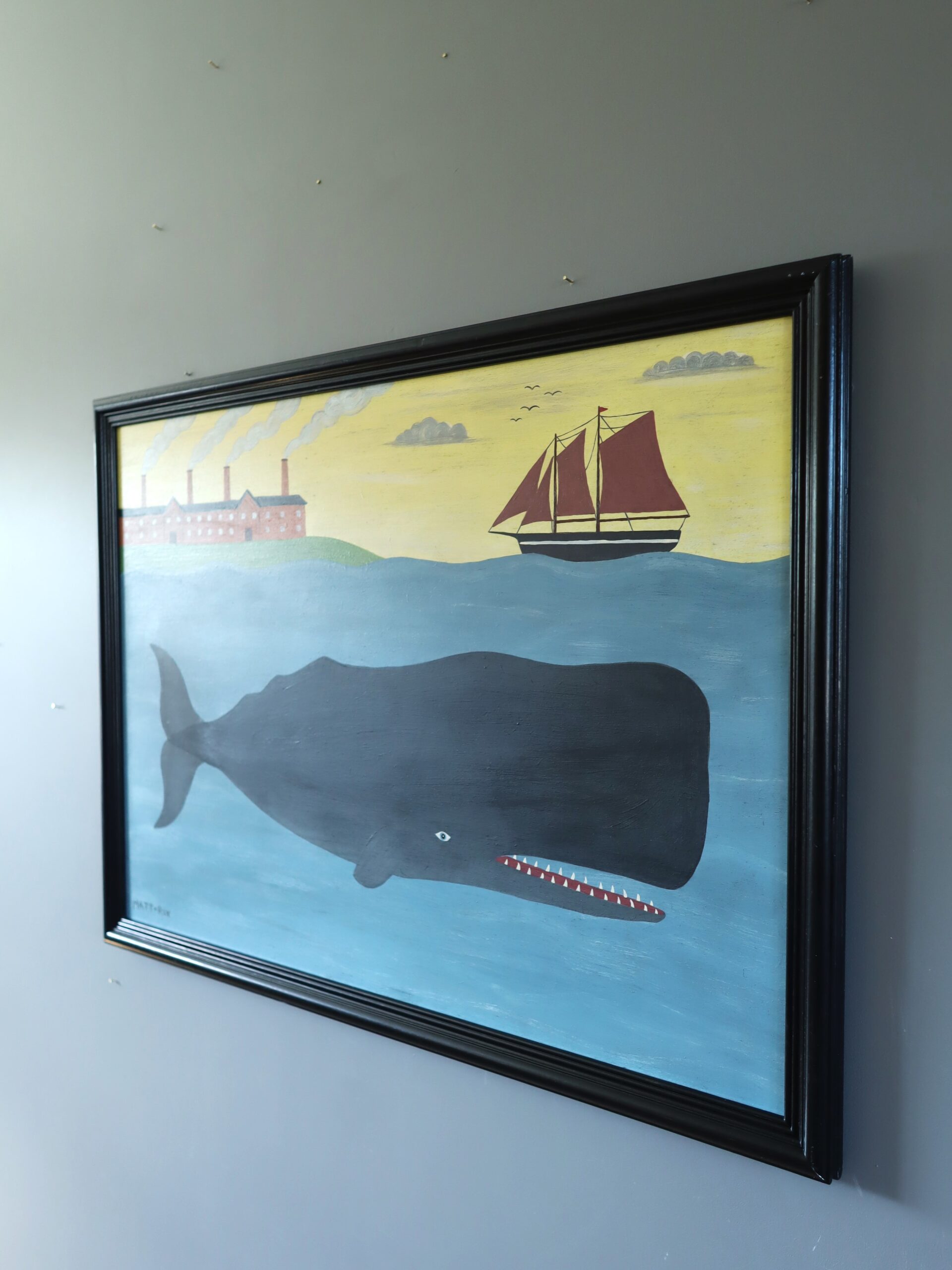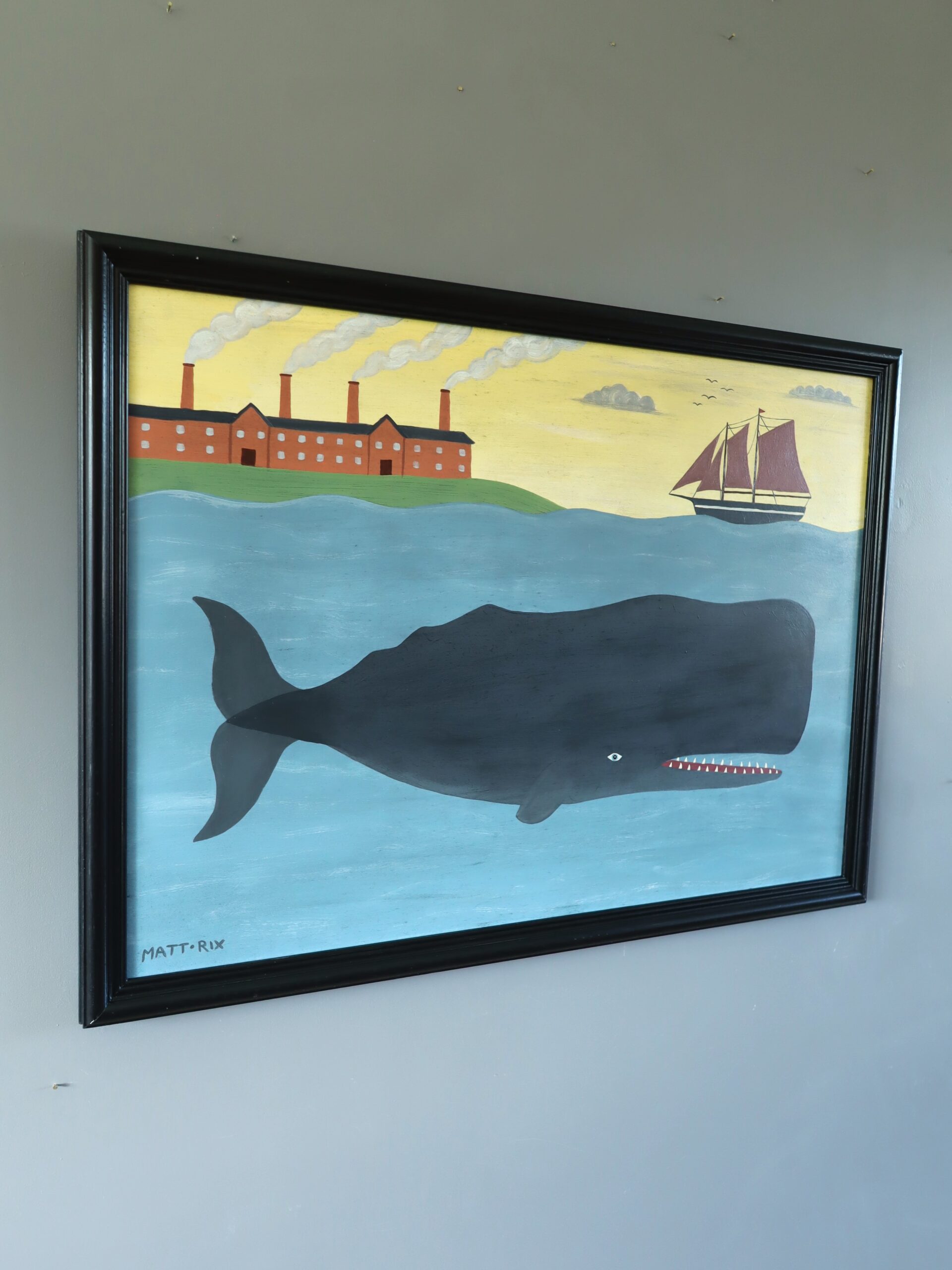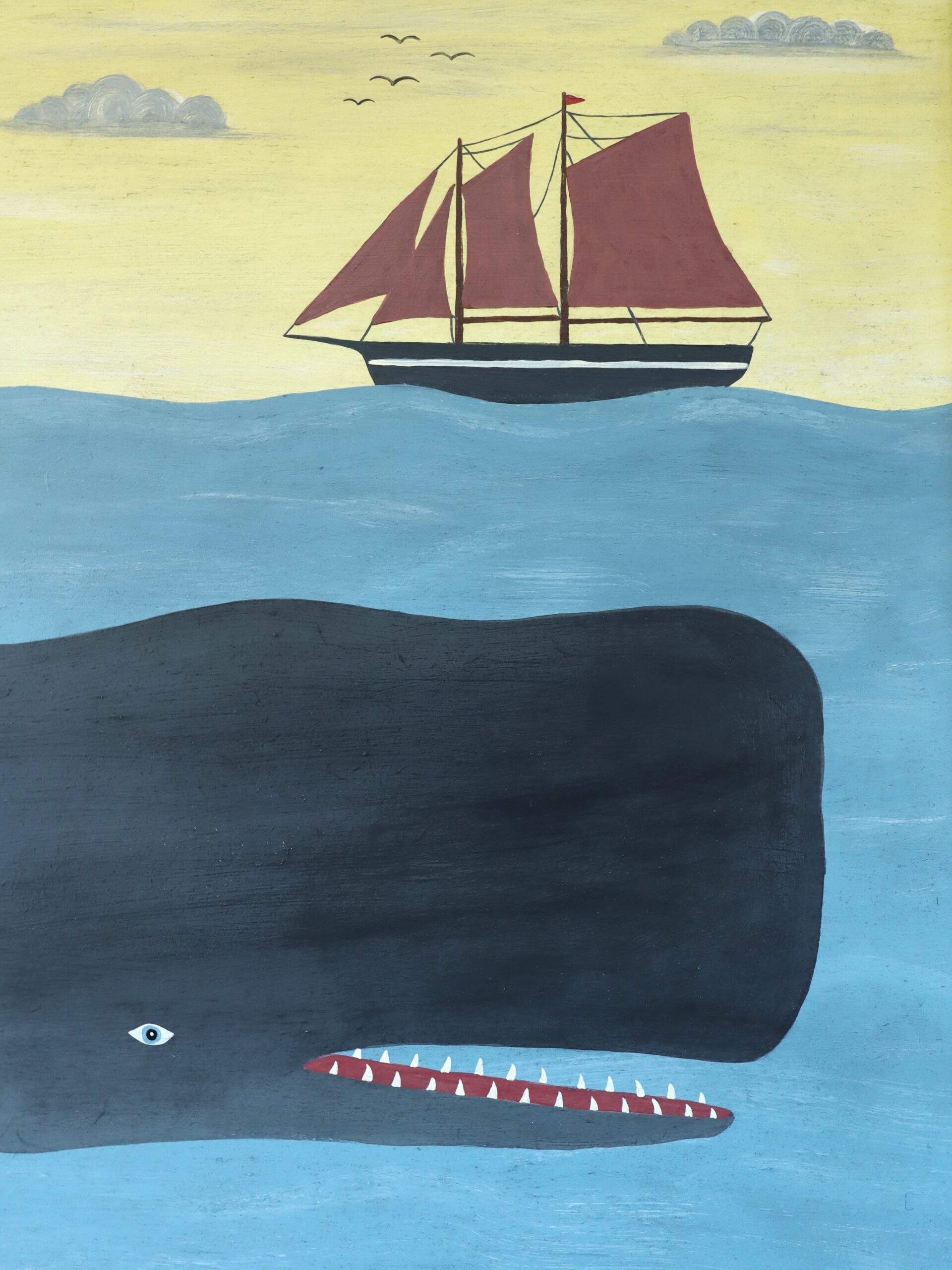 Rendered in a contemporary naïve style, the work embraces flattened perspective and bold simplification. Forms are clearly defined and confidently outlined, with exaggerated scale lending the whale a monumental presence. Spatial depth is conveyed through horizontal bands of water, land and sky rather than traditional modelling, enhancing the painting’s graphic clarity and storytelling charm.