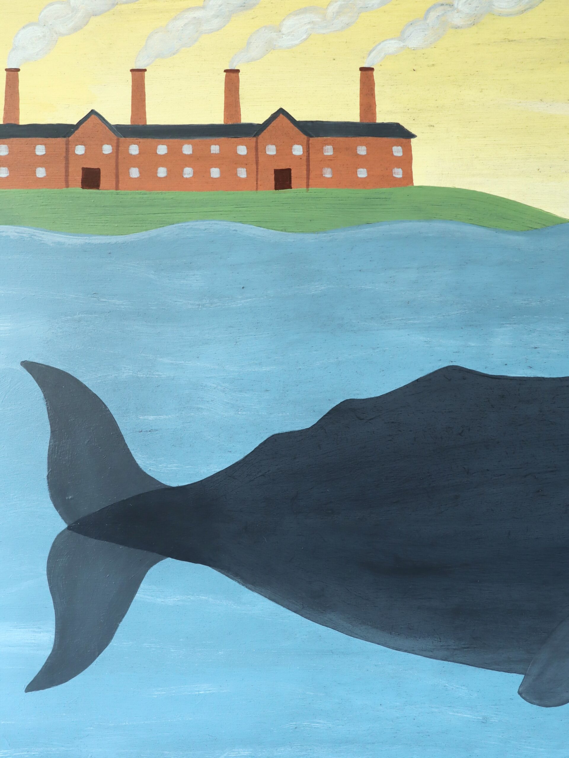 The composition presents a vast sperm whale moving steadily through calm blue waters, its immense dark form dominating the lower half of the painting. Above the surface, a shoreline unfolds: a row of red-brick factory buildings with tall smoking chimneys stretches along a green embankment, while a schooner glides quietly across the horizon beneath a warm yellow sky.