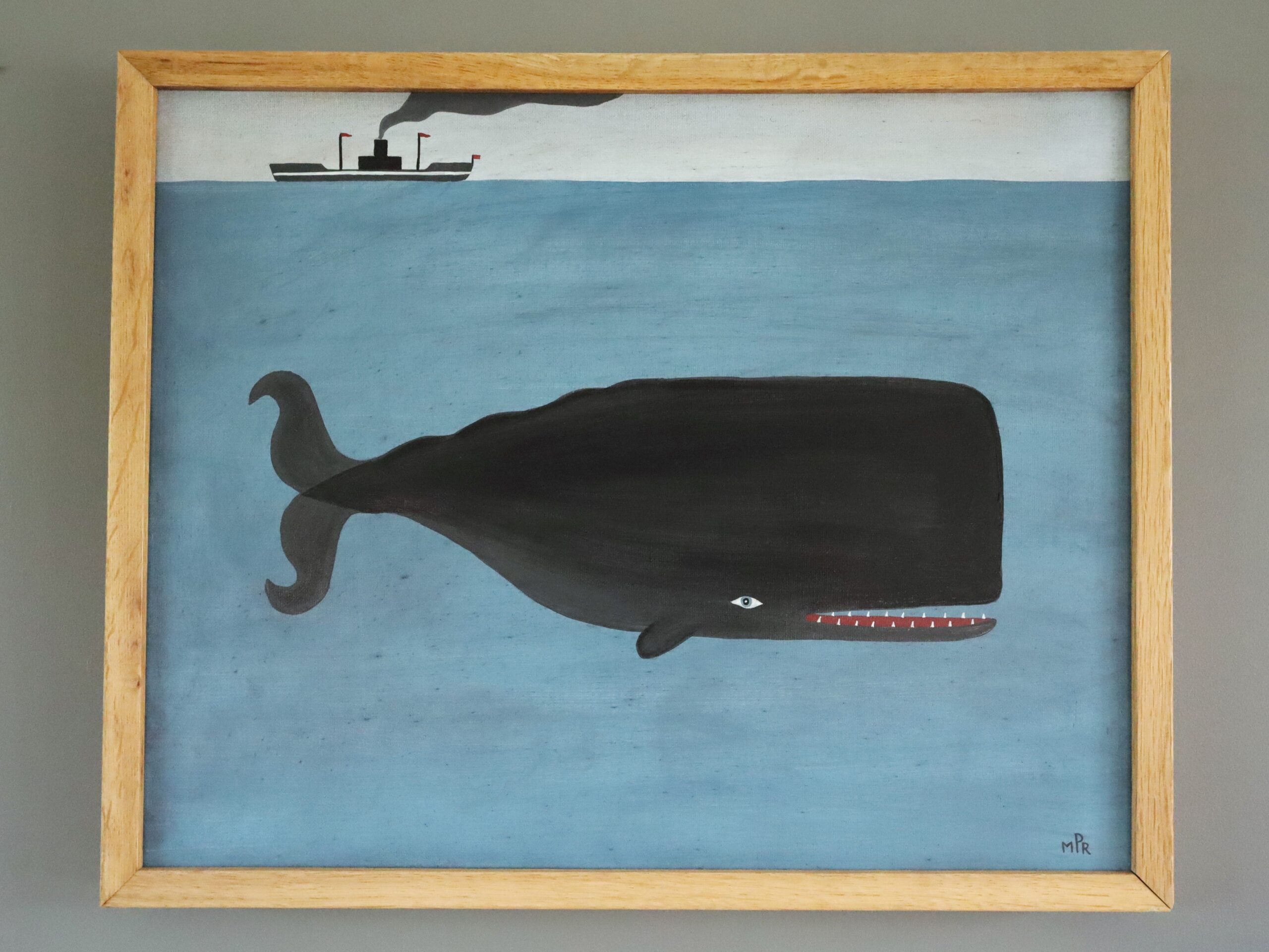 This painting depicts a stylised sperm whale swimming through calm blue waters, with a black steamboat emitting dark smoke on the horizon. The whale is painted in a naïve folk art style, with exaggerated features like a massive rectangular head, curling tail, and a row of sharp, white teeth in a red mouth. The whale’s eye is small, white, and almond-shaped, giving it a slightly humorous, alert expression.