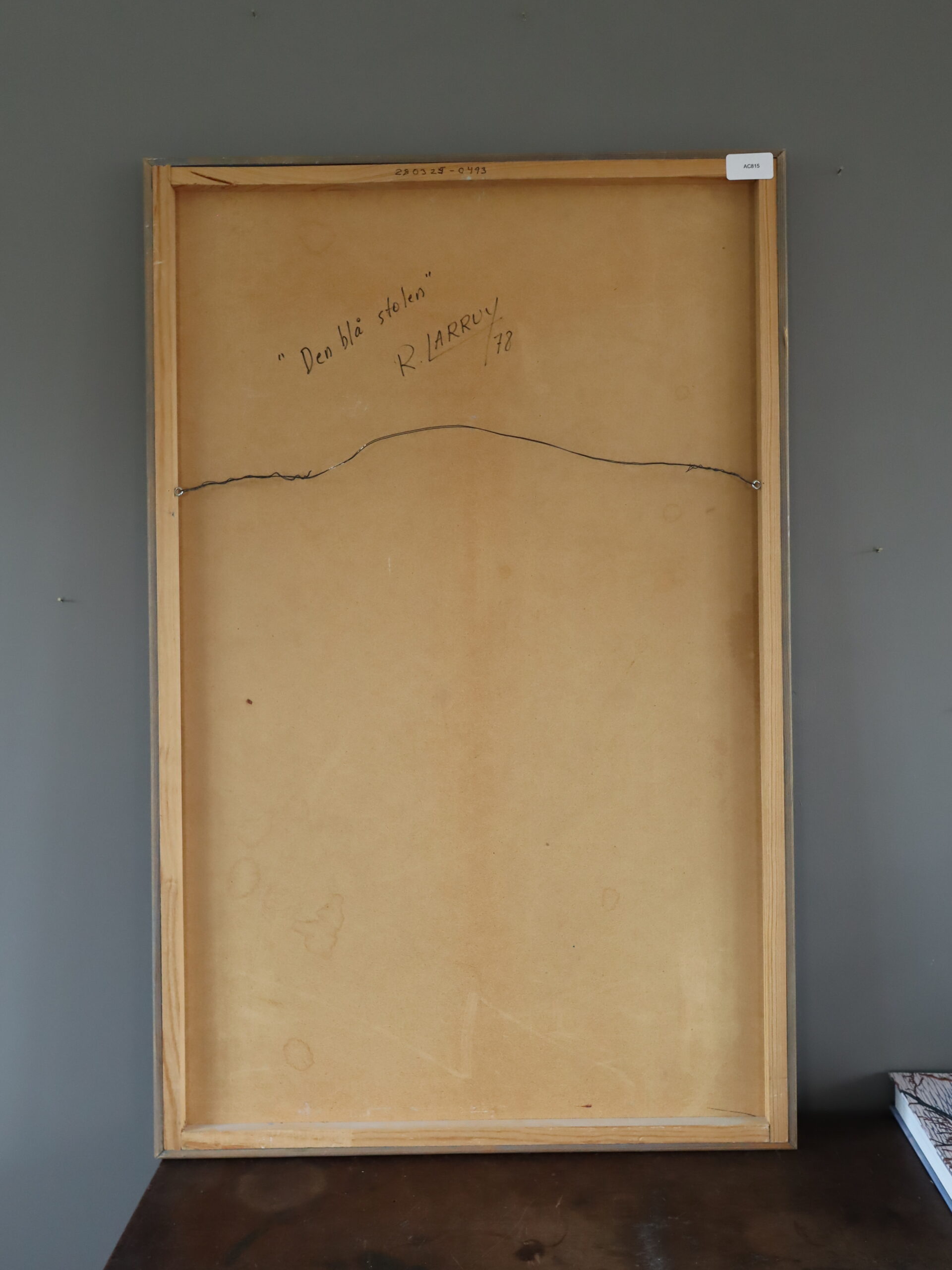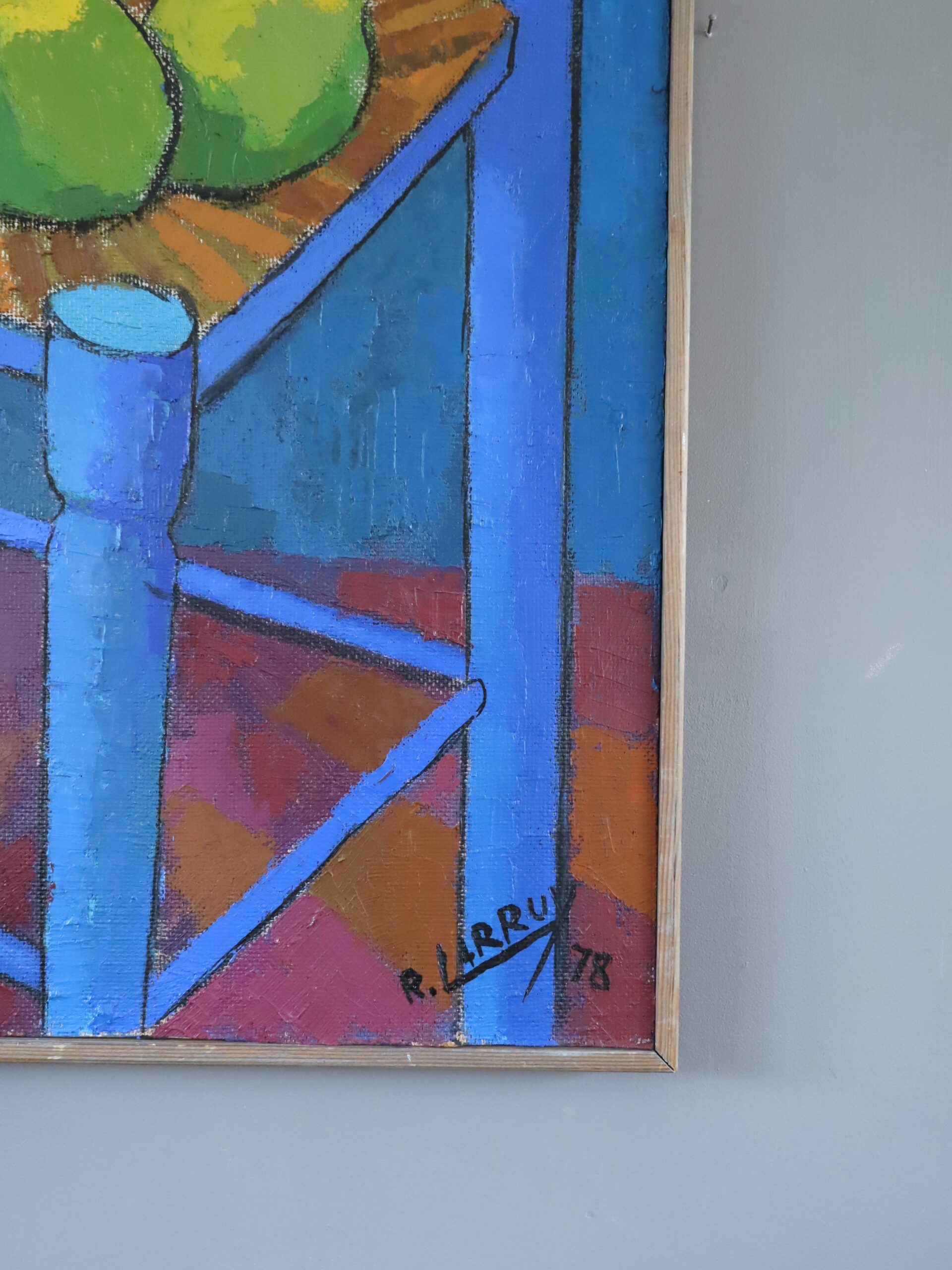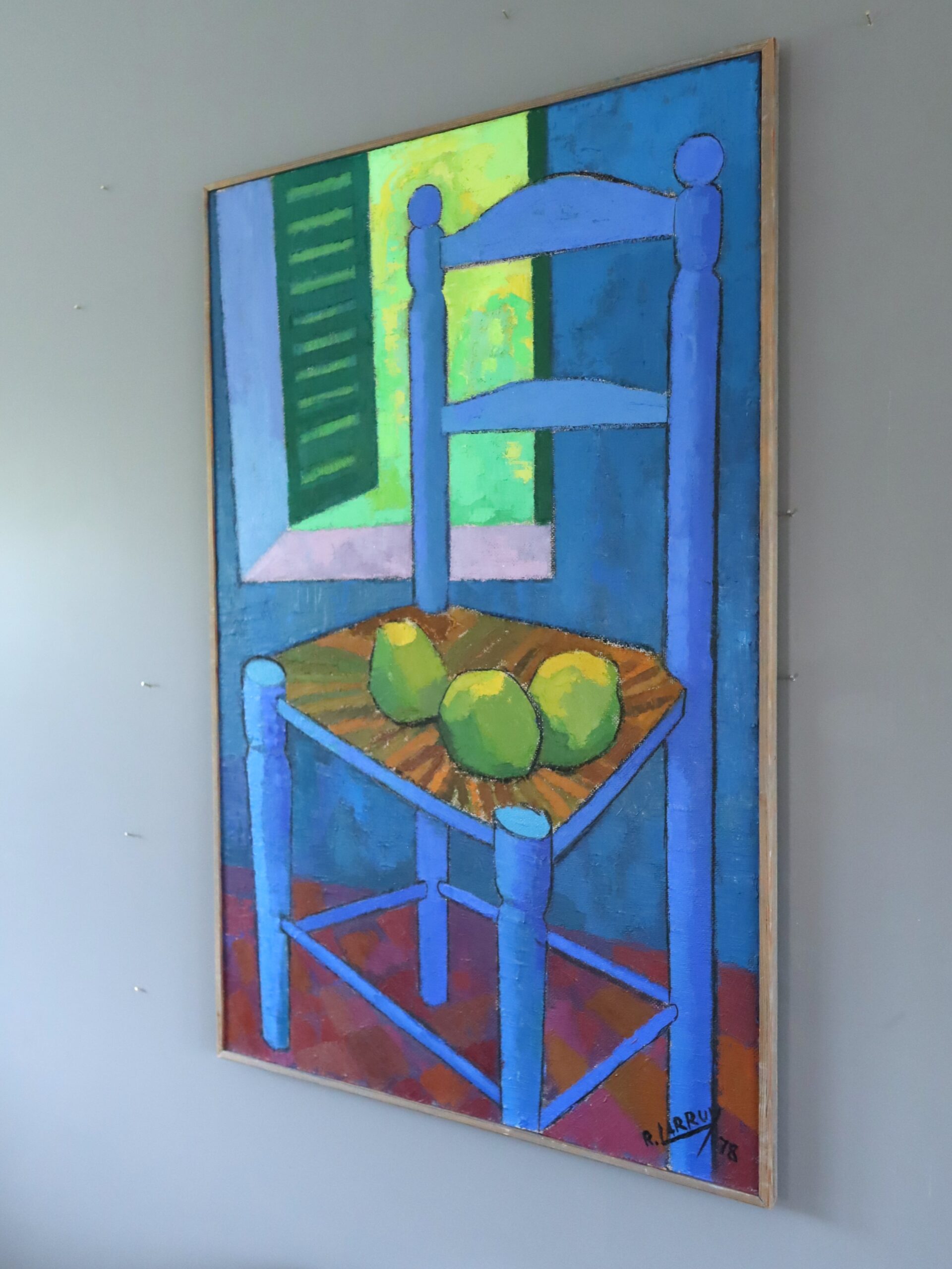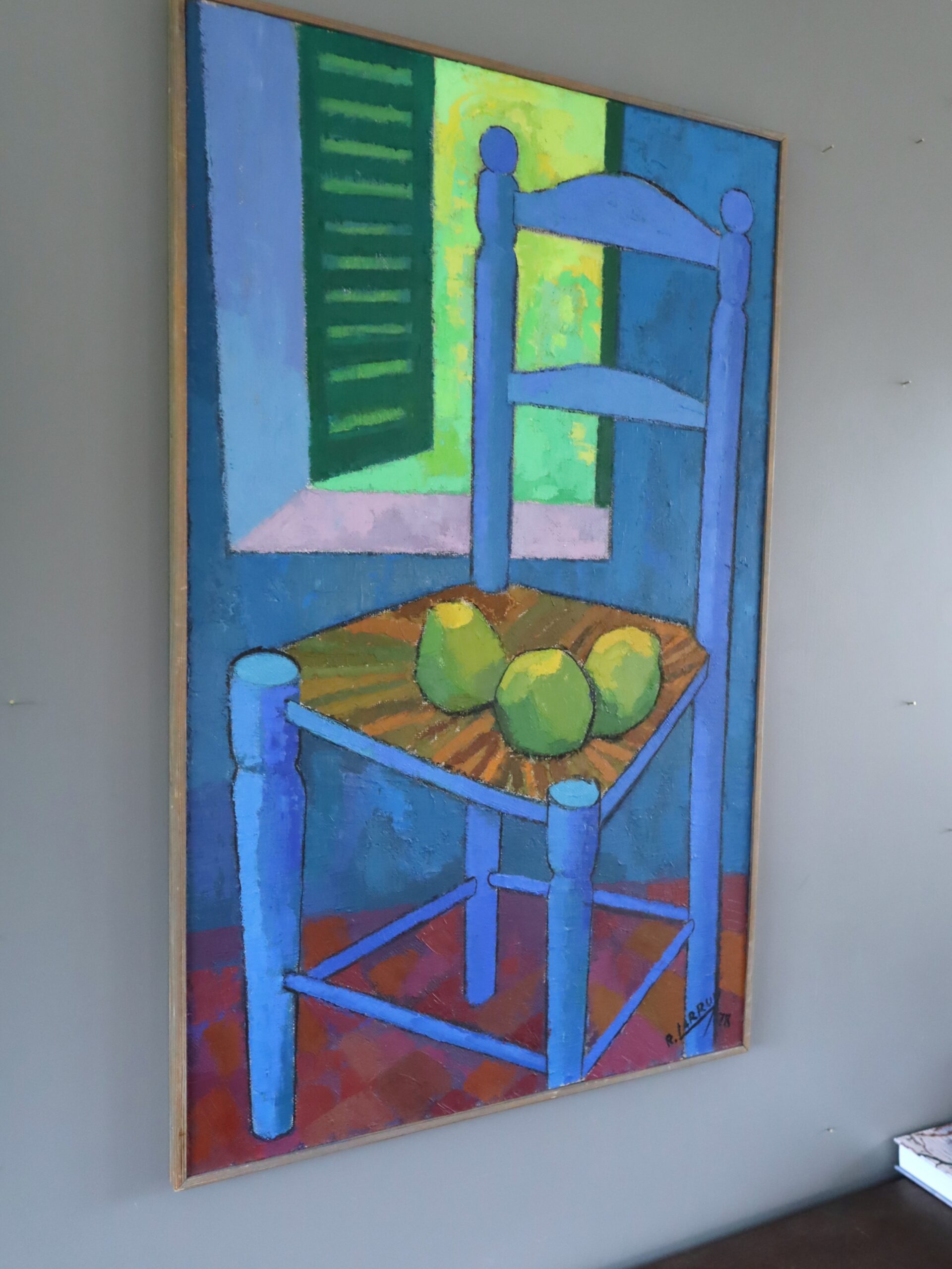 A striking still life composition that centres on a blue wooden chair rendered with bold clarity, its angular structure anchoring the scene, and executed in oil onto board and dated 1978.