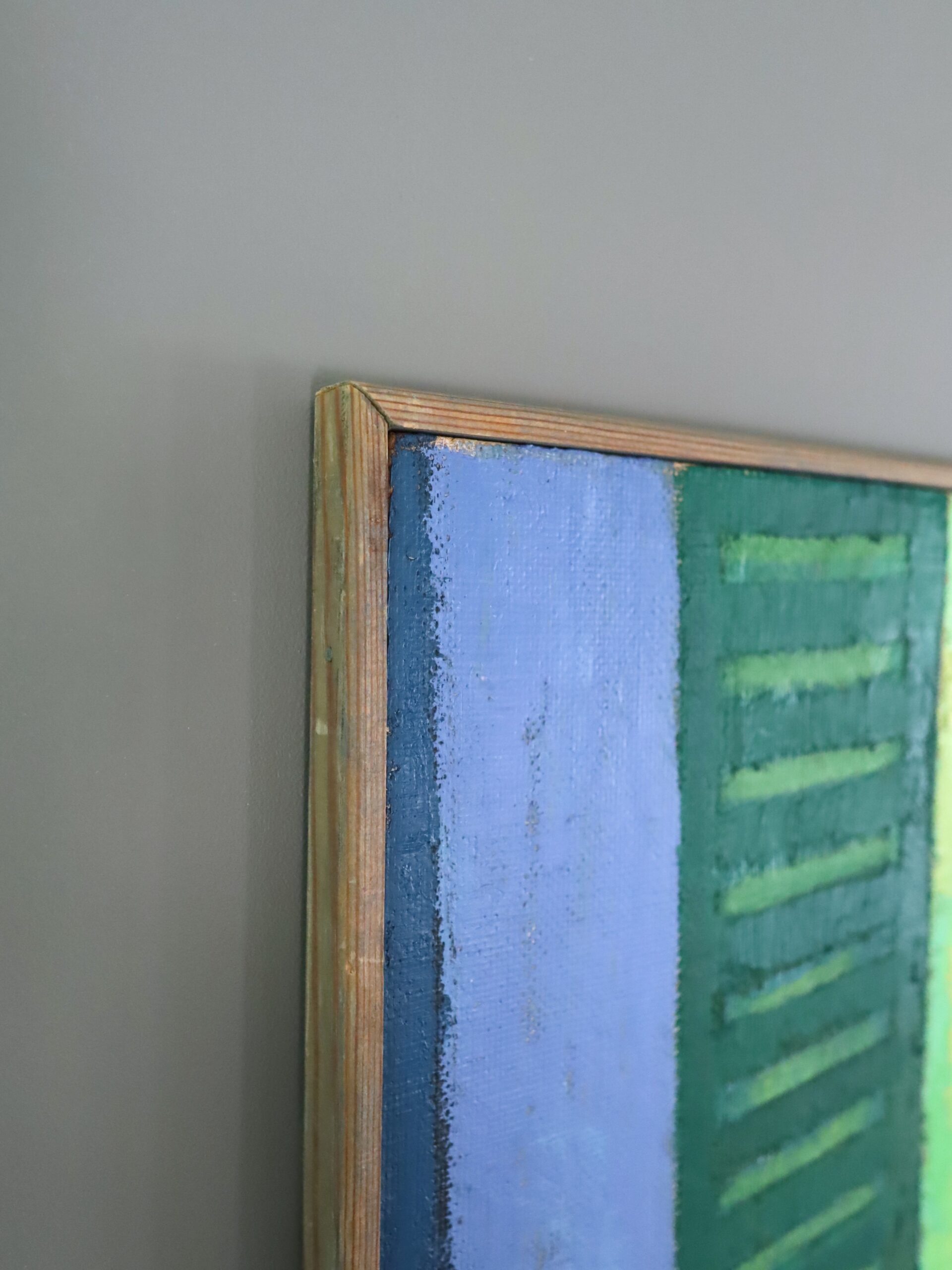 Executed in a modernist style, the painting embraces simplified forms and strong outlines. Perspective is intentionally flattened, lending the composition a decorative, almost architectural quality. The artist prioritises balance and rhythm over realism, allowing shapes and colour blocks to guide the eye.