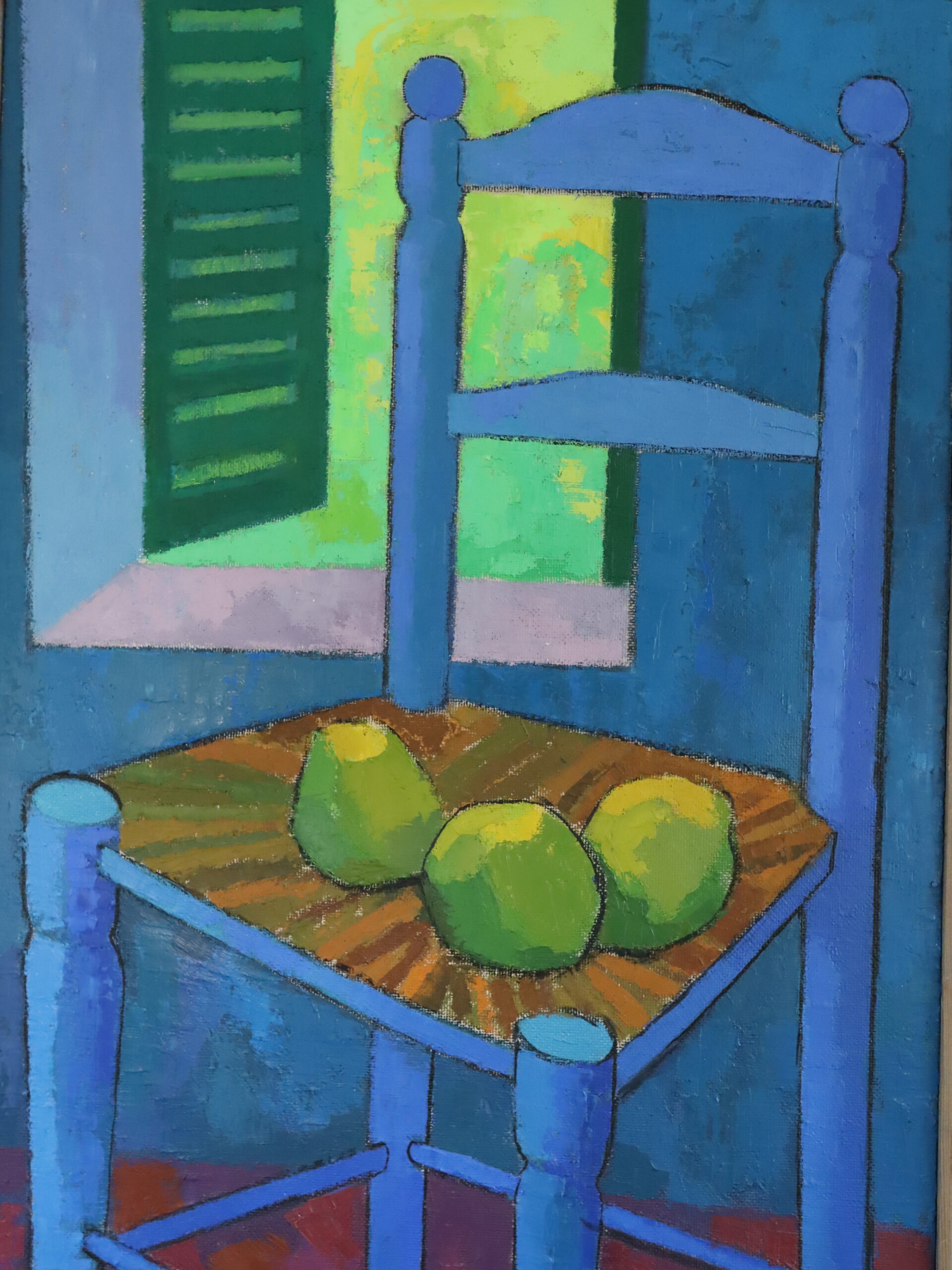 Resting on the seat are three rounded green fruits, their placement both casual and deliberate. Behind, a partially opened window shutter introduces a sense of space and atmosphere, suggesting filtered daylight entering an otherwise enclosed interior.