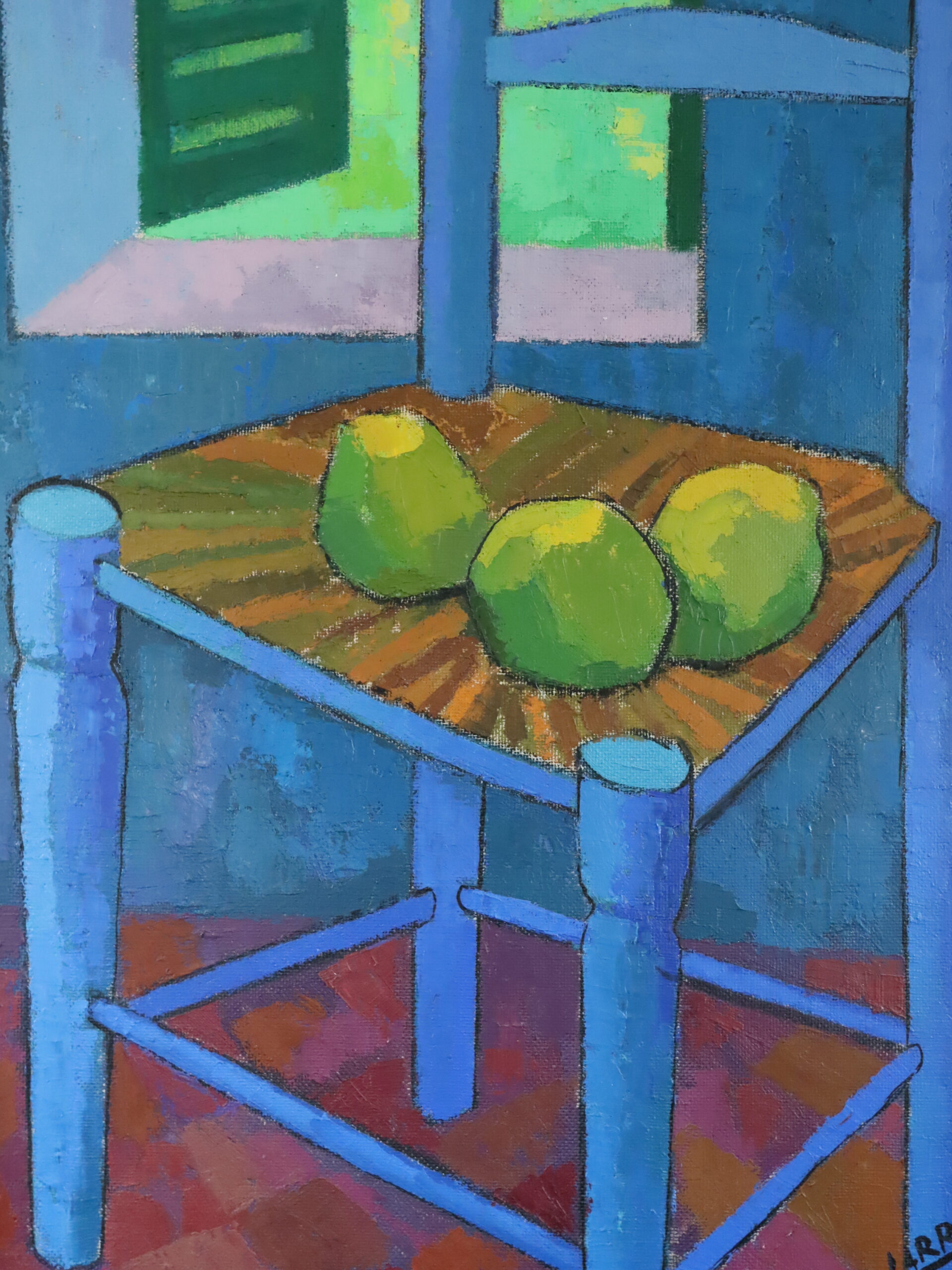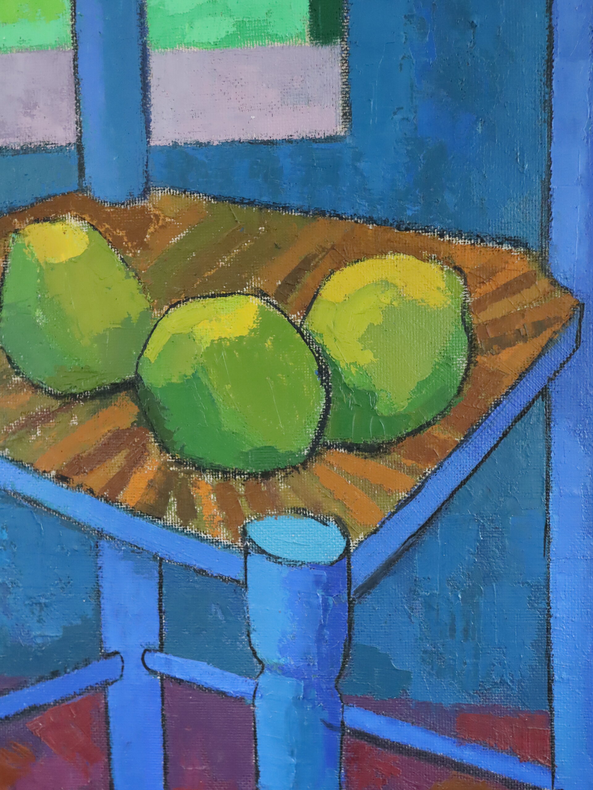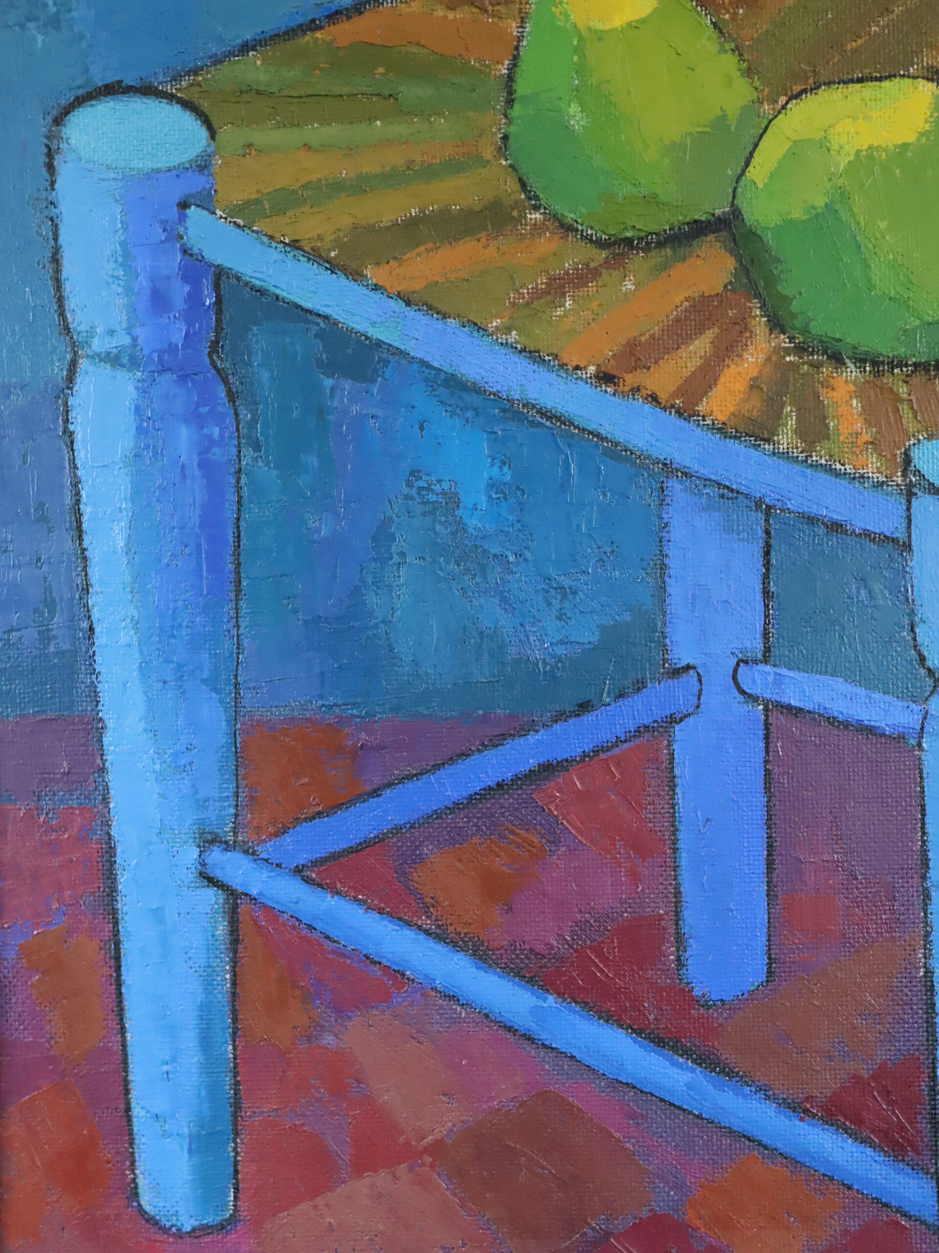 The colour palette is vibrant yet harmonious: dominated by saturated blues that define the chair and surrounding space, contrasted with lively greens and yellow undertones in the fruit and background. Accents of warm terracotta and muted mauve in the floor add depth and visual grounding.