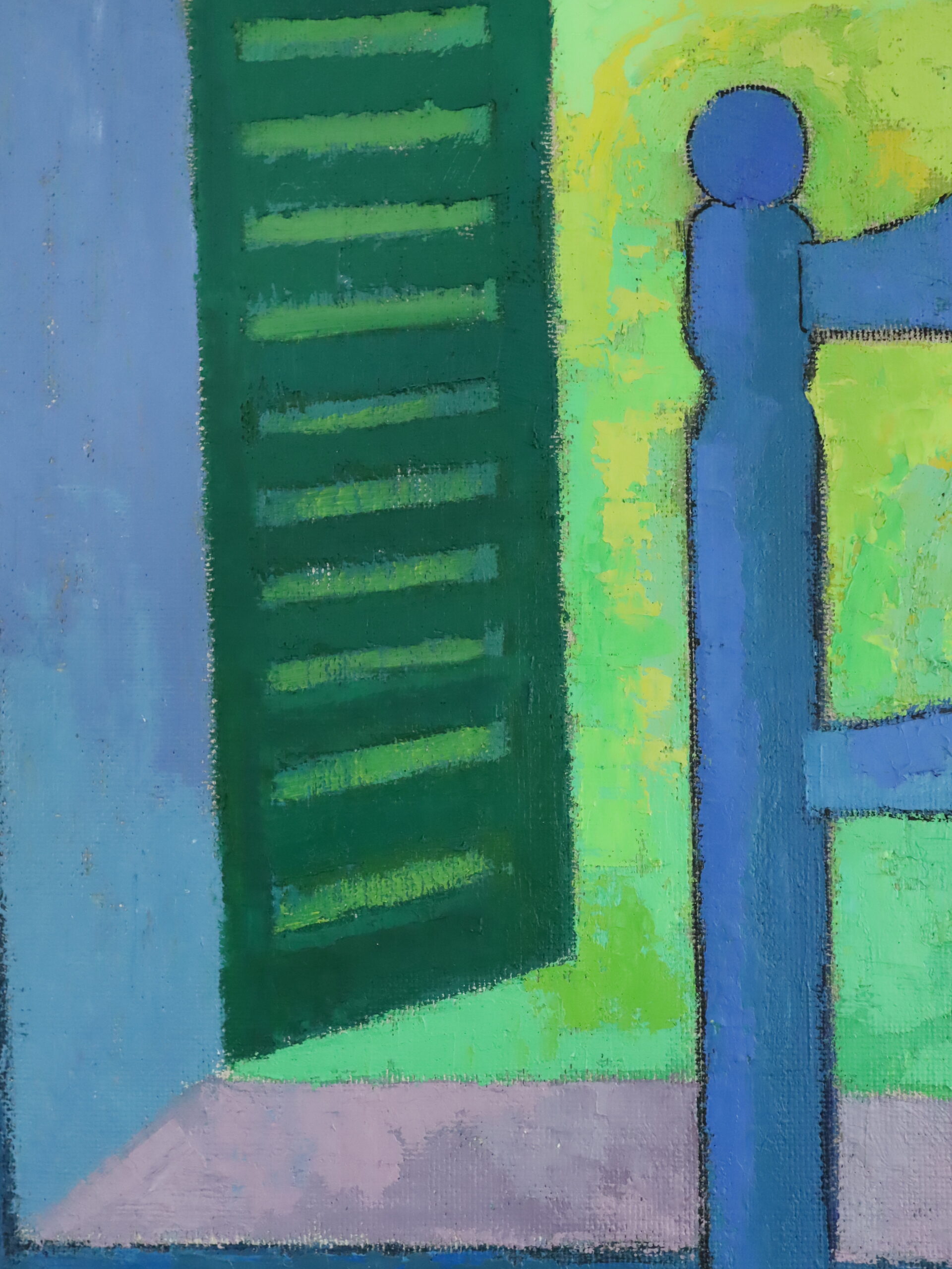 Brushstrokes are confident and expressive, with visible texture throughout. Areas of layered paint and subtle tonal variation give the surface a tactile quality, while darker outlines enhance definition and structure. The result is a composition that feels both playful and composed, capturing a quiet, contemplative interior moment.