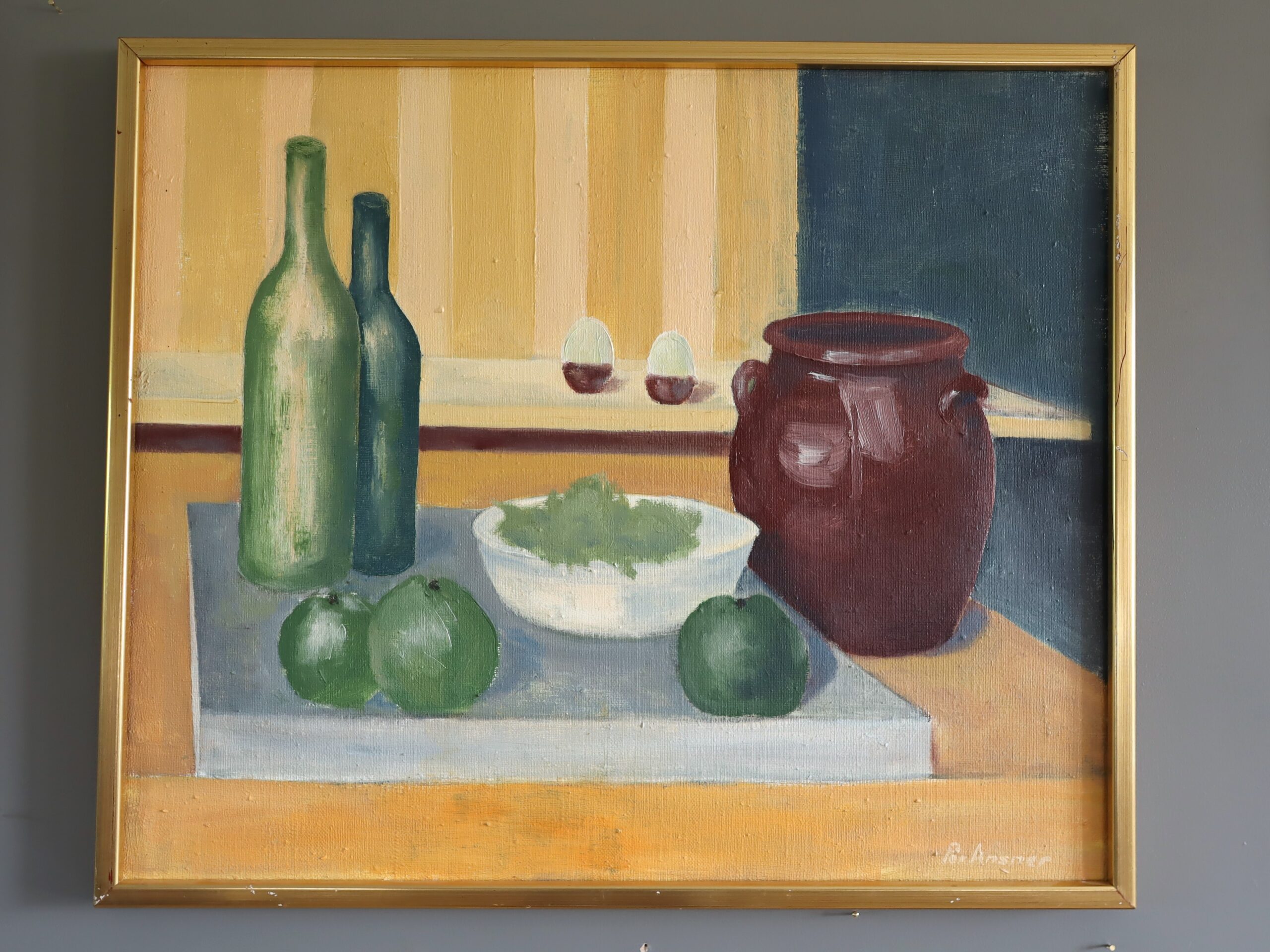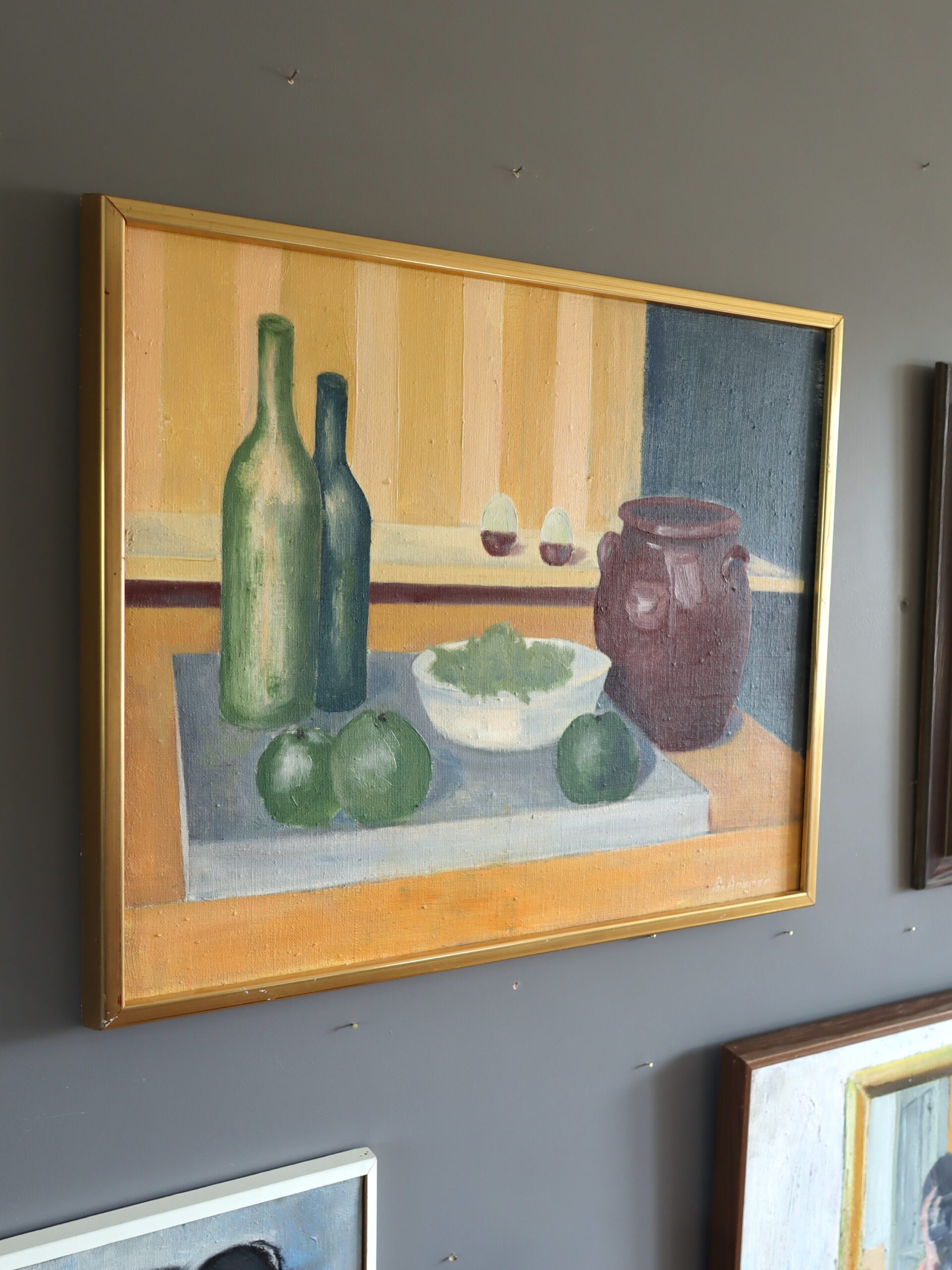 The style is distinctly modernist, marked by flattened forms, strong outlines, and a harmonious structure. The artist has reduced everyday objects to simplified, almost architectural shapes – echoing the mid-century preoccupation with abstraction and clarity of form.