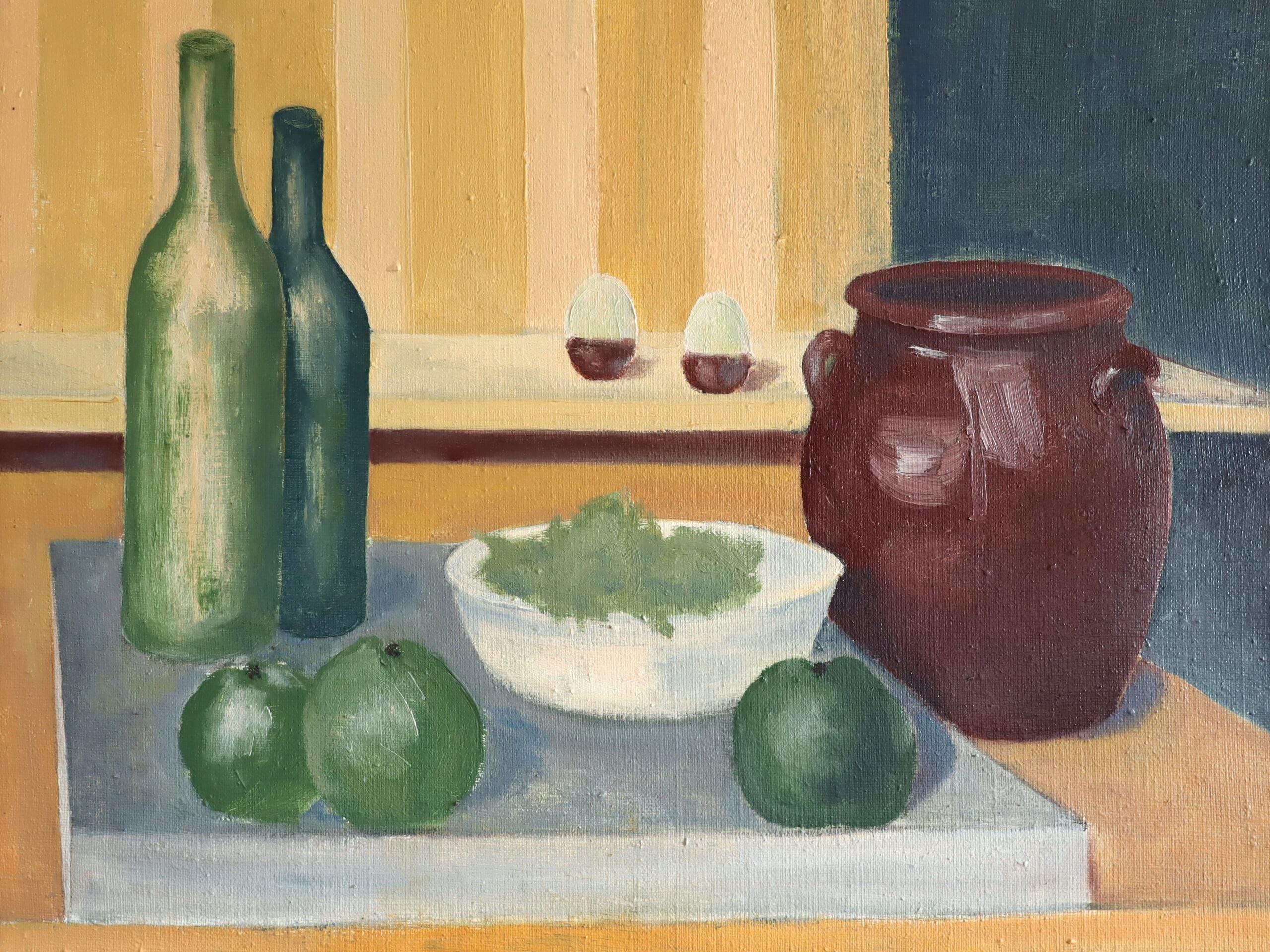 A charming modernist still life painting that captures a domestic tabletop scene with pared-down elegance and geometric order, executed in oil onto canvas.