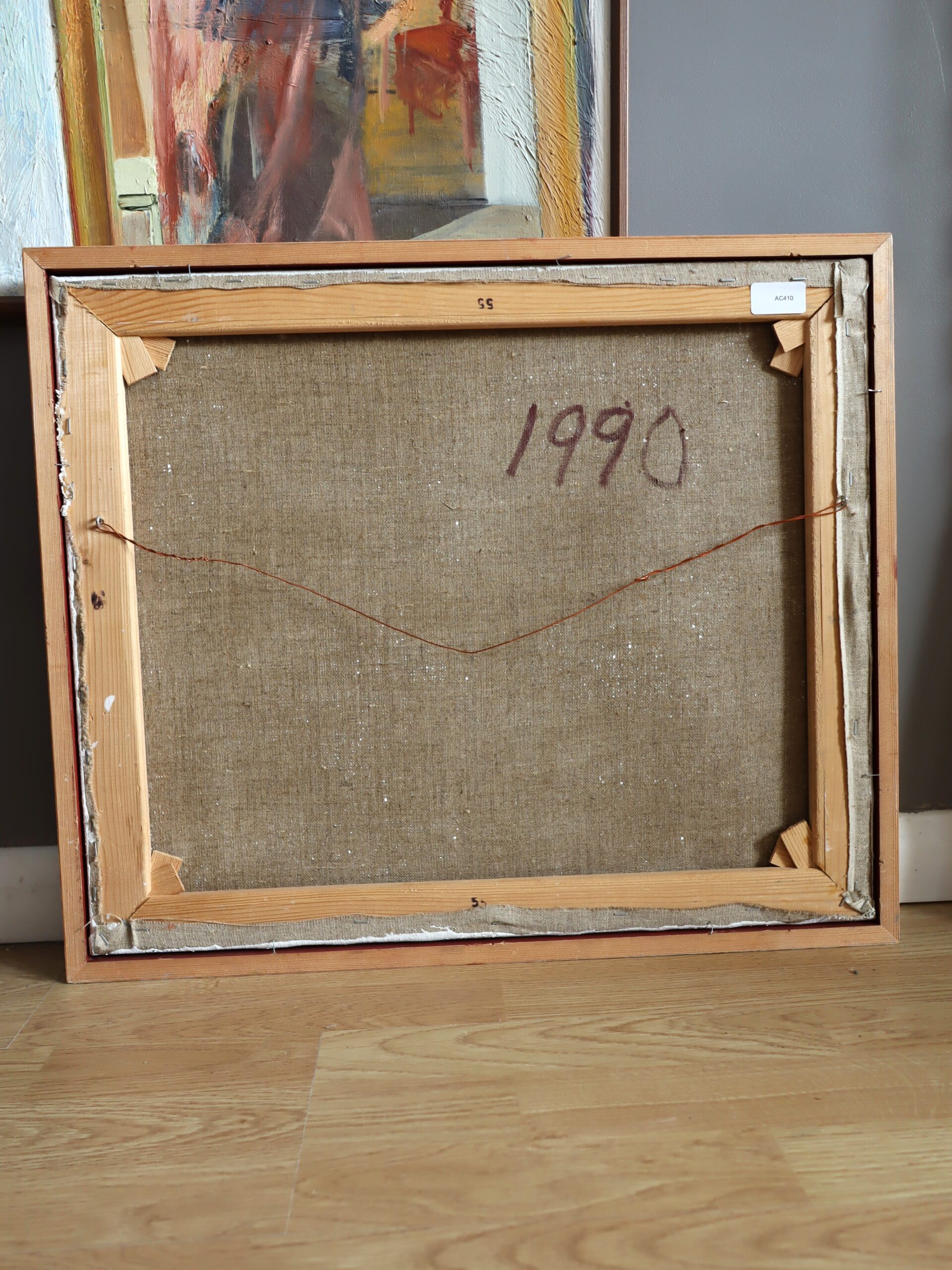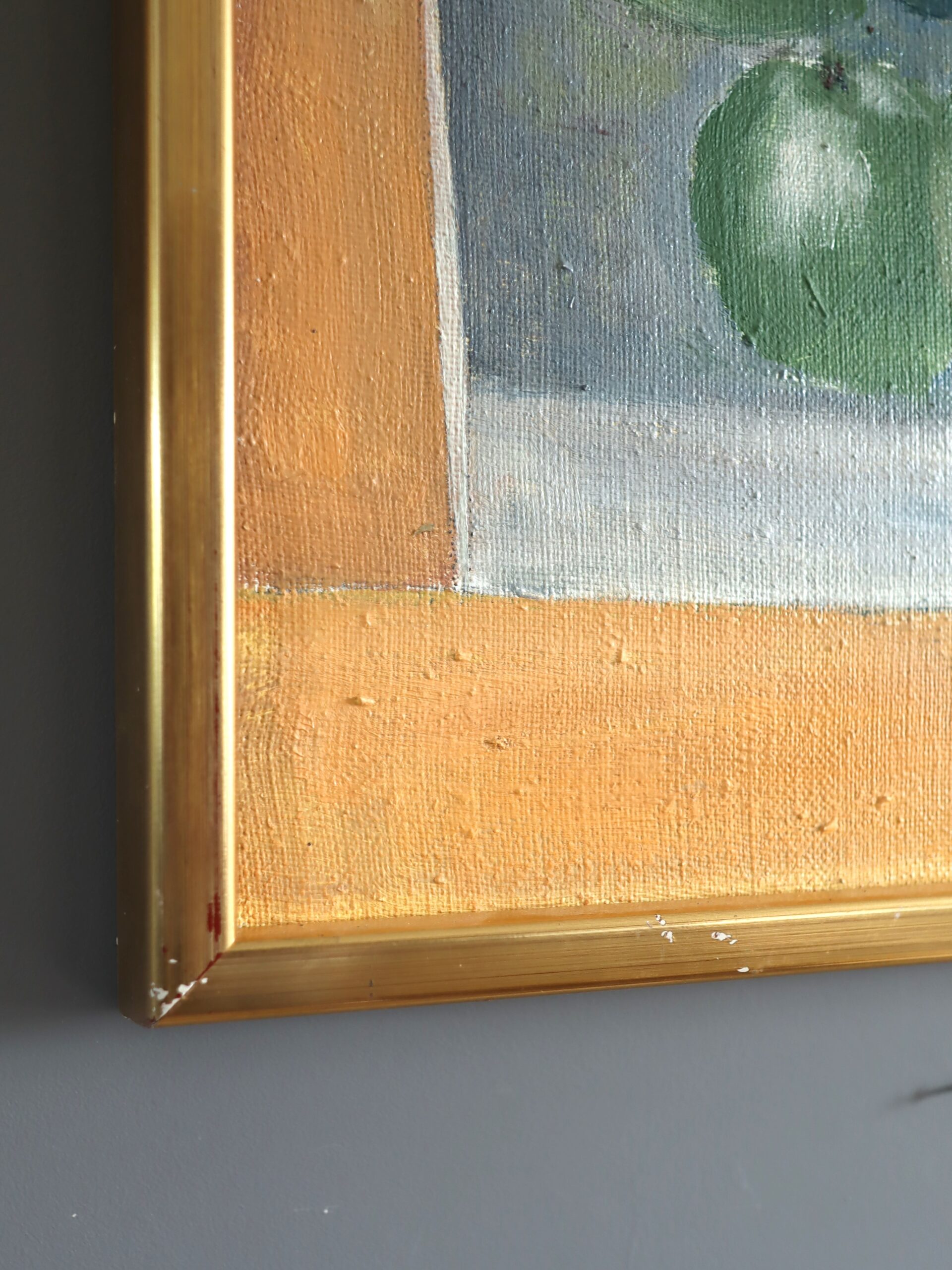 This oil on canvas is housed in a complementary gilt frame. The painting is in excellent vintage condition, and the frame has some scuffing.