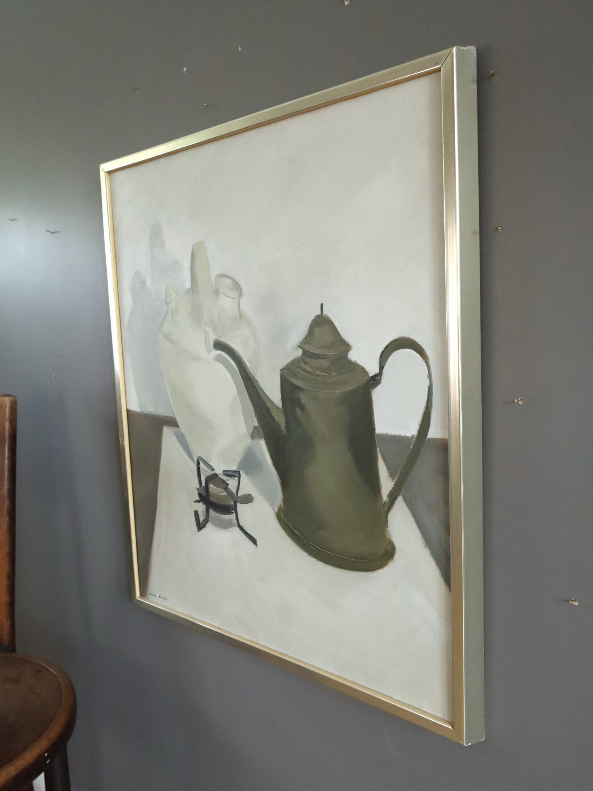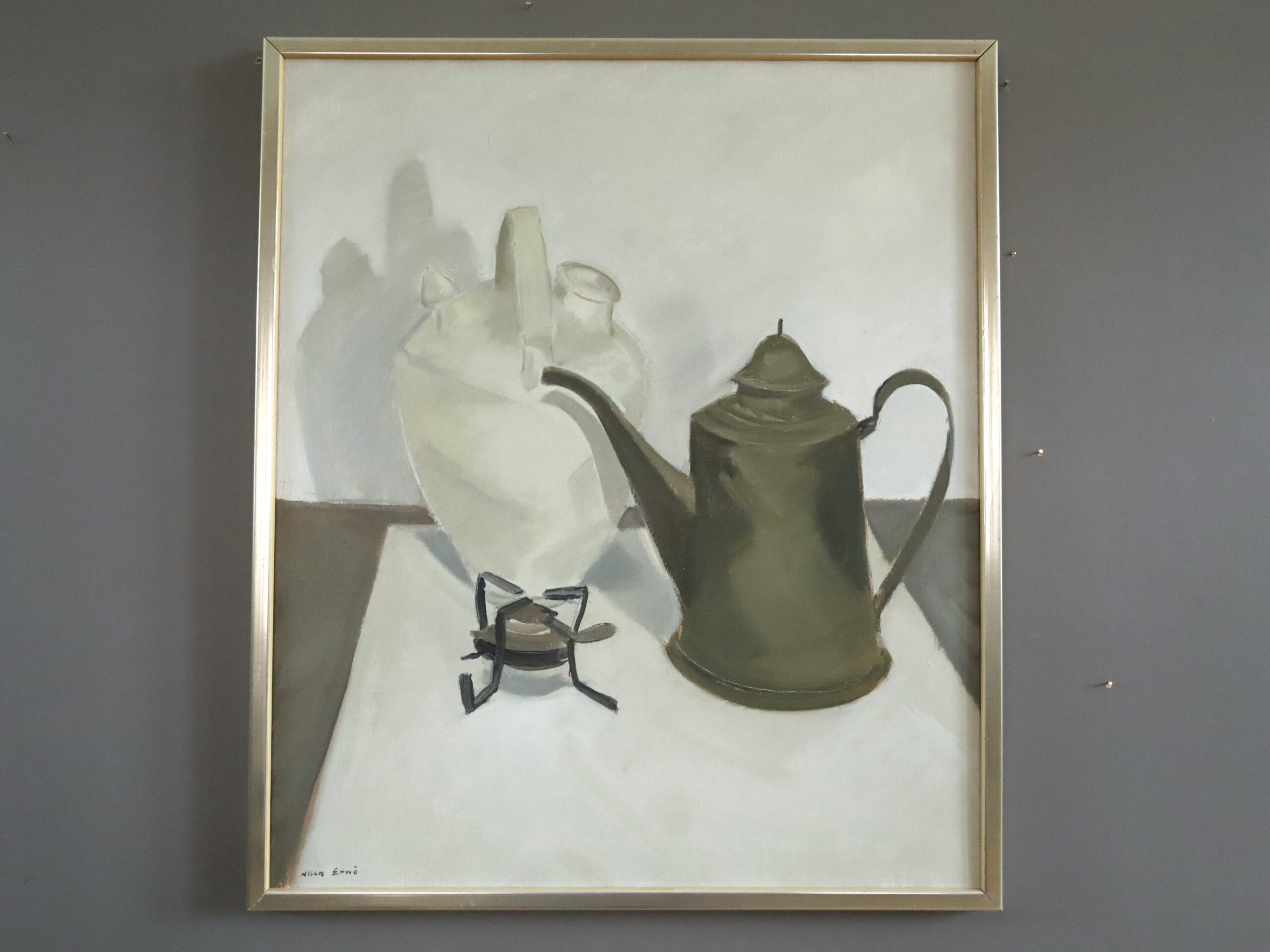 A elegant mid-century still life that captures a quiet, contemplative moment on a tabletop, executed in oil onto canvas.
