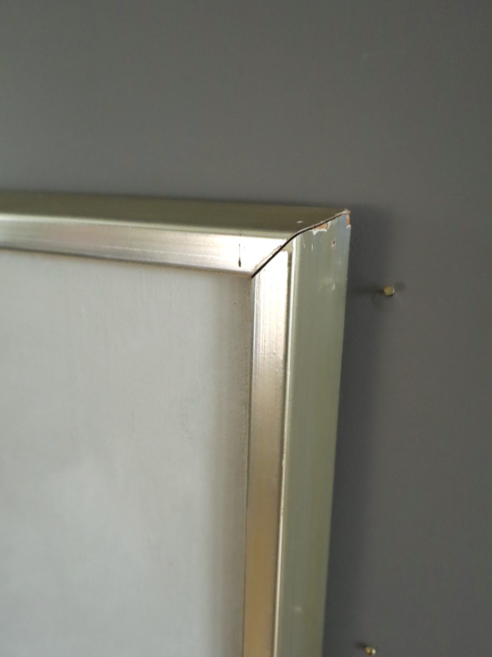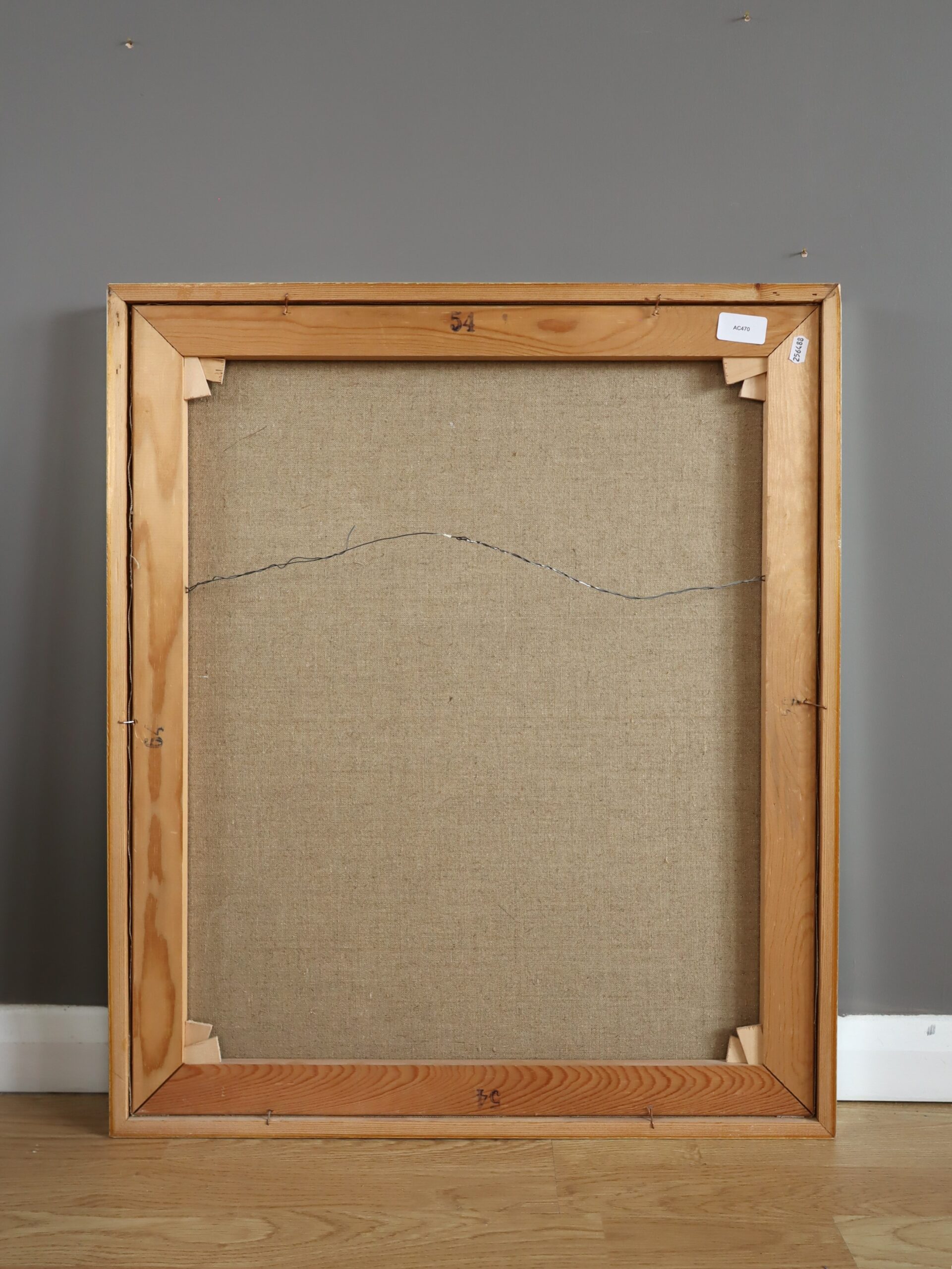 This oil on canvas is housed in a complementary champagne coloured frame. The painting is in very good vintage condition, and the frame shows a small amount of wear and tear to its corners.