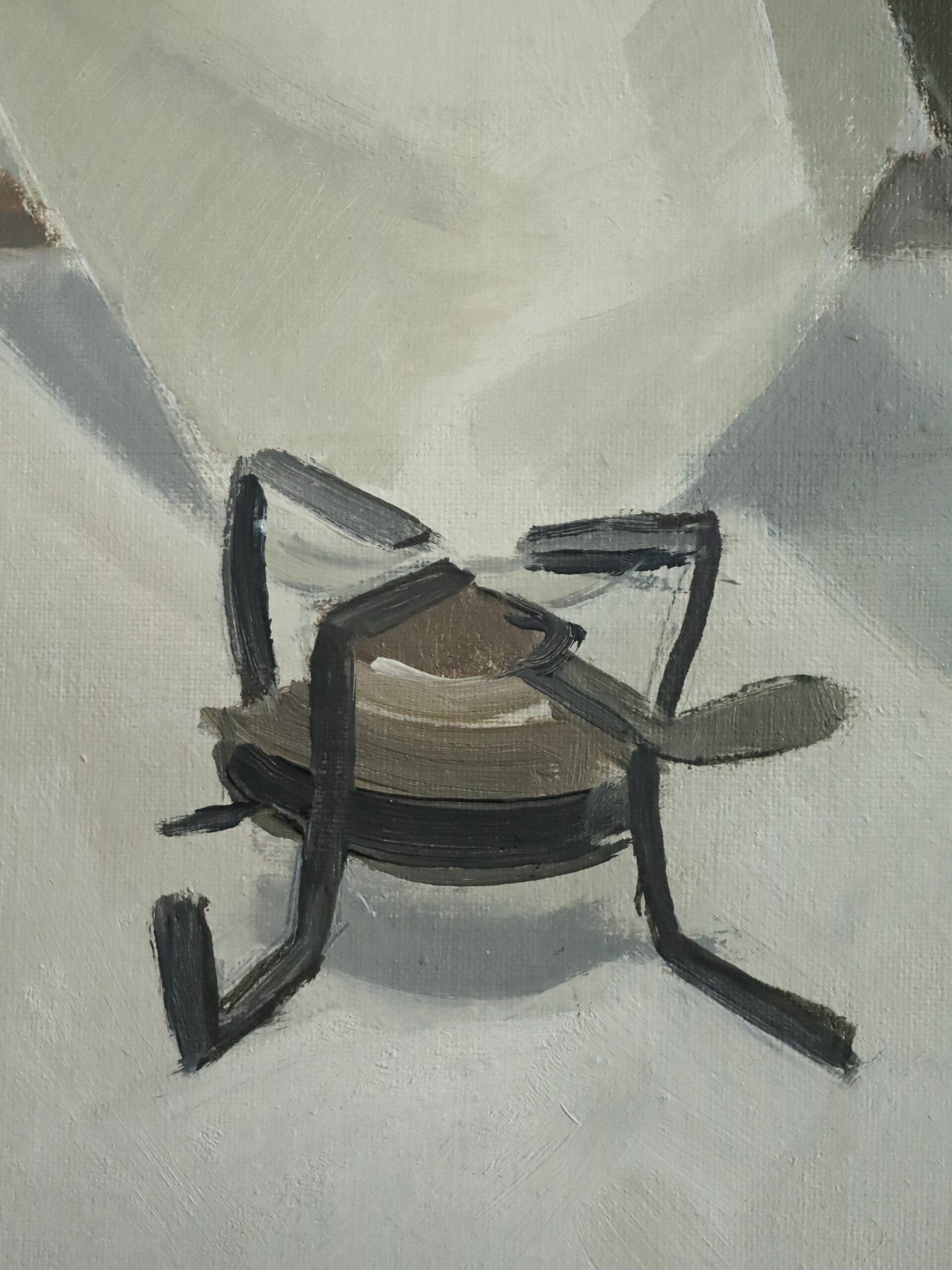 The composition is stark yet harmonious, employing a restrained palette of white, grey, olive, and muted browns. Shadows are deliberately soft, lending a hazy atmosphere to the work. The artist has used flat, confident brushstrokes with little visible texture, reflecting the mid-century tendency toward formal simplicity and abstraction of form.