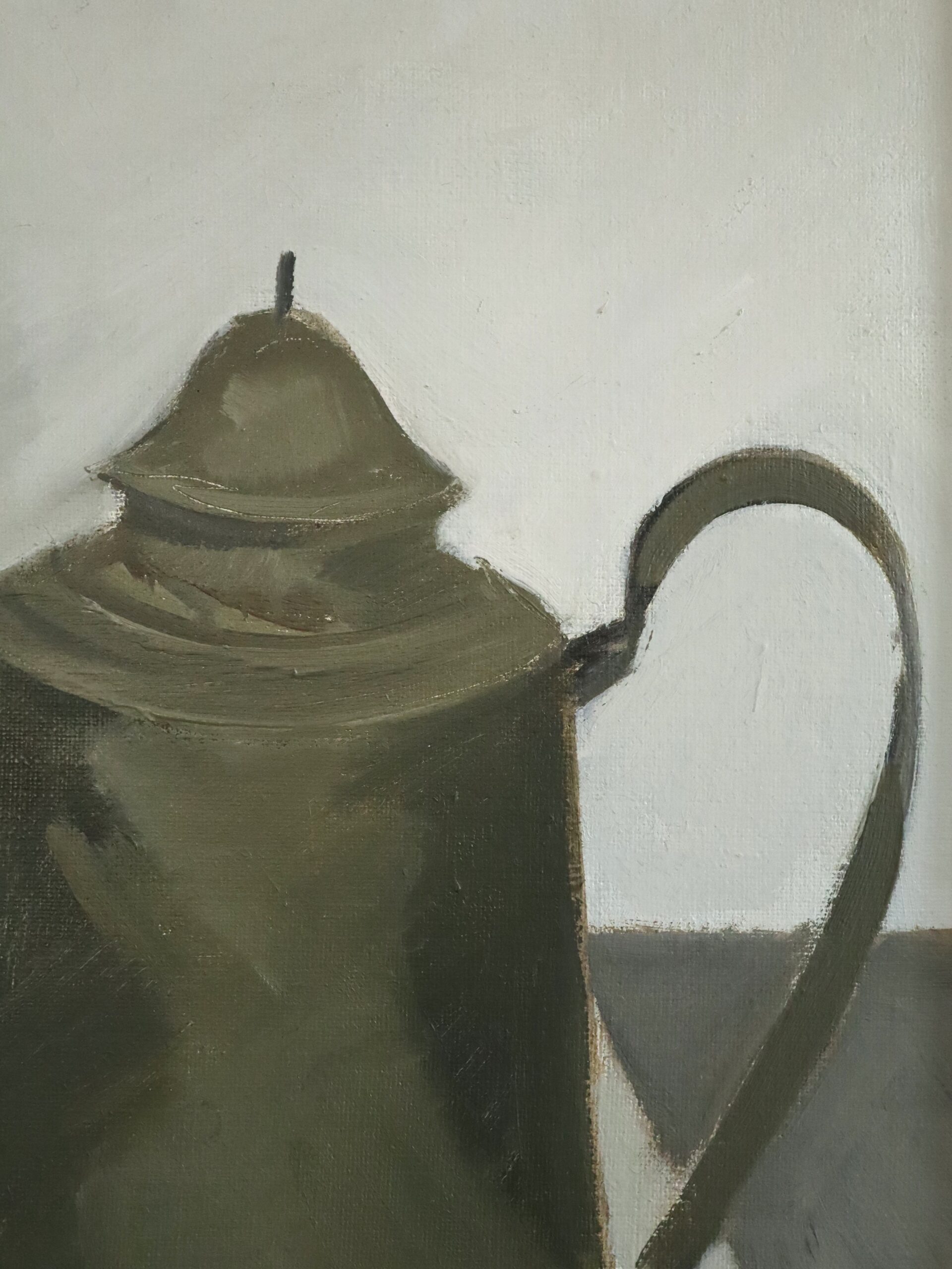 At its center is a dark olive-green kettle rendered with simplified, almost sculptural clarity, placed beside a softly outlined white ceramic vessel that recedes into a muted grey backdrop. In the foreground, a minimalist black stove ring adds a utilitarian contrast to the domestic serenity of the scene.