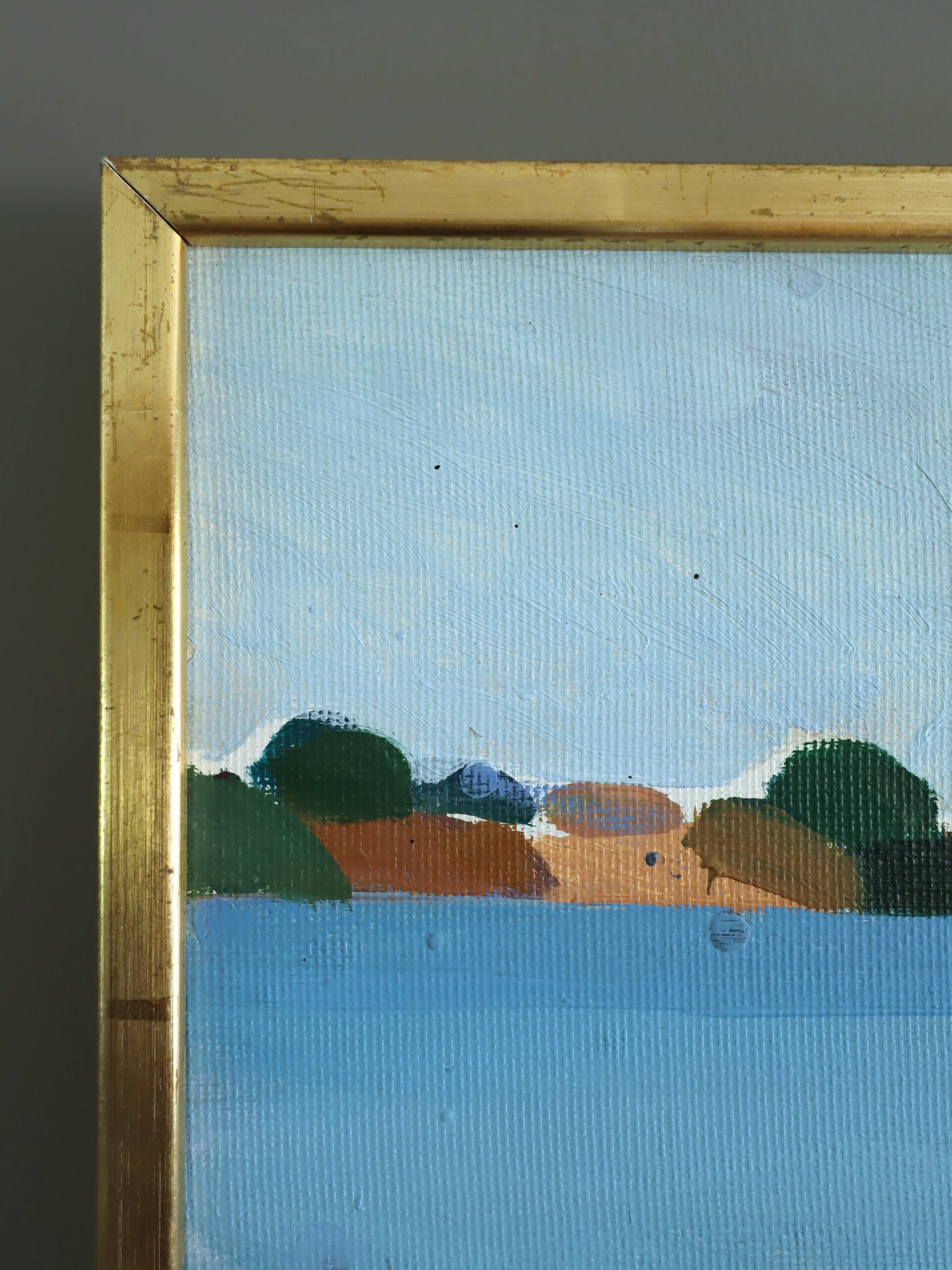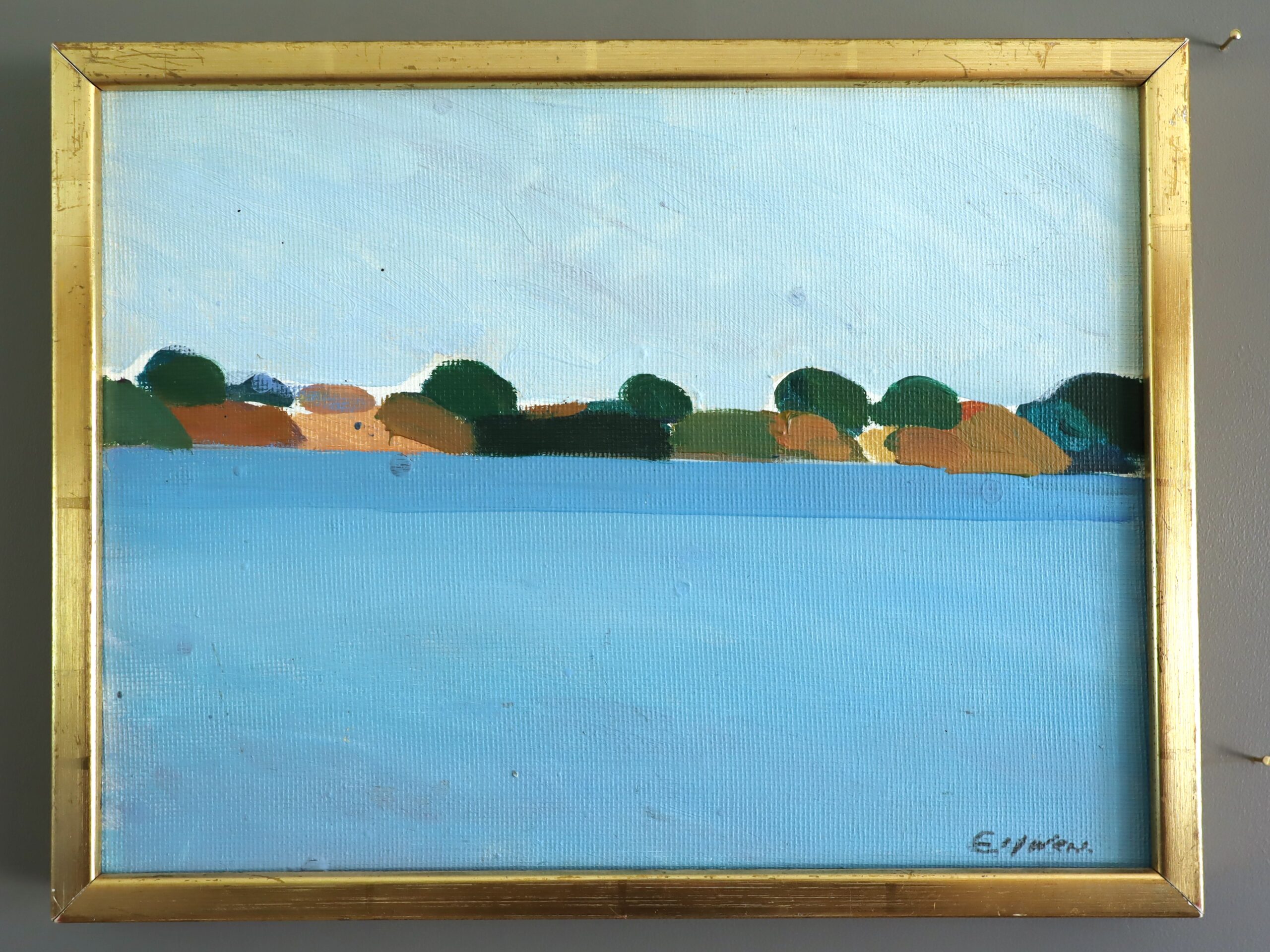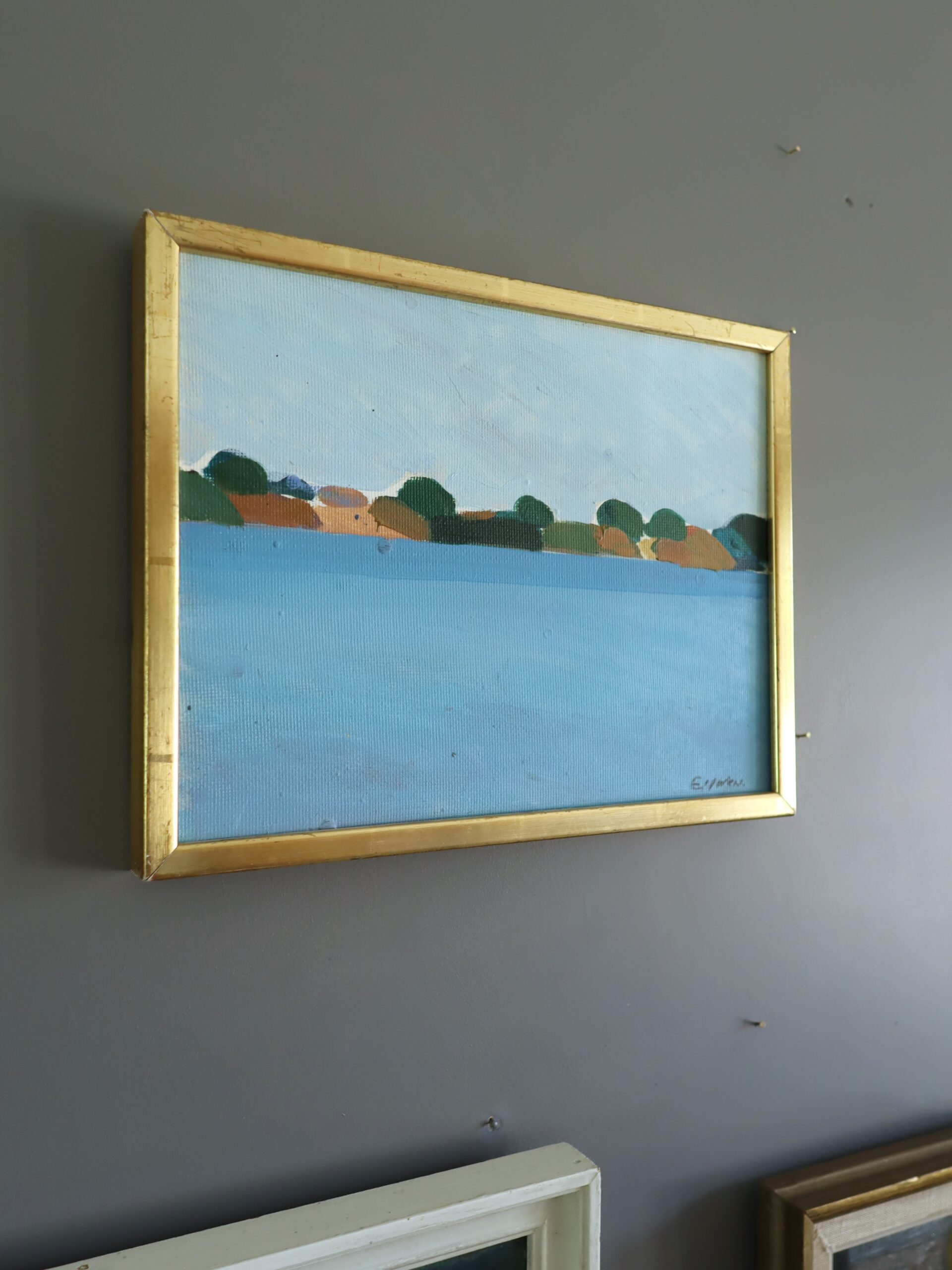 This oil on board is housed in a complementary gilt frame. The painting is in excellent vintage condition. The frame has some minor scuffing but is in good condition overall.