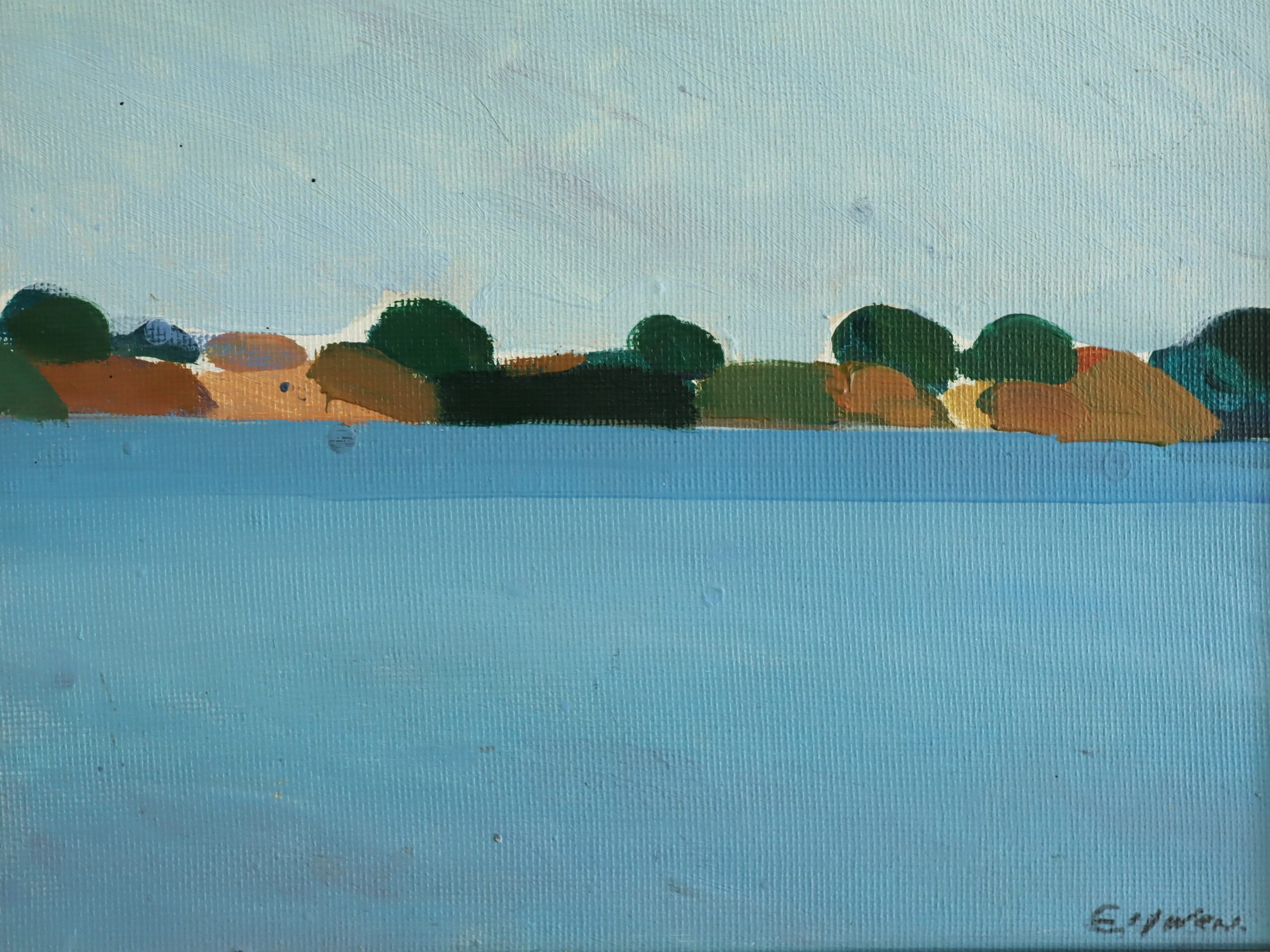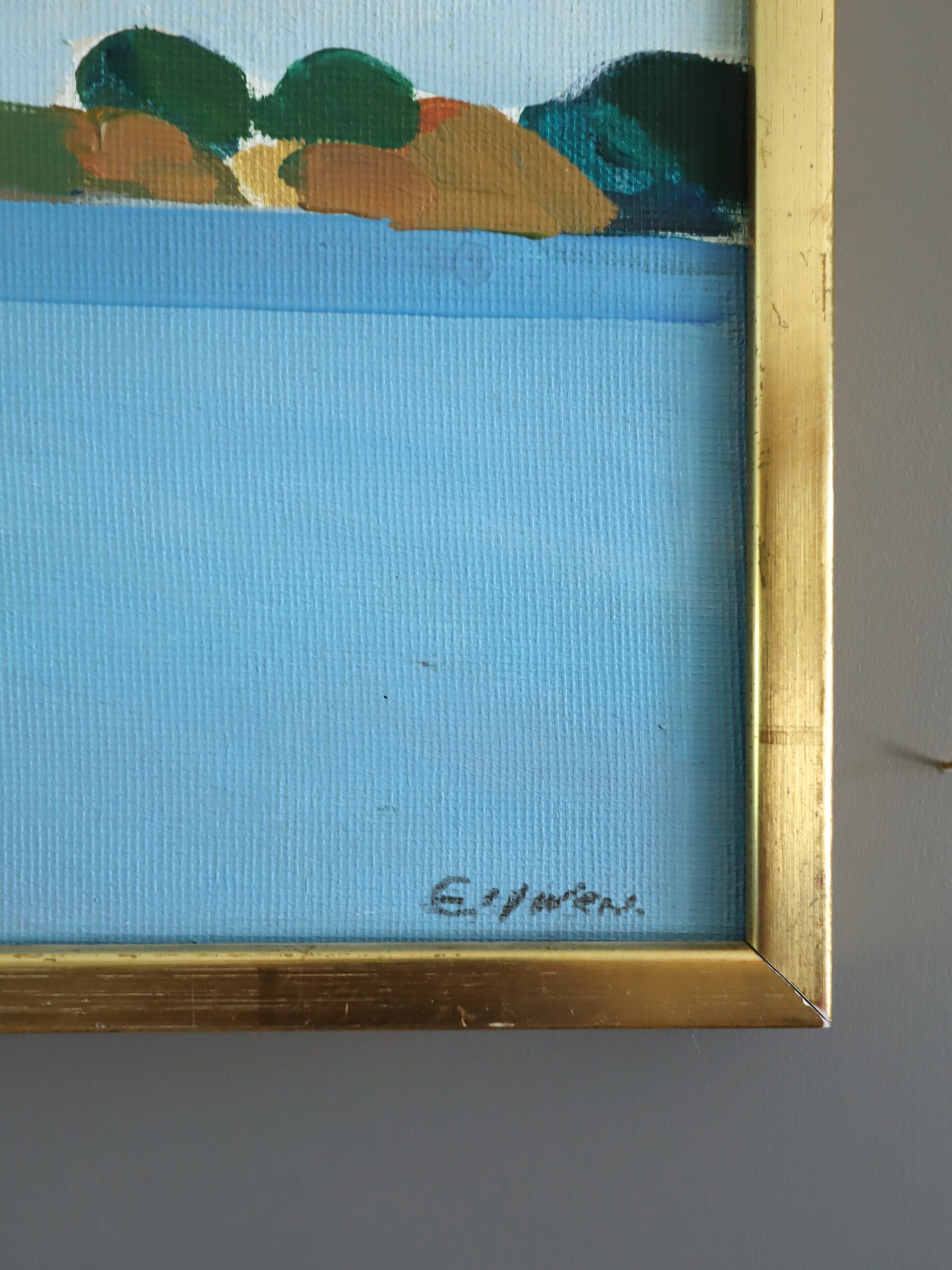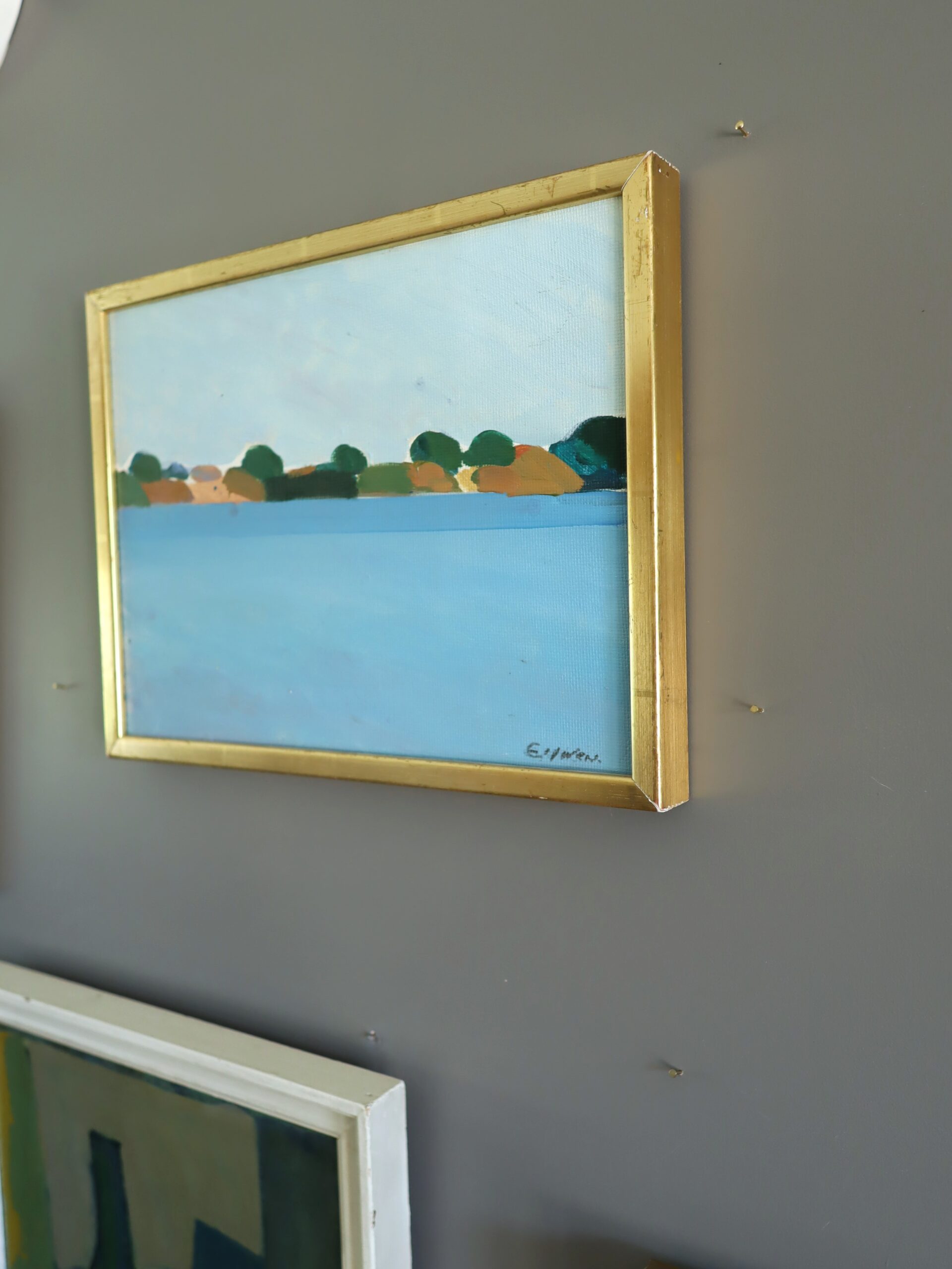 A serene and minimalist modernist style coastal landscape oil painting dated 1972, by Swedish artist Eric Elfvén (1921–2008), whose works have been exhibited in public collections including the Moderna Museet in Stockholm, Jönköping Museum, Borås Art Museum, and the Victoria and Albert Museum in London.