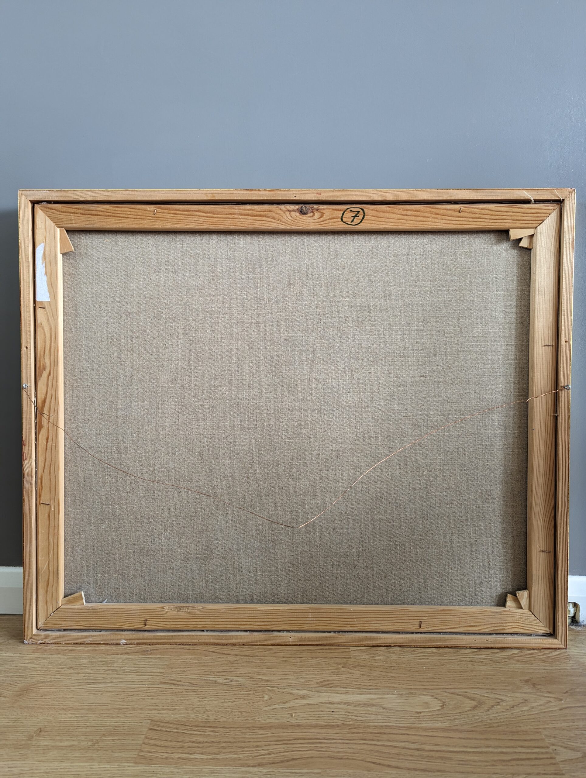 This acrylic on canvas is housed in a complementary slim gilt frame. The painting is in excellent vintage condition. The frame has some minor scuffing.