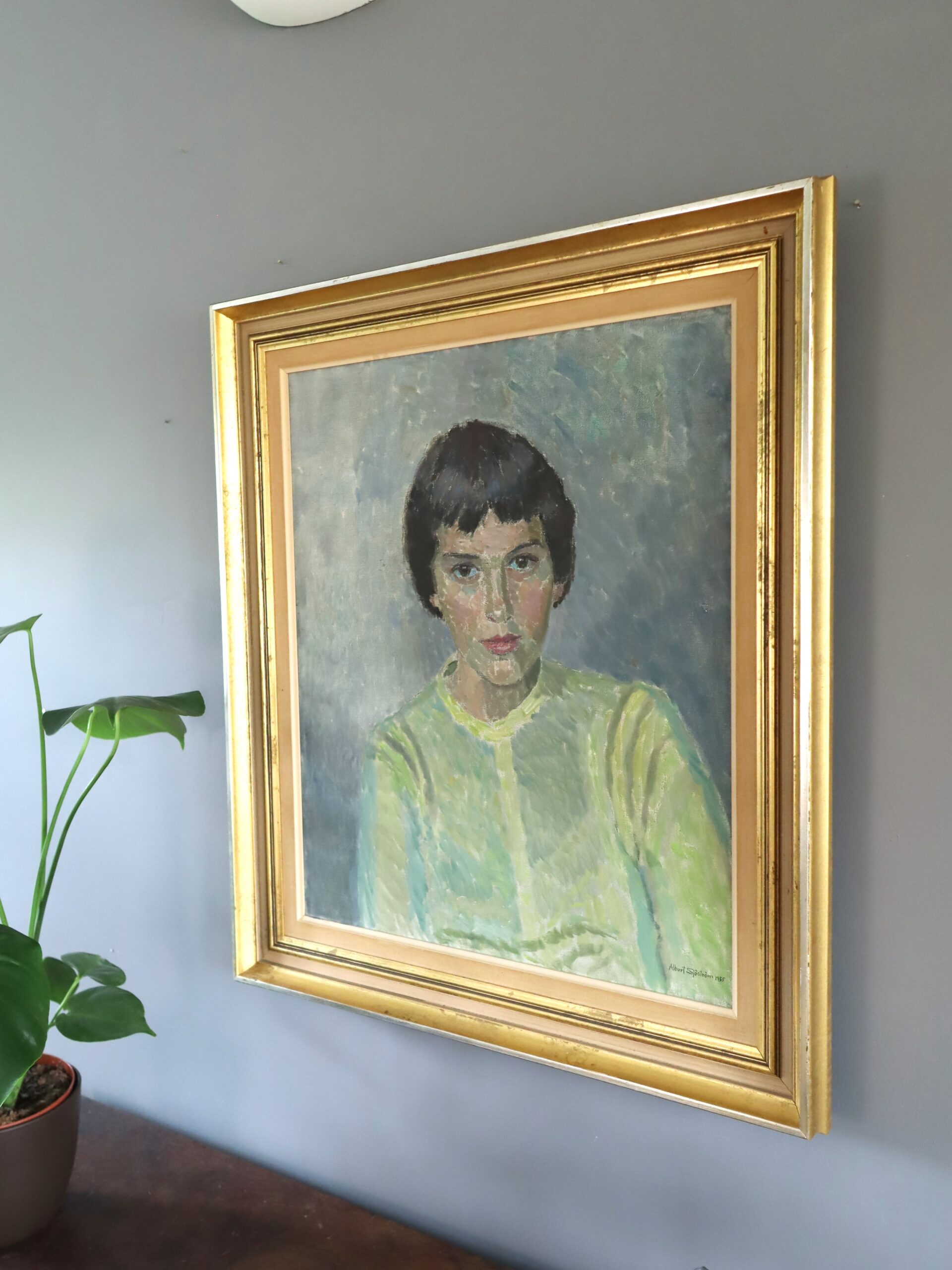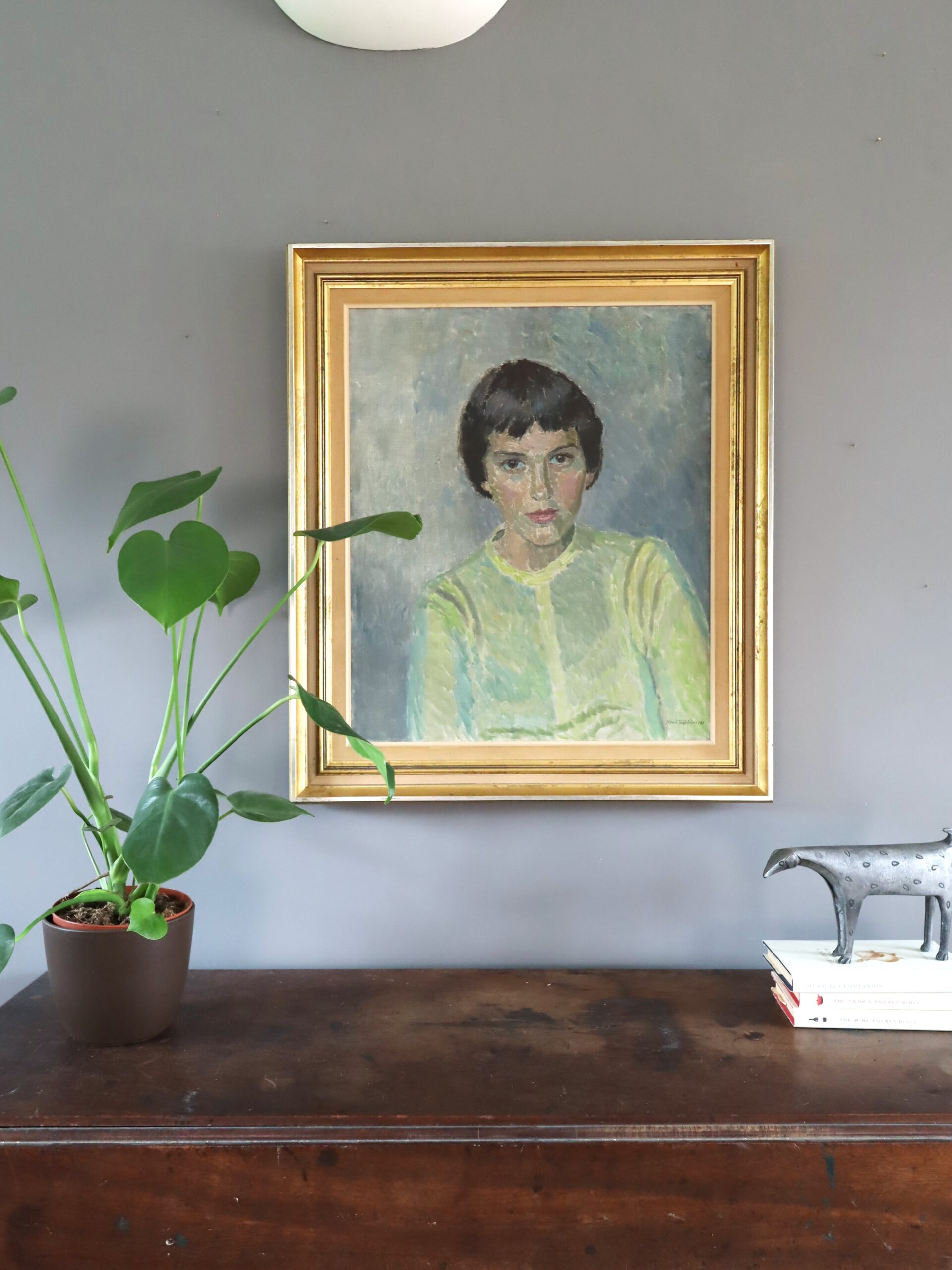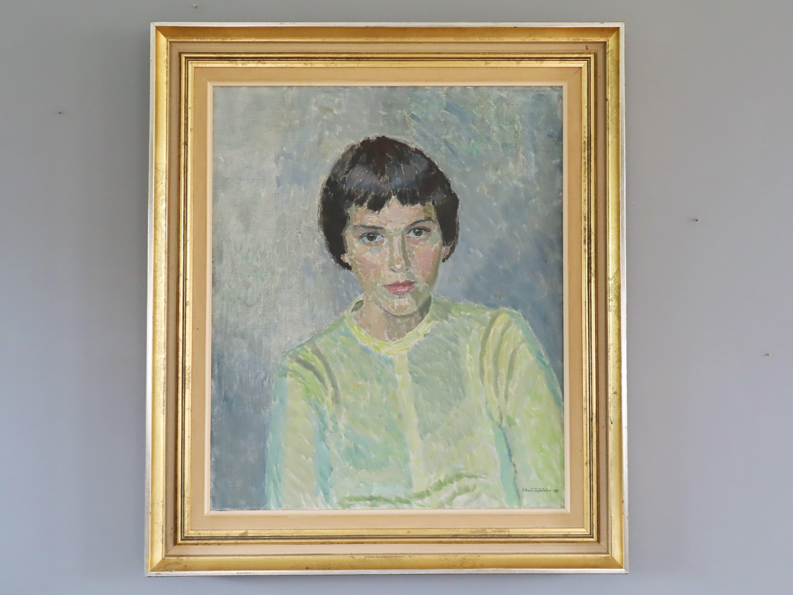 A mid-century figurative oil painting that presents an intimate portrait of a young sitter, captured with a quiet yet compelling presence, and executed in oil onto canvas and dated 1955.