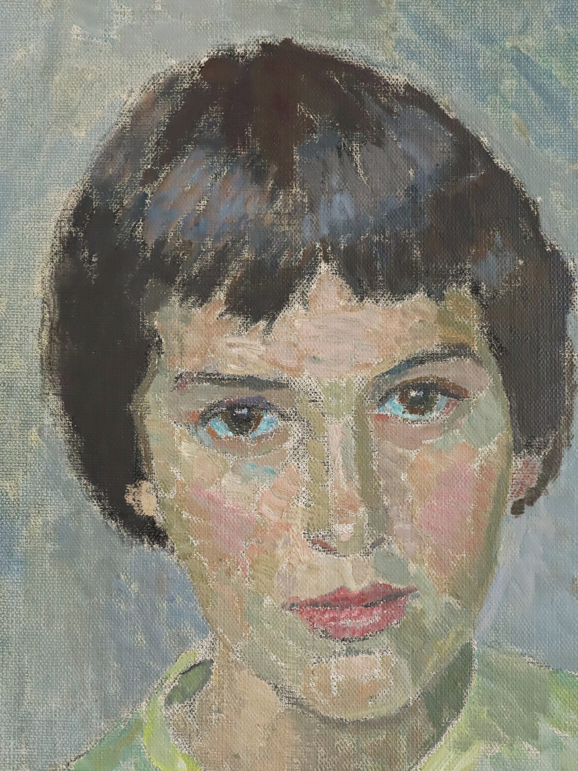 The subject, shown against a softly modulated grey-blue background, gazes directly at the viewer with dark, thoughtful eyes and a composed expression. Her short, dark hair frames a delicately modelled face, rendered with confident, angular brushstrokes that balance sensitivity with structure.