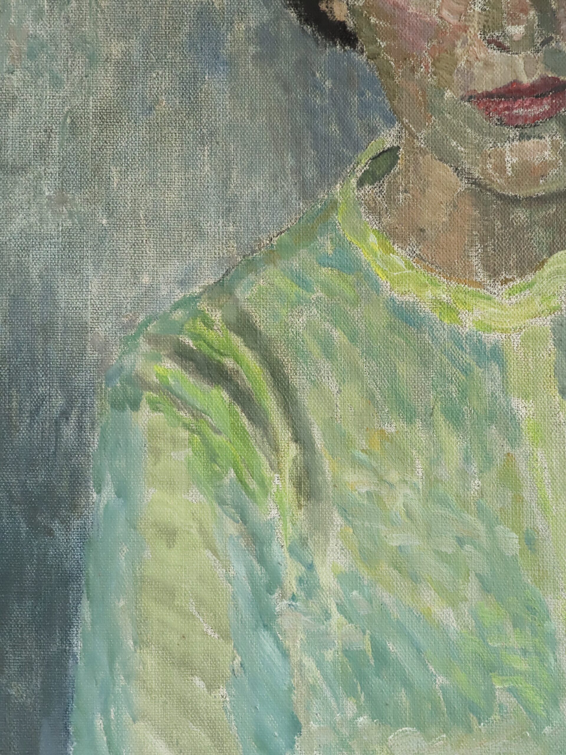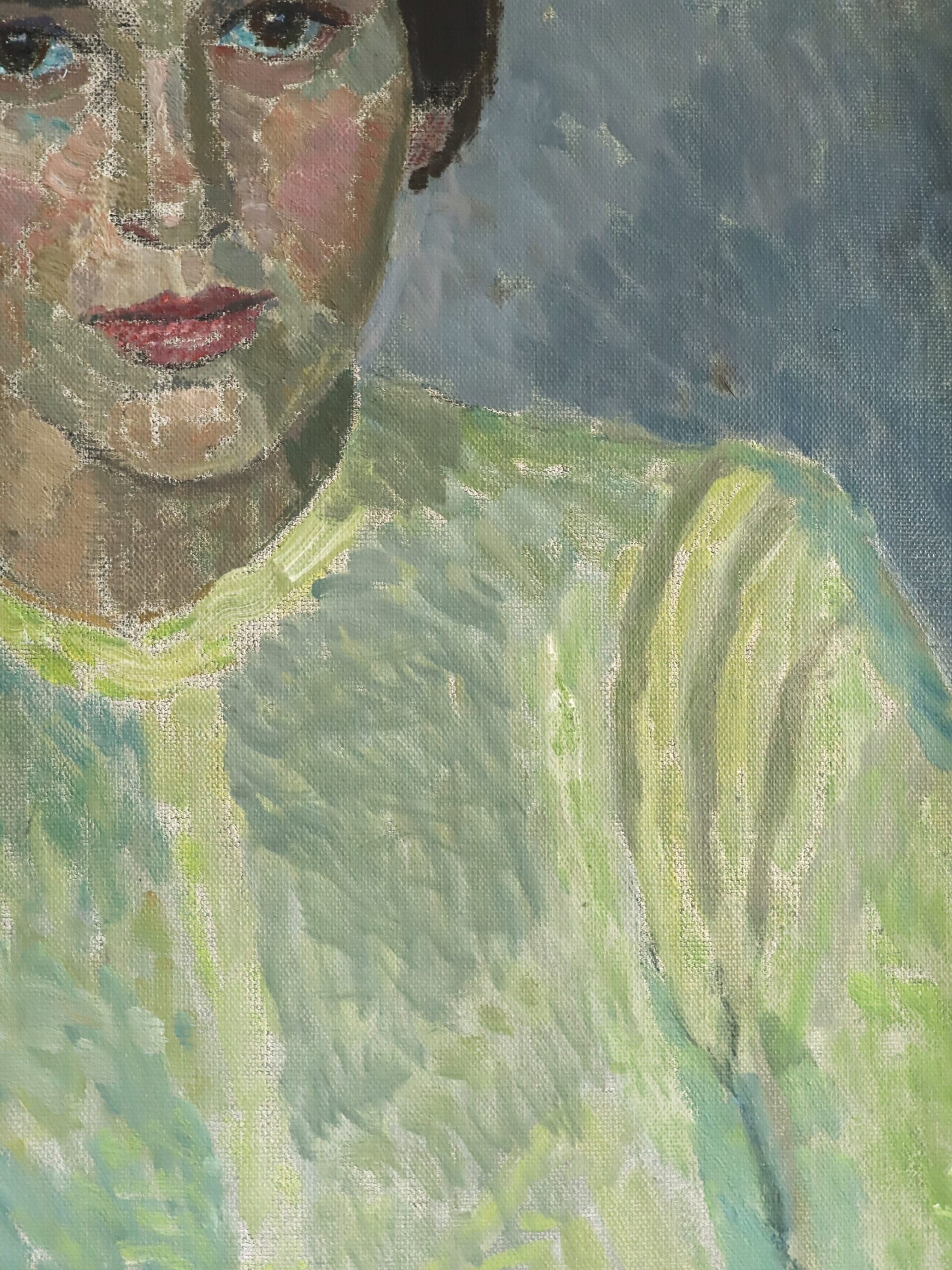 The artist has used a restrained but effective palette, dominated by muted blues, greys, and greens, contrasted with the fresh luminosity of the sitter’s yellow blouse. The strokes are loose yet deliberate, giving the painting a textured vibrancy while maintaining the sitter’s natural poise. There is an impressionistic quality to the handling of paint, with visible layering and tonal variation creating depth and atmosphere.