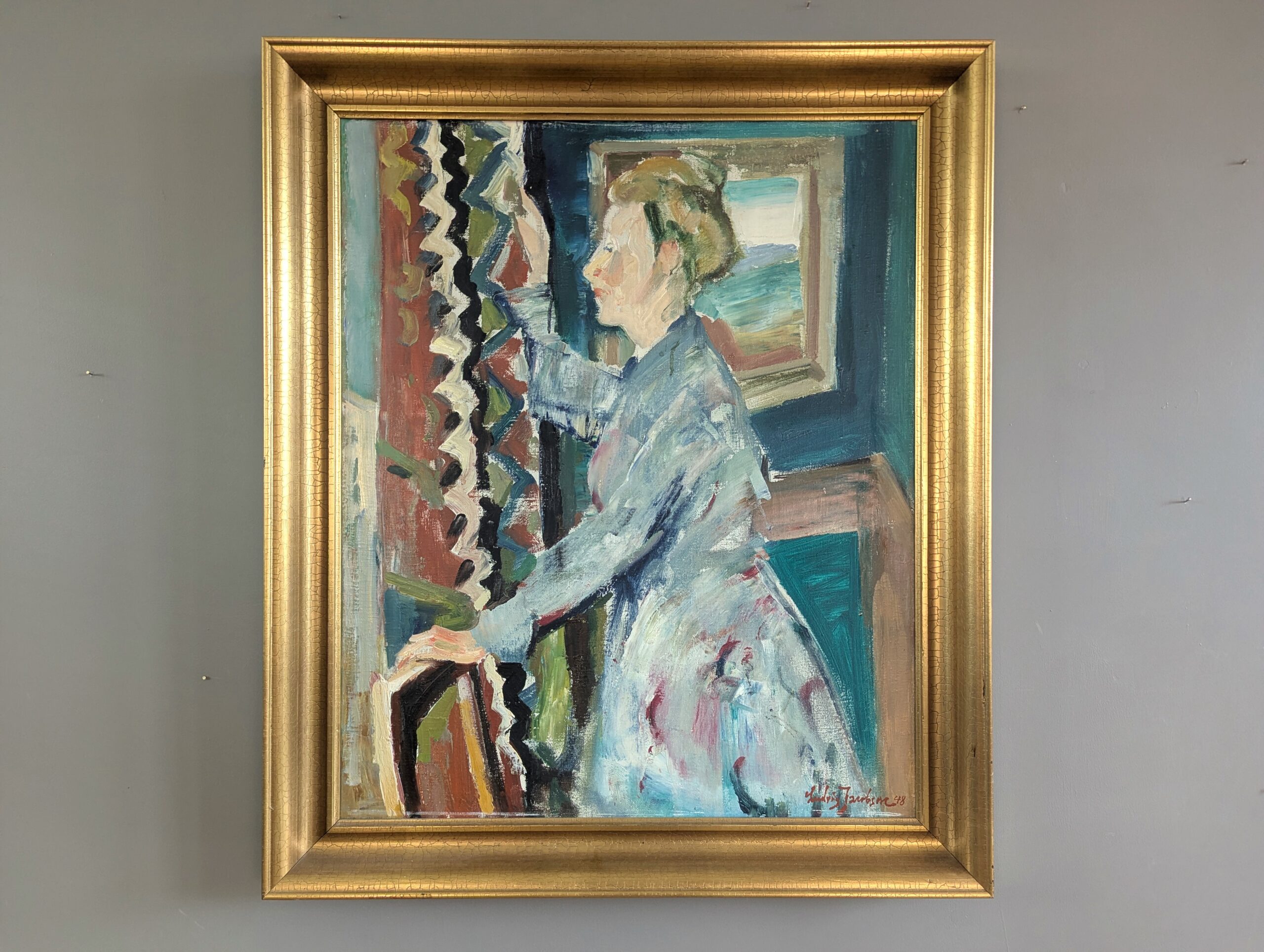 An expressive mid-century figurative portrait that captures a quiet, introspective moment as a woman stands in profile, gently parting a patterned curtain, executed in oil onto canvas and dated 1948.