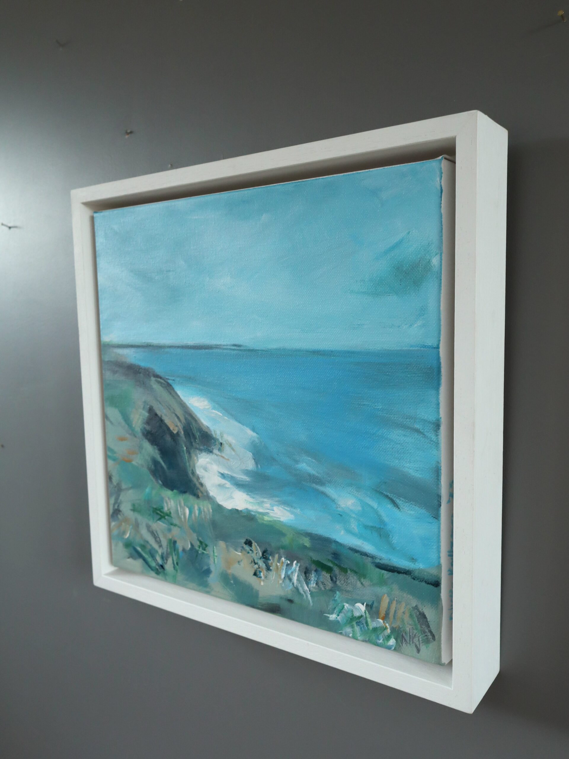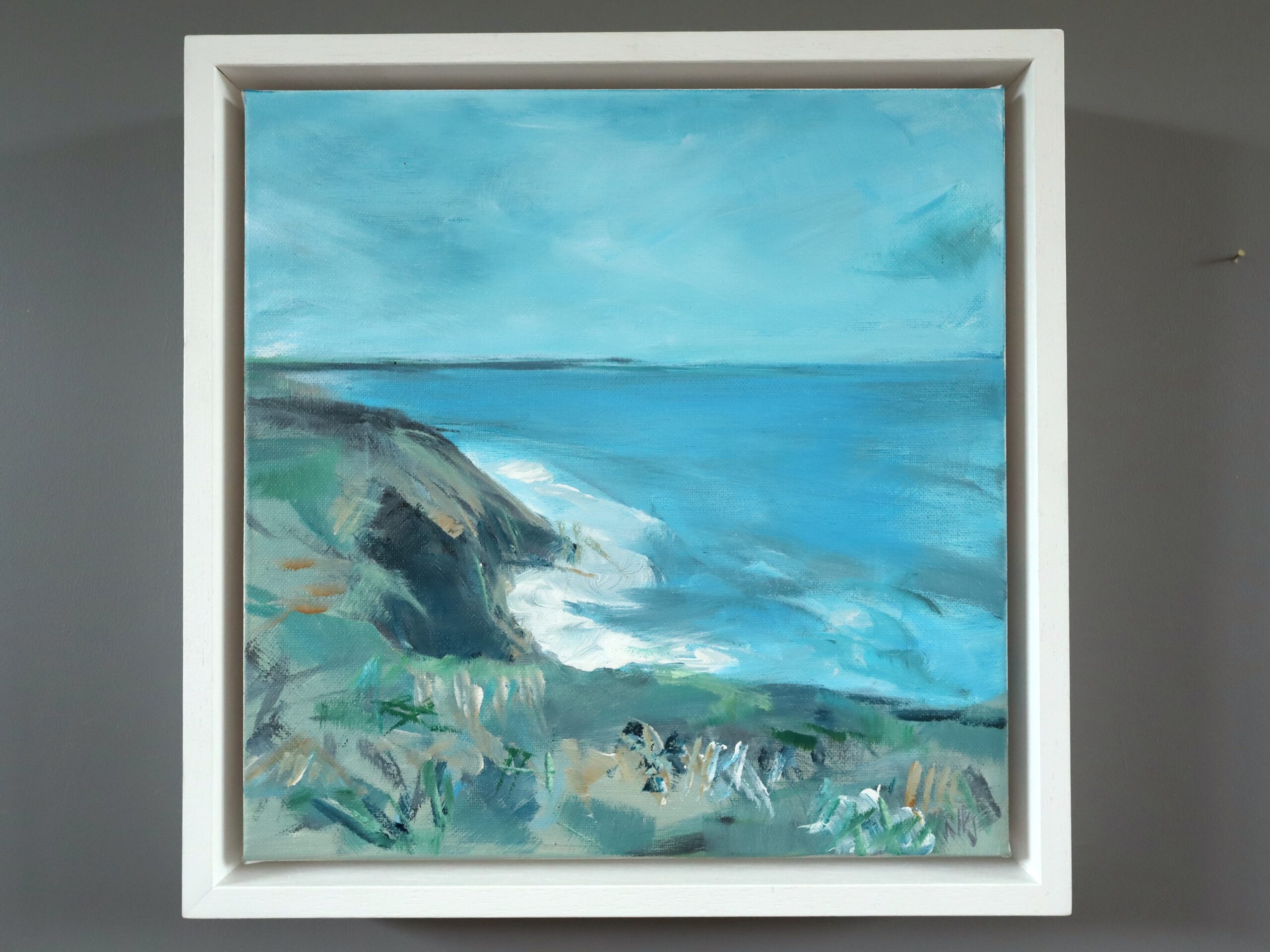 The painting captures a serene and intimate stretch of coastline, where a rugged cliff descends into a secluded bay. The composition leads the viewer’s eye from the grassy, windswept foreground down to the white surf curling against the rocks, and out across the vivid turquoise sea.