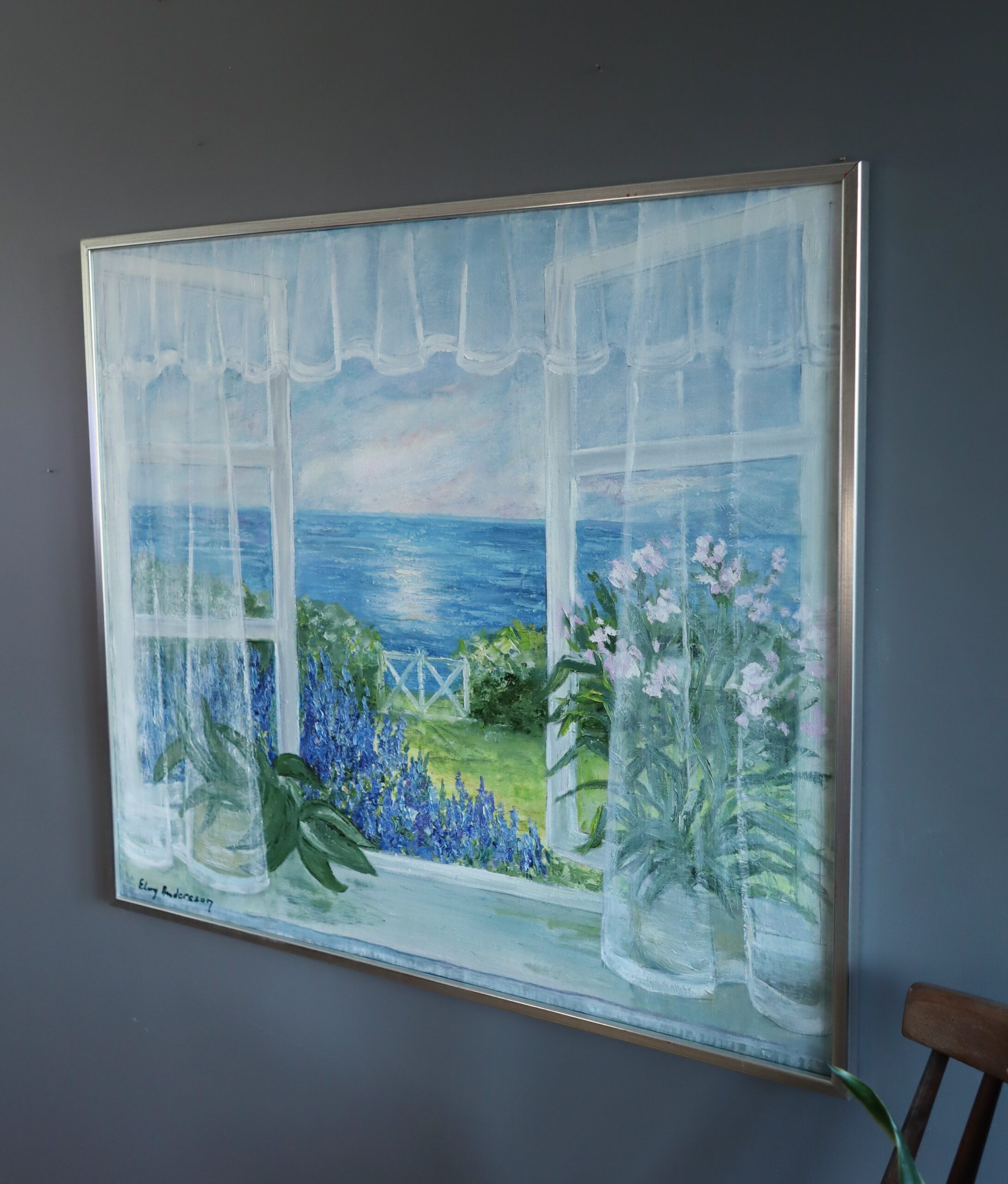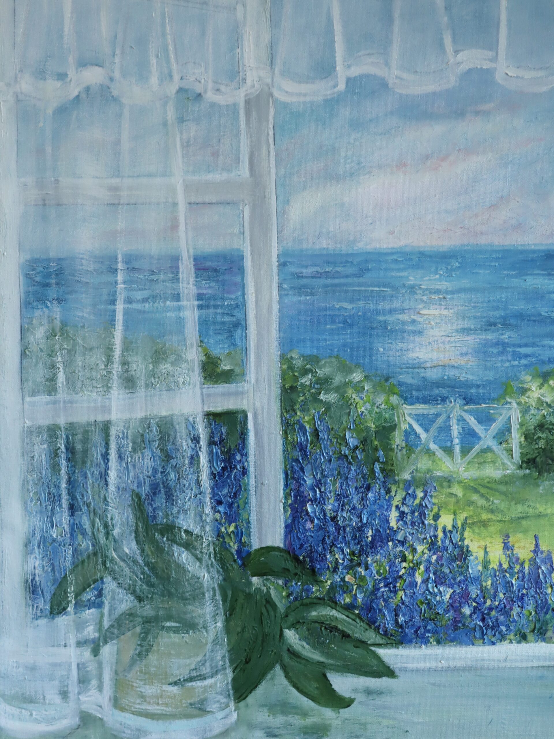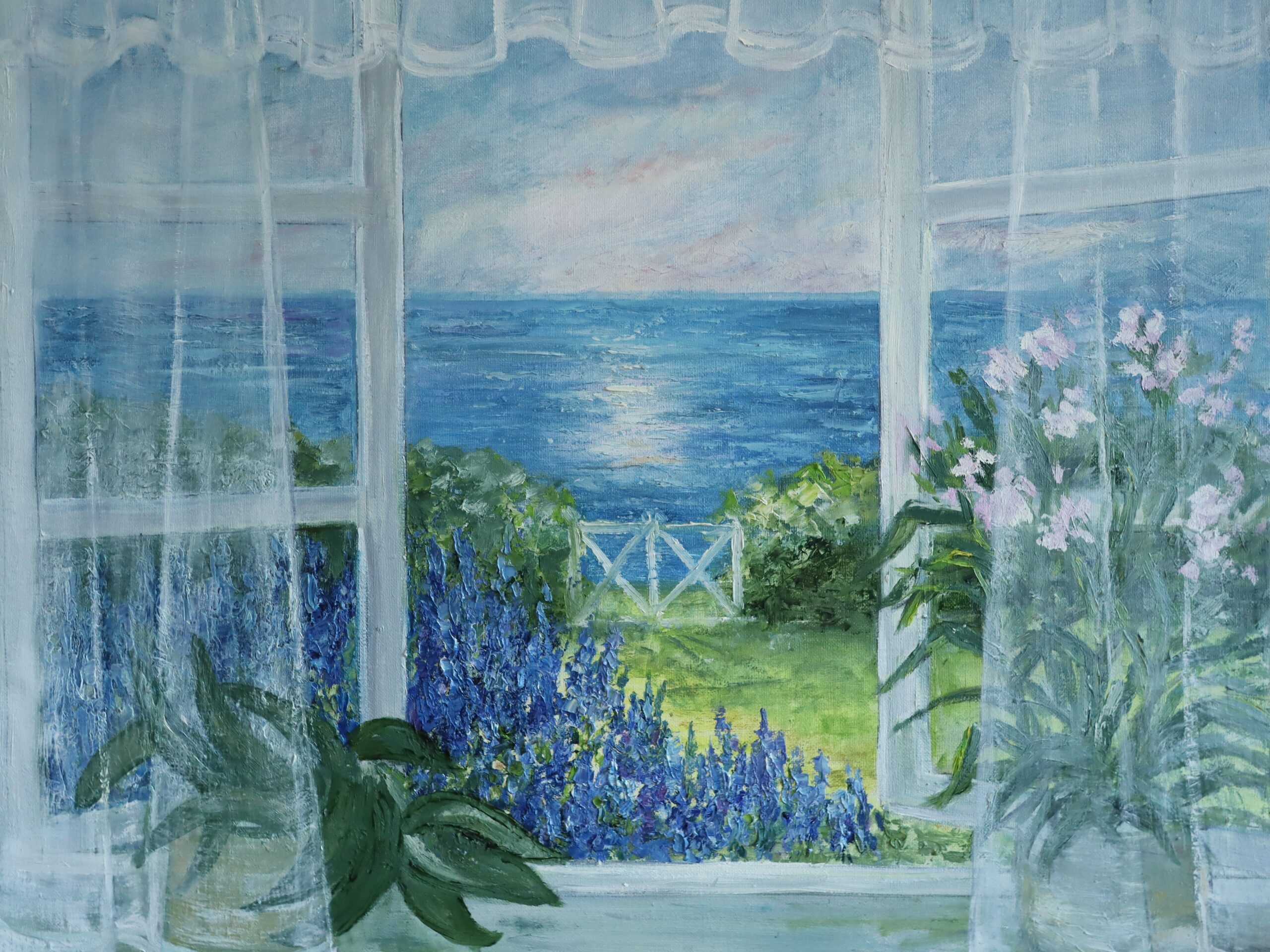 This tranquil painting invites the viewer into a sunlit summer morning by the sea. The composition is framed by delicate, sheer curtains billowing gently inward, softening the transition between interior and exterior. Beyond the window lies a lush garden bursting with violet blue delphiniums and pale pink blooms, leading the eye toward a sparkling expanse of ocean where the sun casts a gentle shimmer across the water.