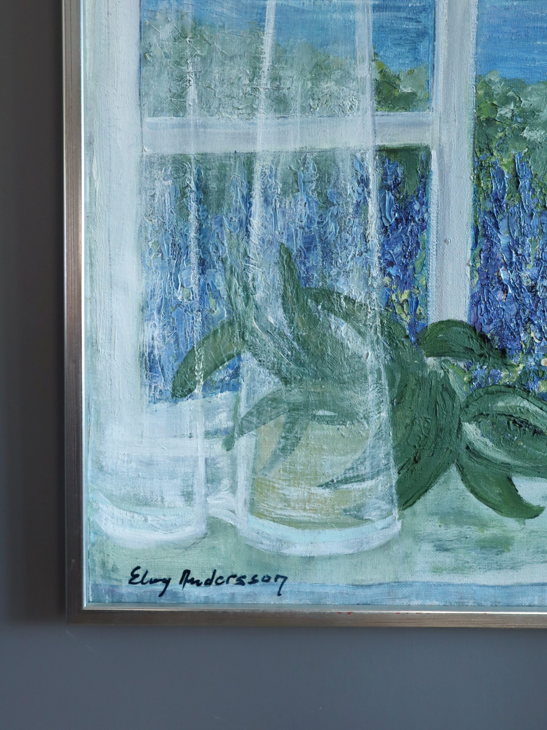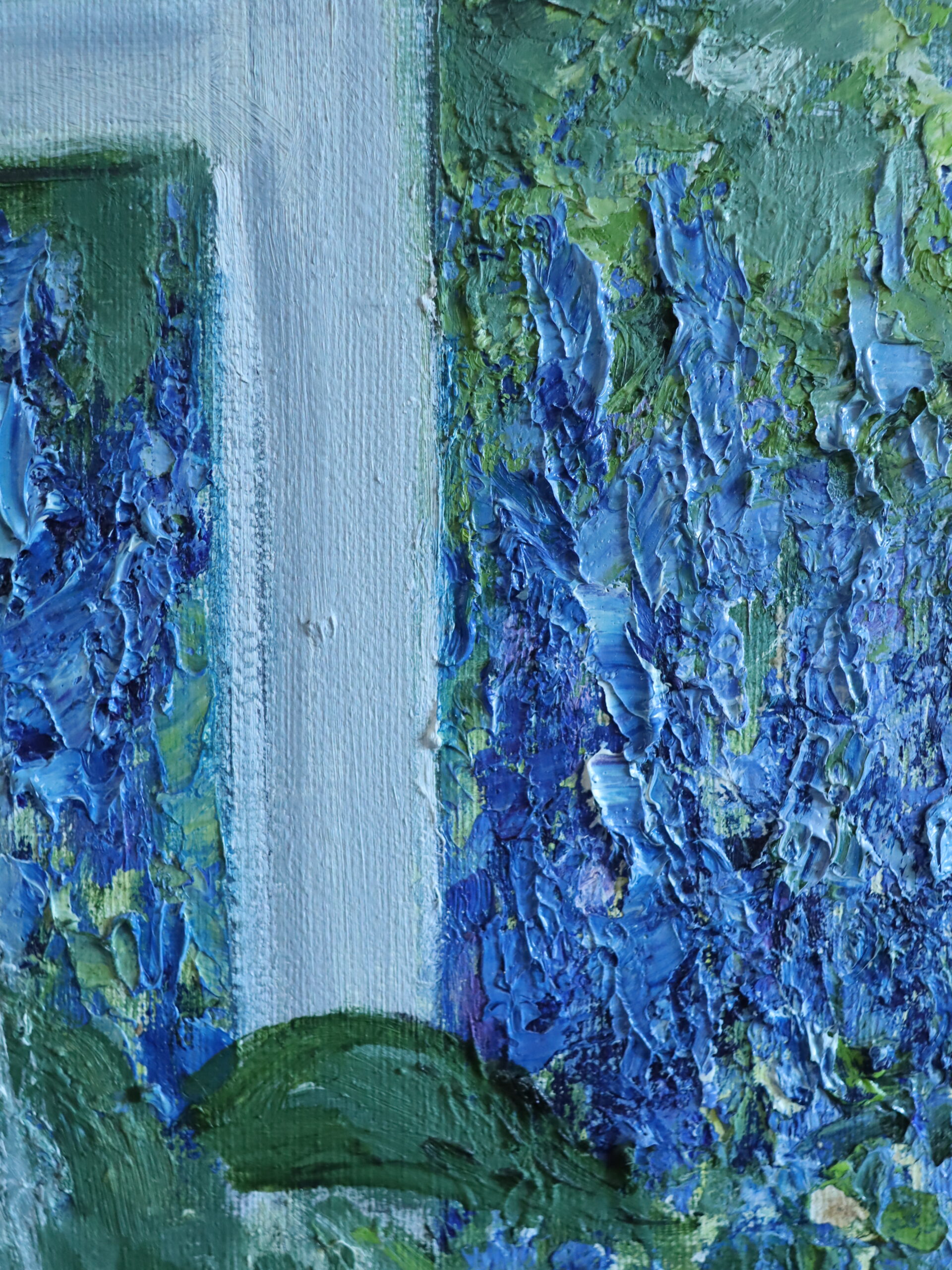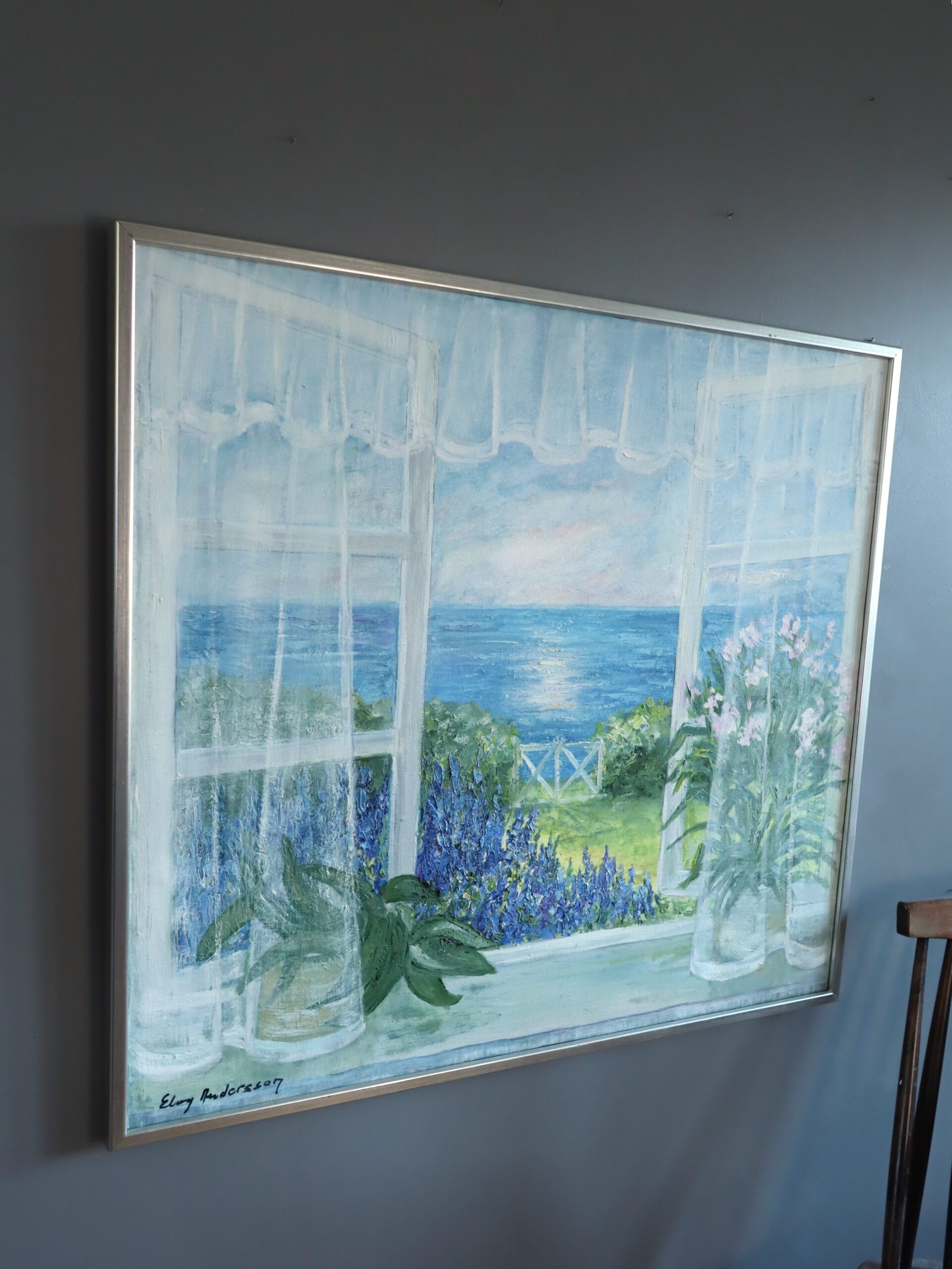 This tranquil painting invites the viewer into a sunlit summer morning by the sea. The composition is framed by delicate, sheer curtains billowing gently inward, softening the transition between interior and exterior. Beyond the window lies a lush garden bursting with violet blue delphiniums and pale pink blooms, leading the eye toward a sparkling expanse of ocean where the sun casts a gentle shimmer across the water.