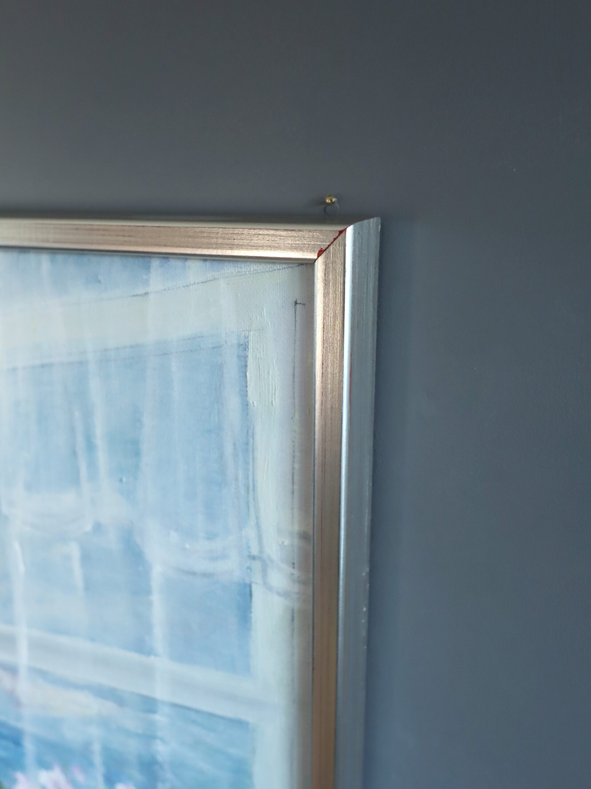 This large oil on canvas is housed in a complementary champagne frame. Both the painting and frame are in excellent vintage condition.