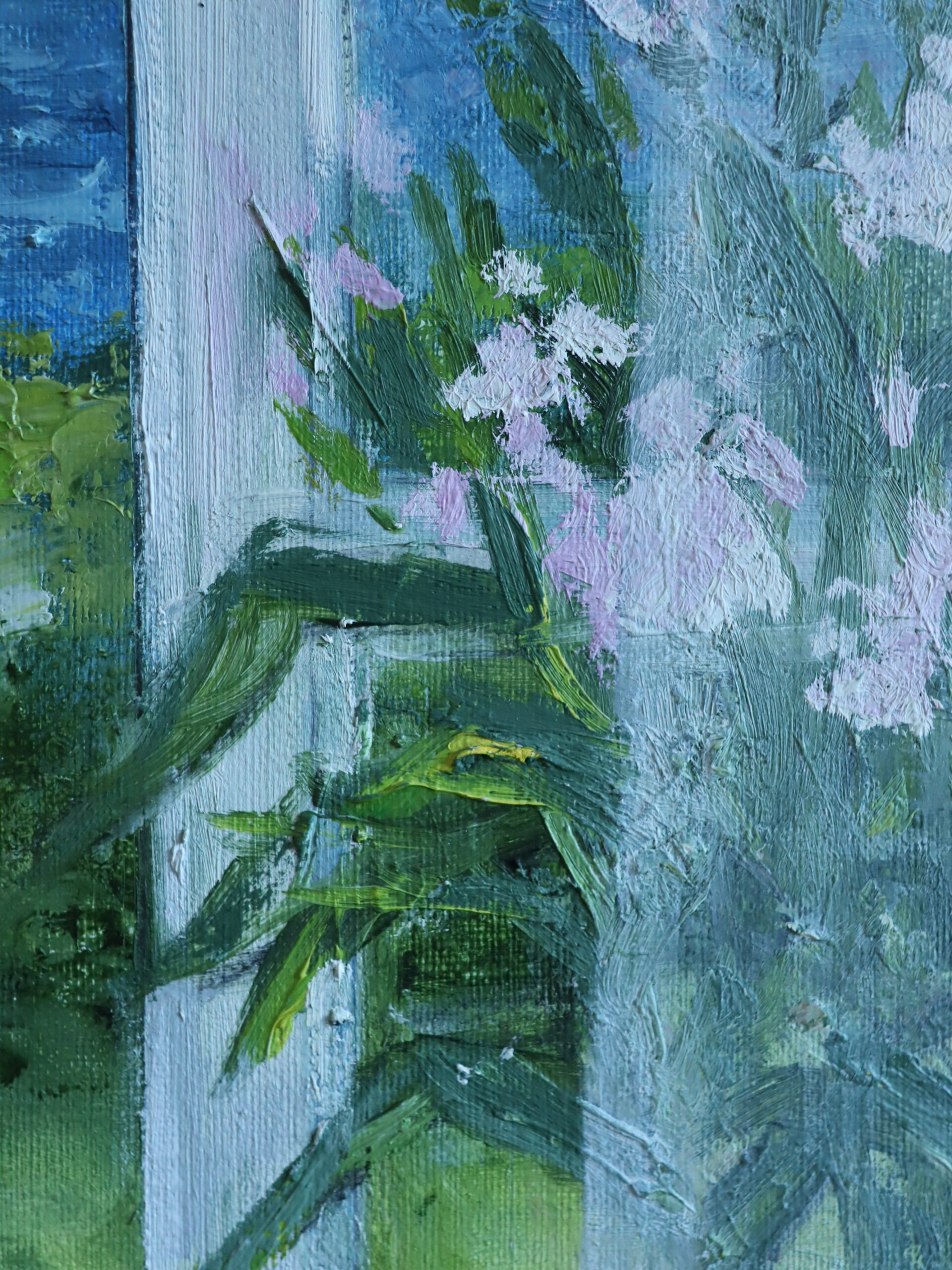 Rendered in a soft, lyrical mid-century style, the palette is dominated by airy whites, fresh greens, pastel blues, and gentle pinks, creating a sense of calm and effortless charm. The artist has used light, feathery brushstrokes to capture the translucency of the curtains and the movement of the foliage, while smoother, blended strokes describe the distant horizon and glowing sky. Subtle impasto in the floral areas adds texture and depth, enhancing the sense of a garden alive with colour and breeze.