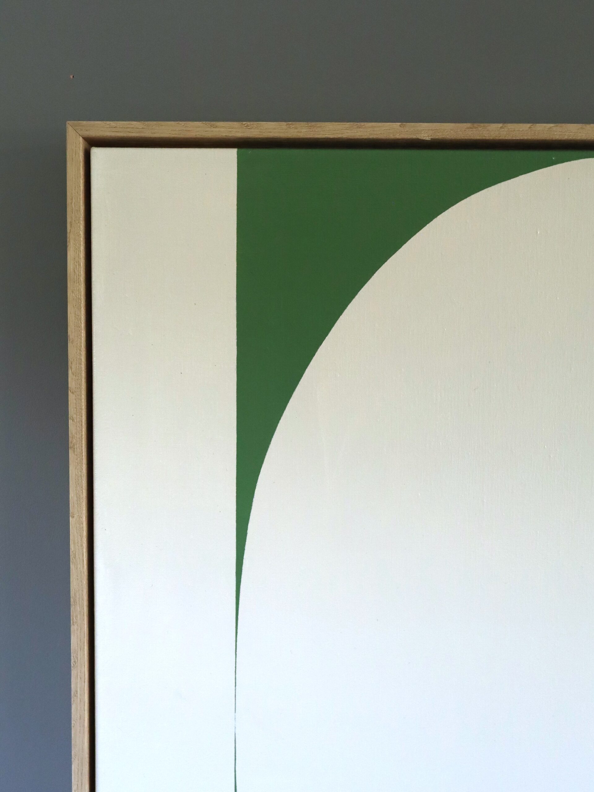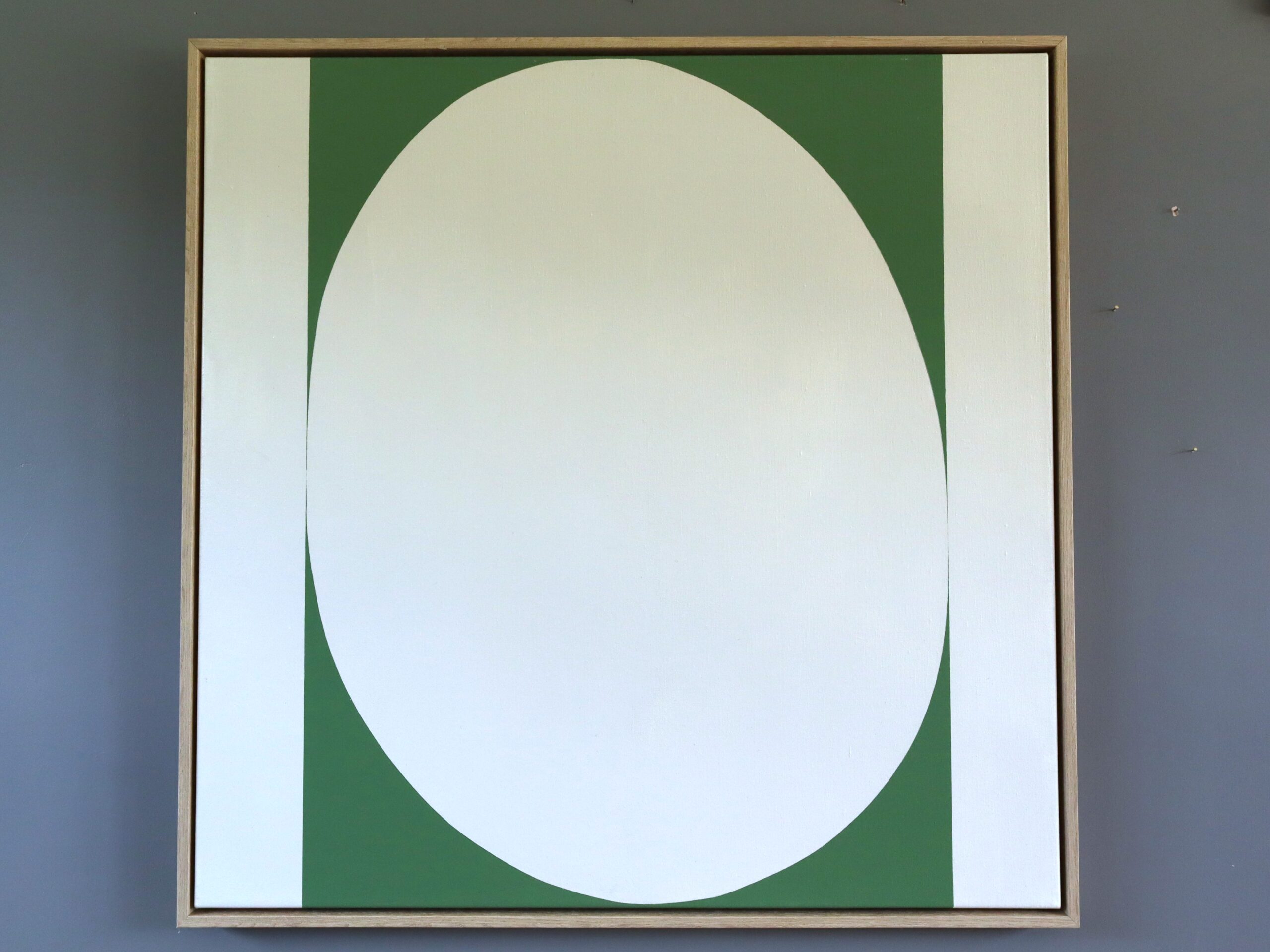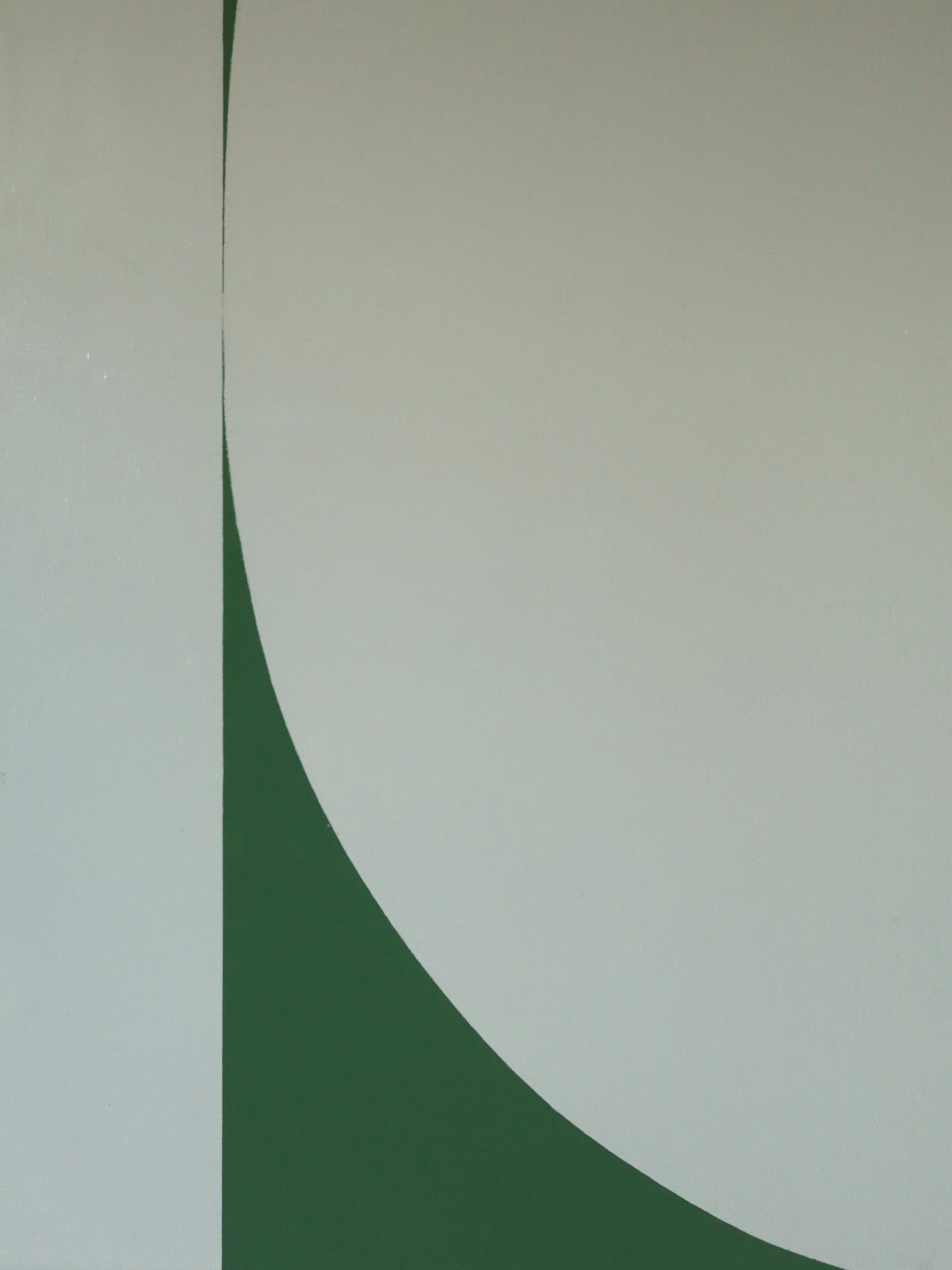 Executed in a minimalist style, the work bears no visible brushstrokes, suggesting the use of masking techniques or flat application of paint to achieve a crisp, graphic finish. The simplicity of the colour palette – clean white and a subdued forest green – lends a serene, contemplative tone, inviting the viewer to reflect on the tension between form and emptiness, presence and absence. A subtle nod to mid-century minimalism, this piece balances structure and softness with elegant restraint.
