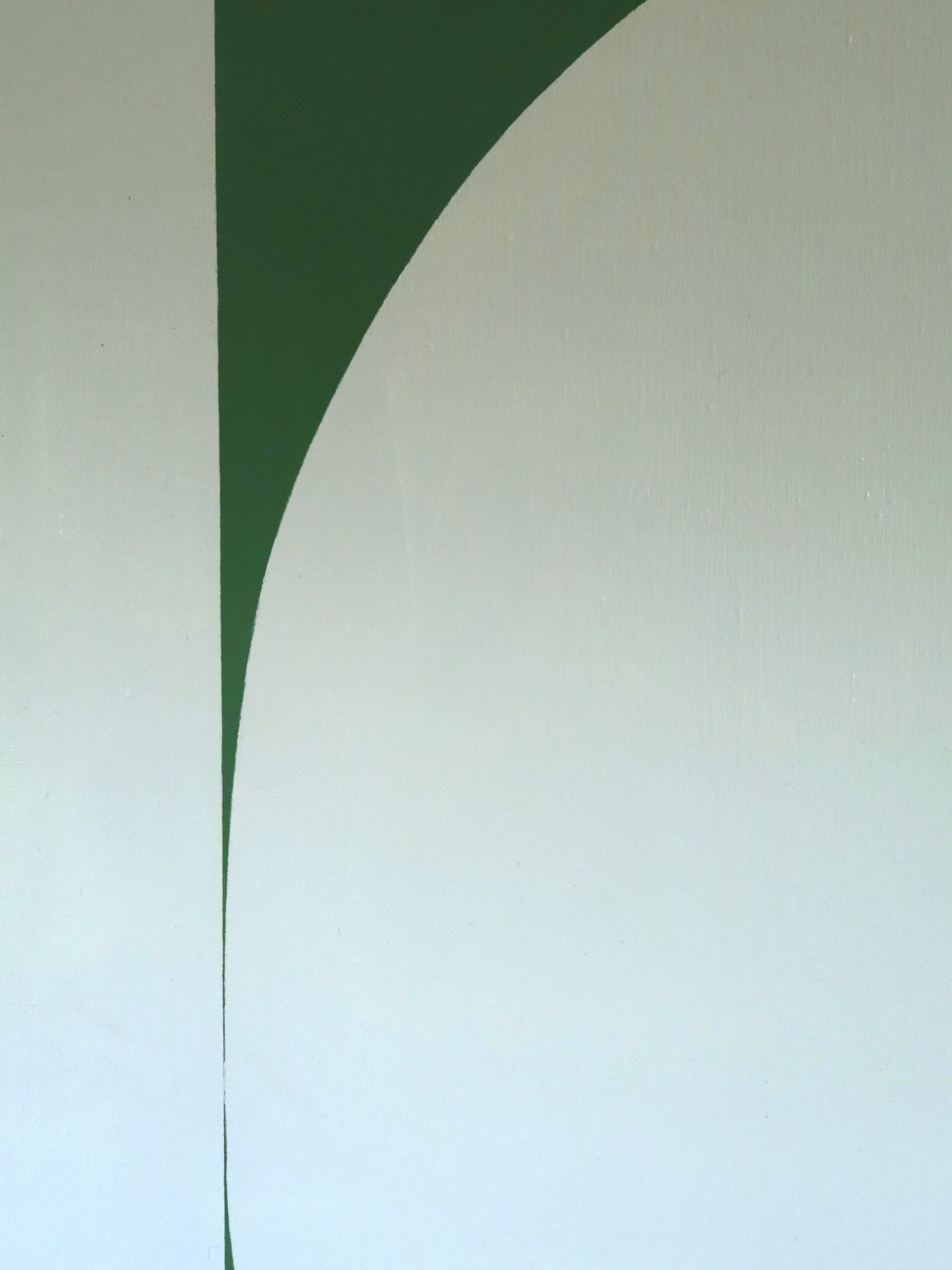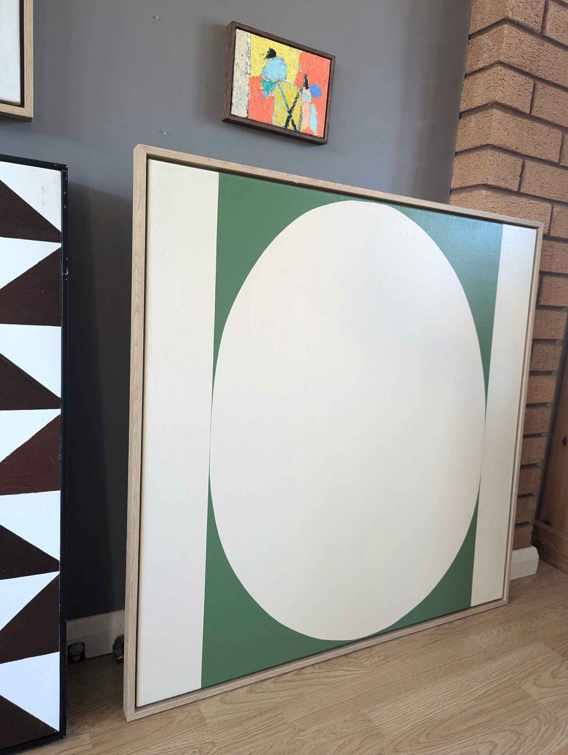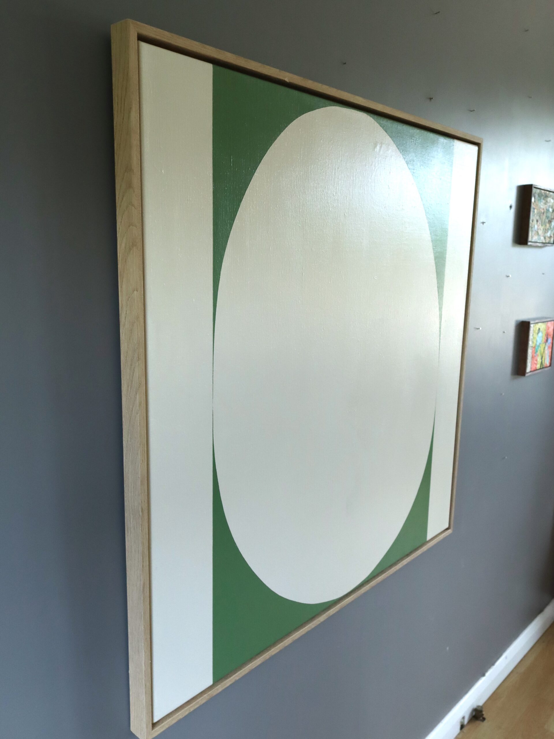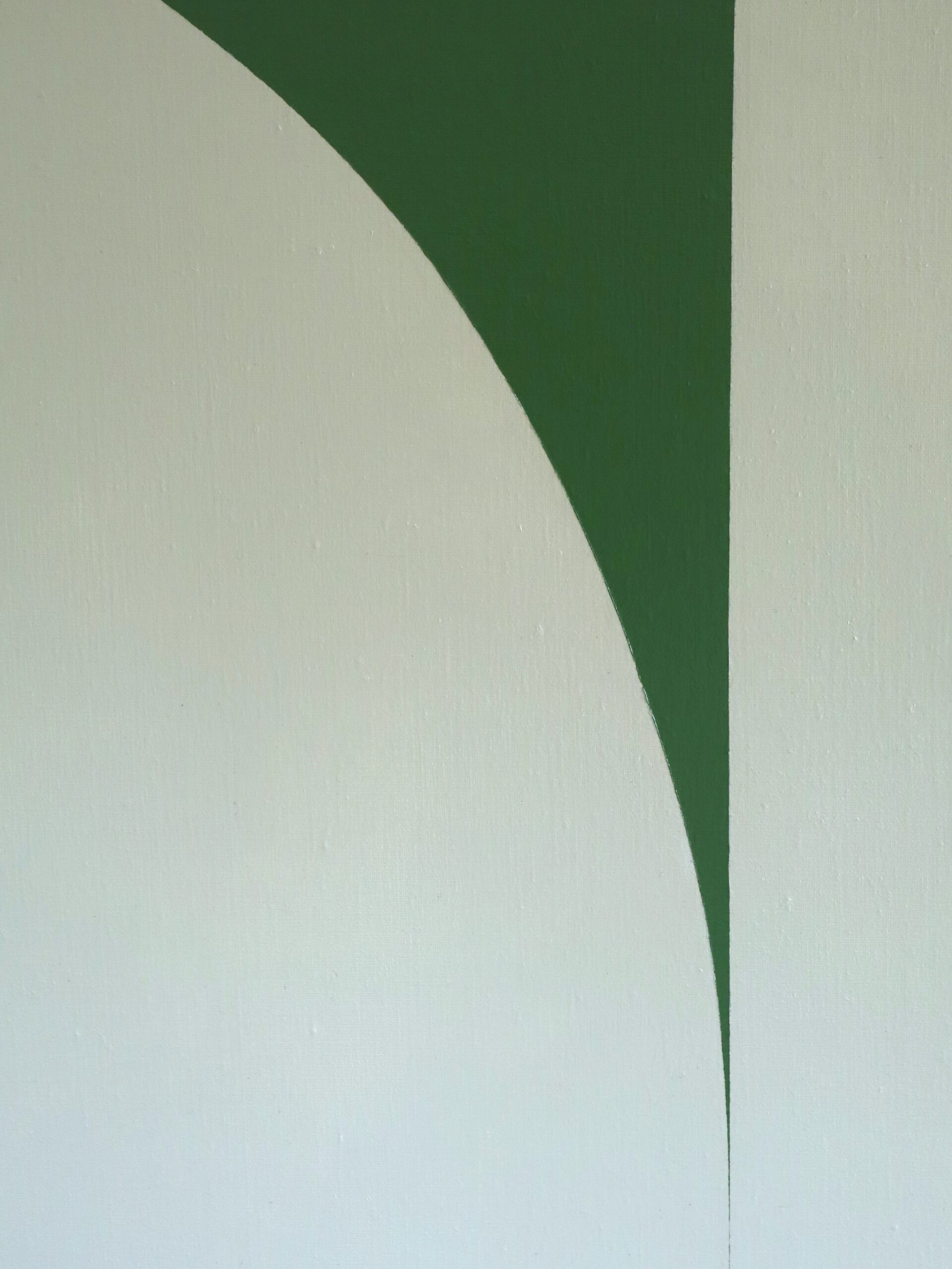 Executed in a minimalist style, the work bears no visible brushstrokes, suggesting the use of masking techniques or flat application of paint to achieve a crisp, graphic finish. The simplicity of the colour palette – clean white and a subdued forest green – lends a serene, contemplative tone, inviting the viewer to reflect on the tension between form and emptiness, presence and absence. A subtle nod to mid-century minimalism, this piece balances structure and softness with elegant restraint.