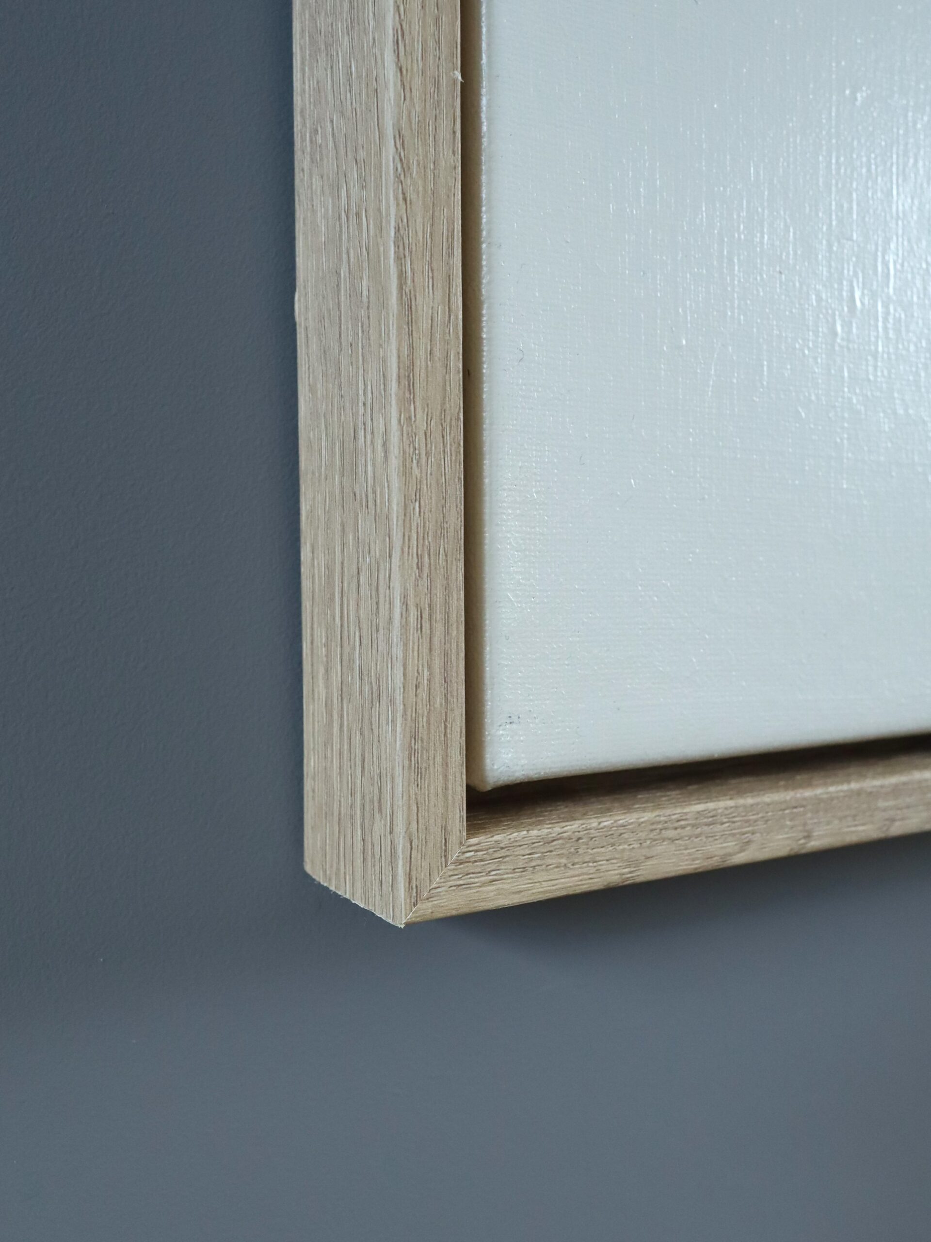 This oil on canvas is housed in a complementary light wood tray frame. Both painting and frame are in excellent vintage condition.