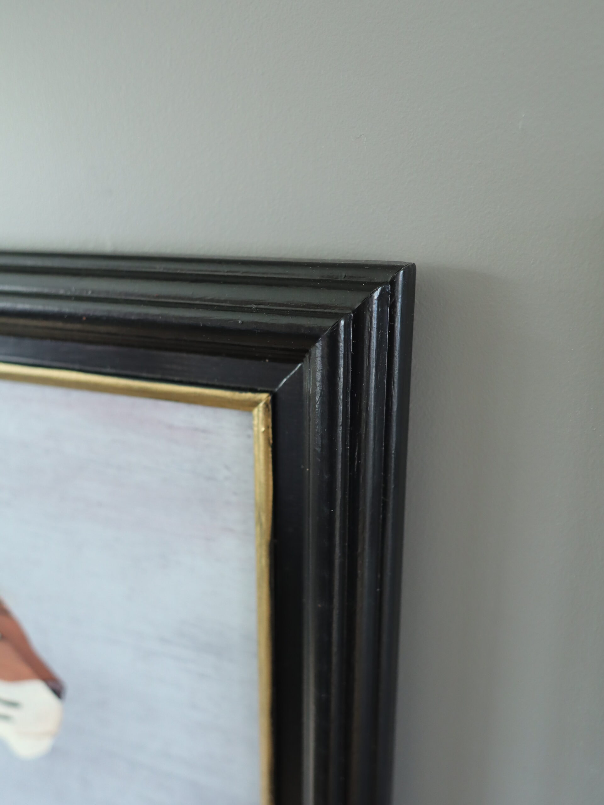 This oil on board is presented in a dark wooden frame with a inner gilt border. Both painting and frame are in excellent condition.