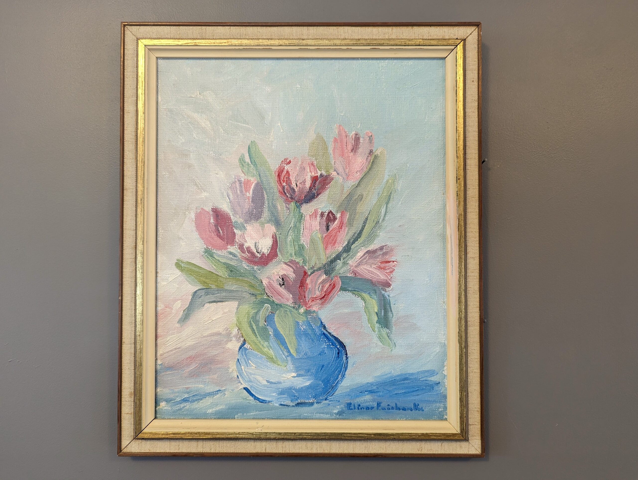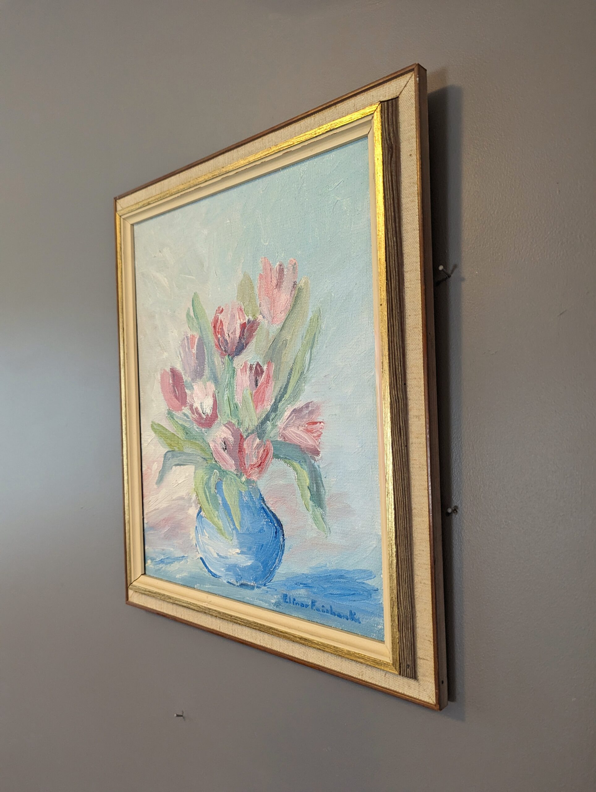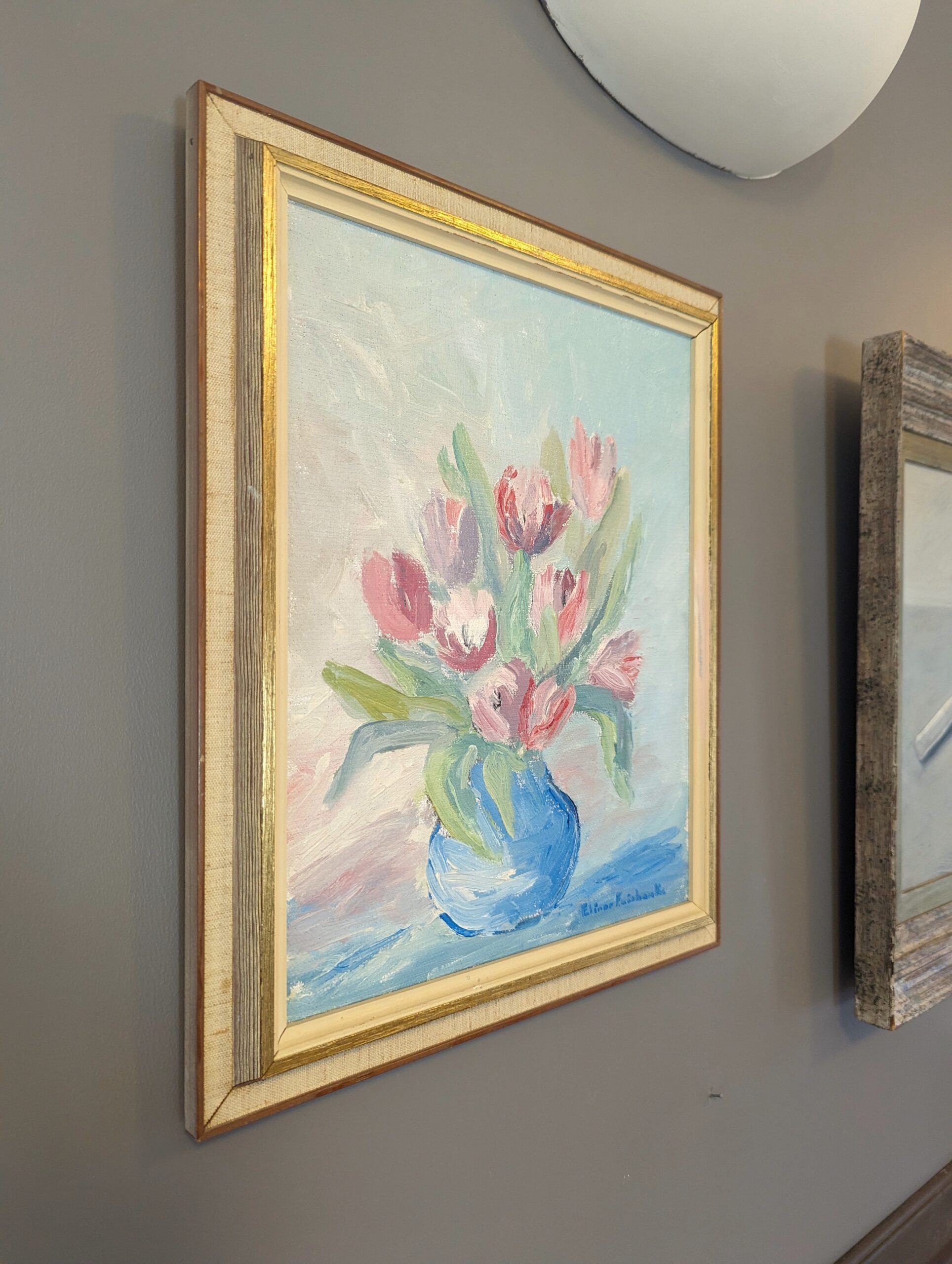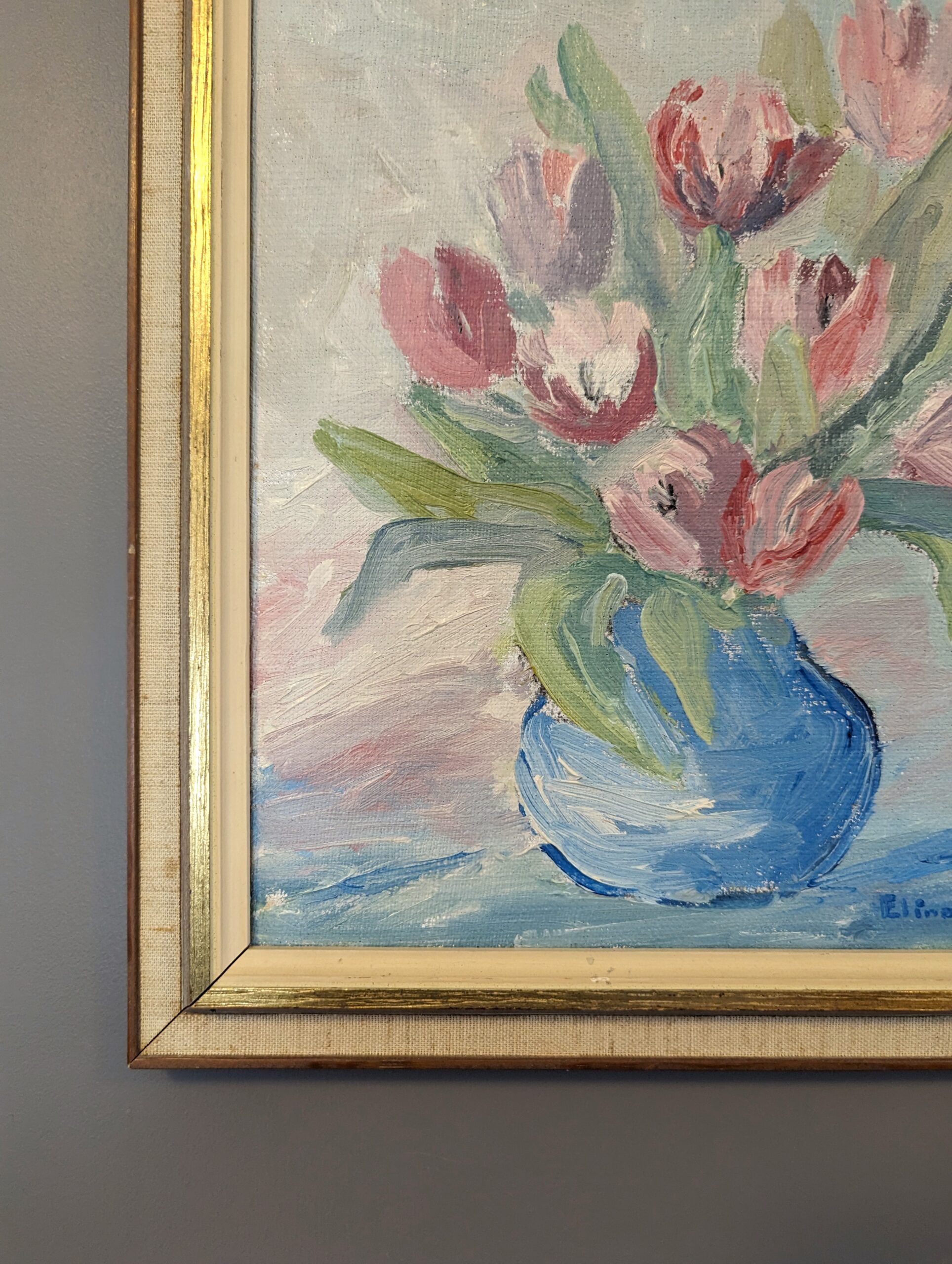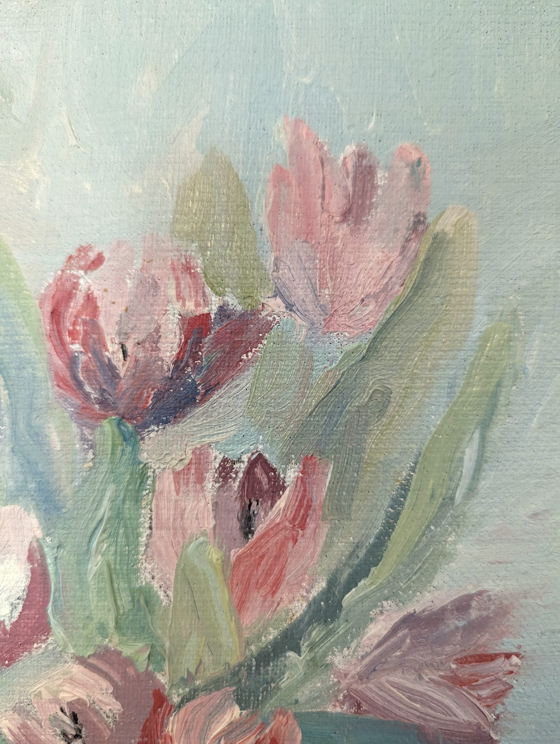 In this floral piece we have light pink tulips in a blue vase, painted in an expressionist style. Broad, gestural brushstrokes in a range of soft, pastel colours make up this composition. The flowers and vase is set against a background of light blue and pink, which transitions into a richer blue as we move down the canvas. There is a wonderful diaphanous quality to this painting which is really easy on the eye. Floral pieces like these have a timelessness to them which make them in an easy fit in many interior settings. The lightness to this one would certainly uplift the mood of a space.