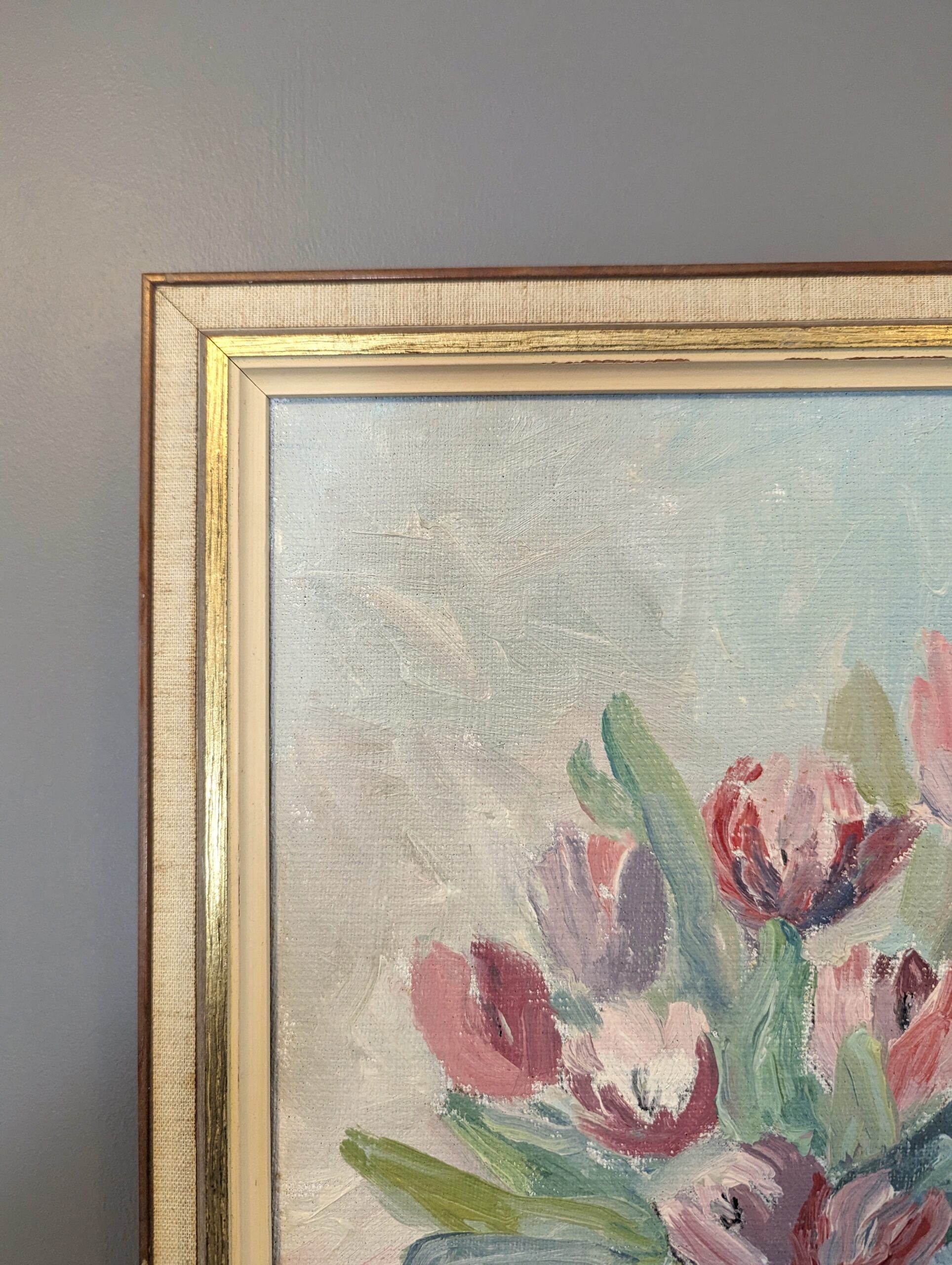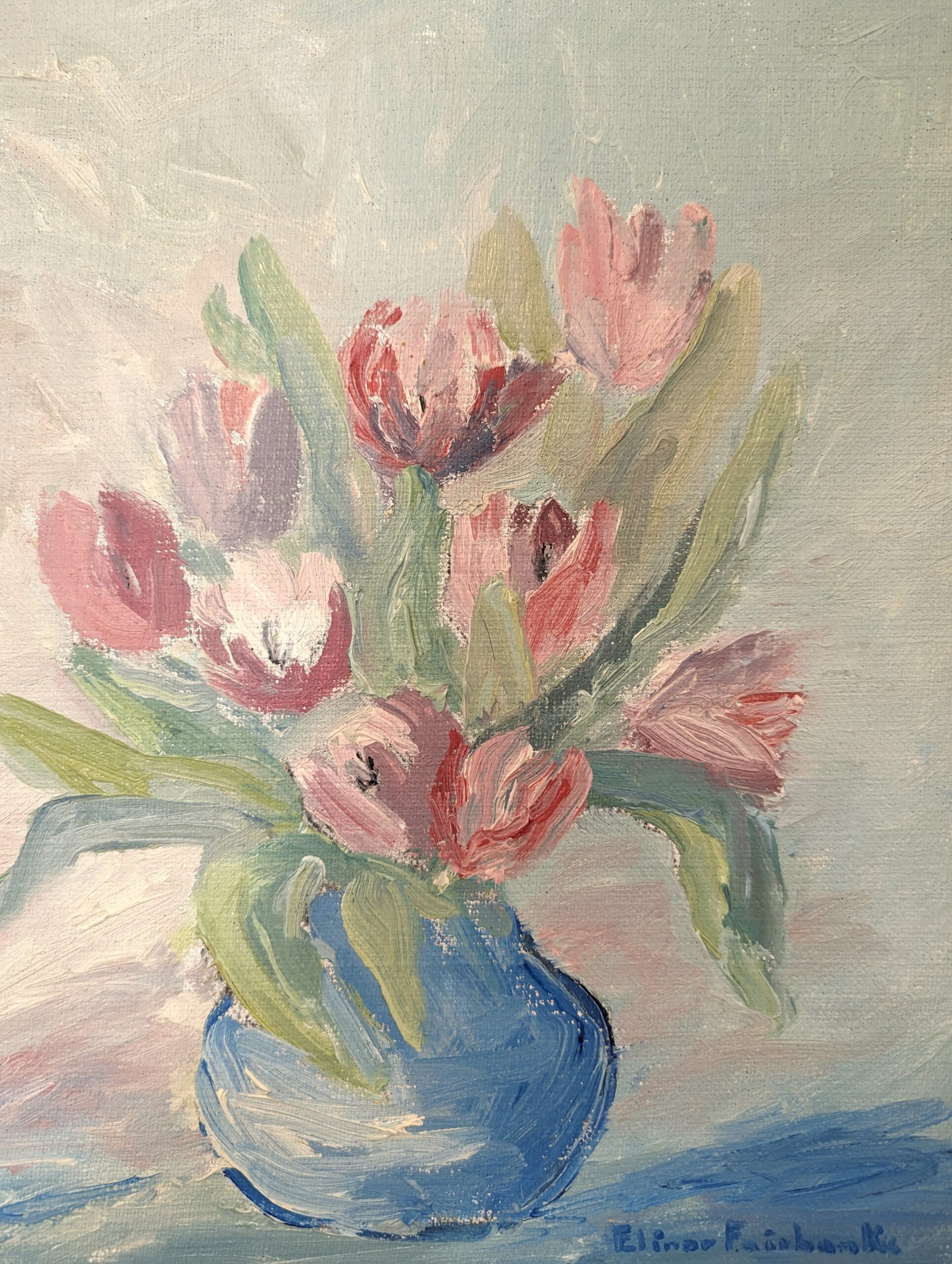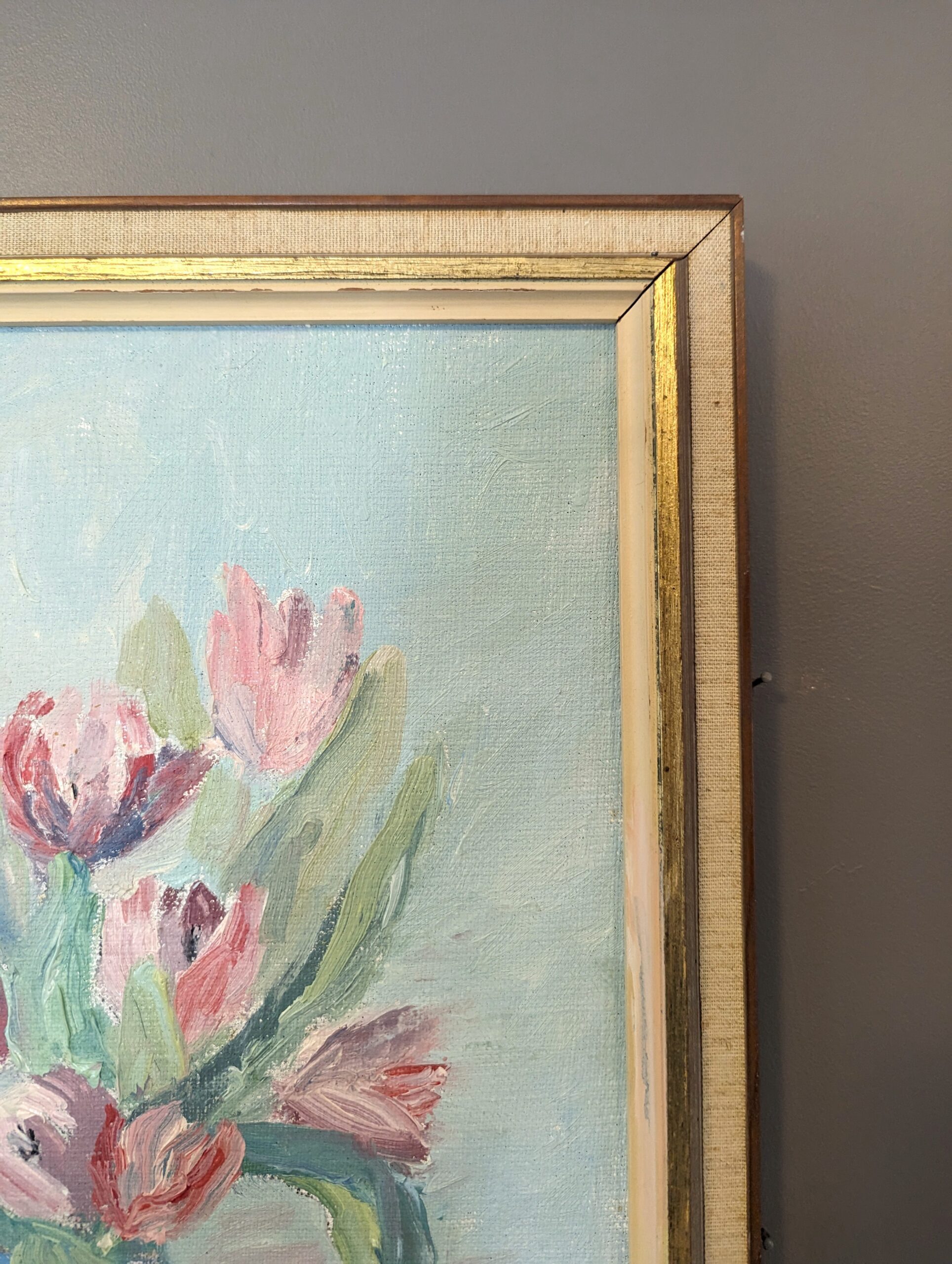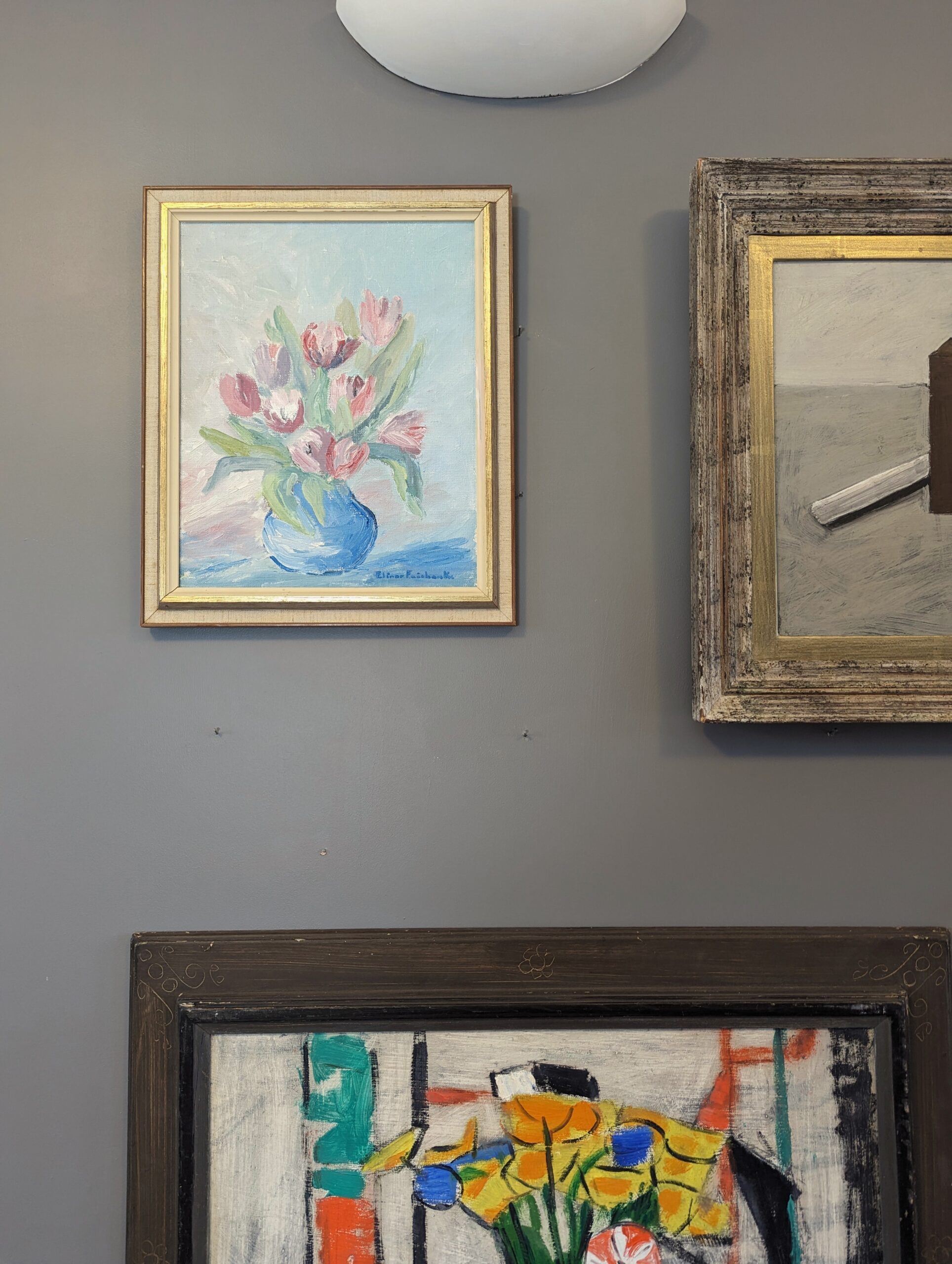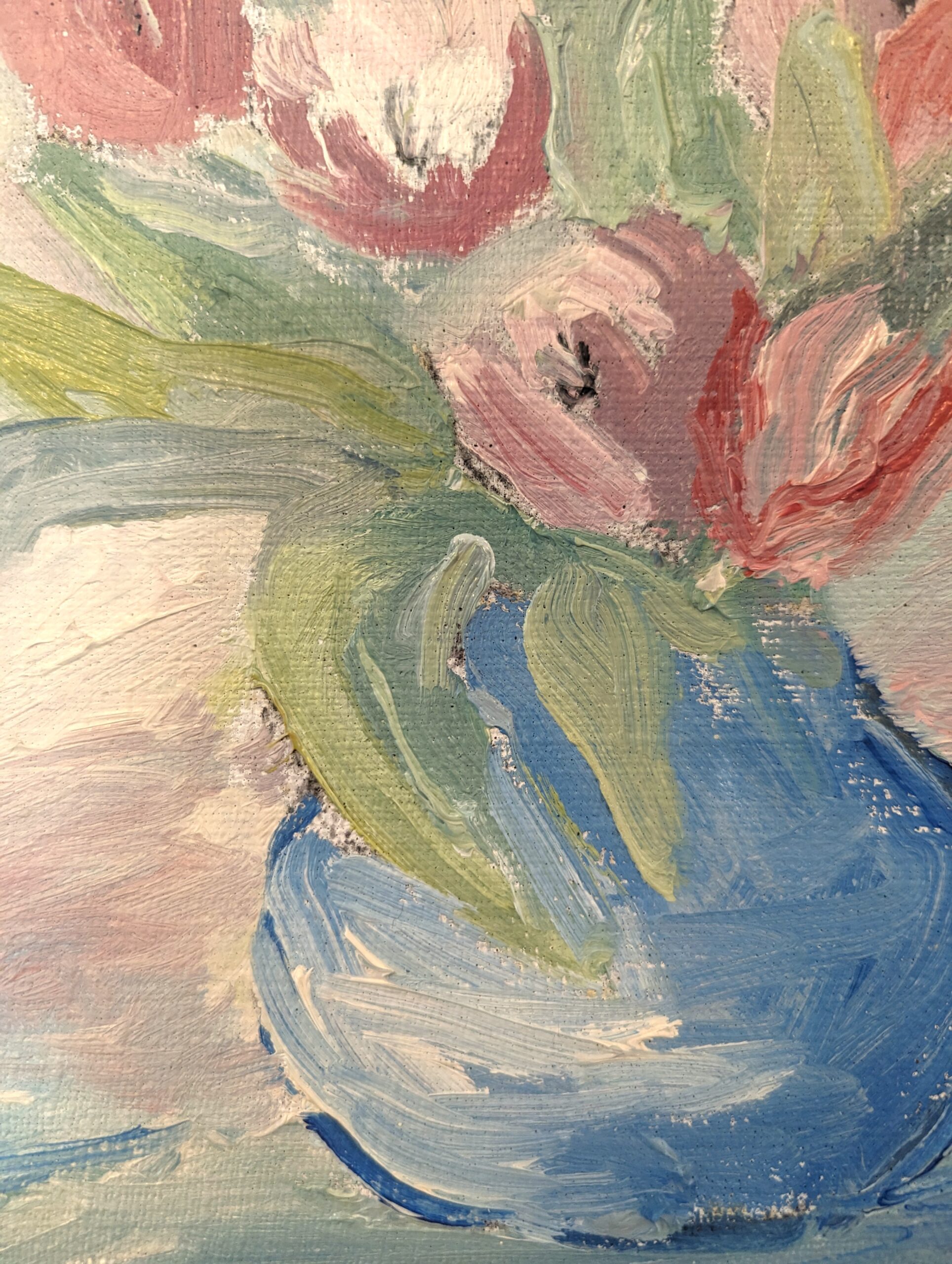In this floral piece we have light pink tulips in a blue vase, painted in an expressionist style. Broad, gestural brushstrokes in a range of soft, pastel colours make up this composition. The flowers and vase is set against a background of light blue and pink, which transitions into a richer blue as we move down the canvas. There is a wonderful diaphanous quality to this painting which is really easy on the eye. Floral pieces like these have a timelessness to them which make them in an easy fit in many interior settings. The lightness to this one would certainly uplift the mood of a space.