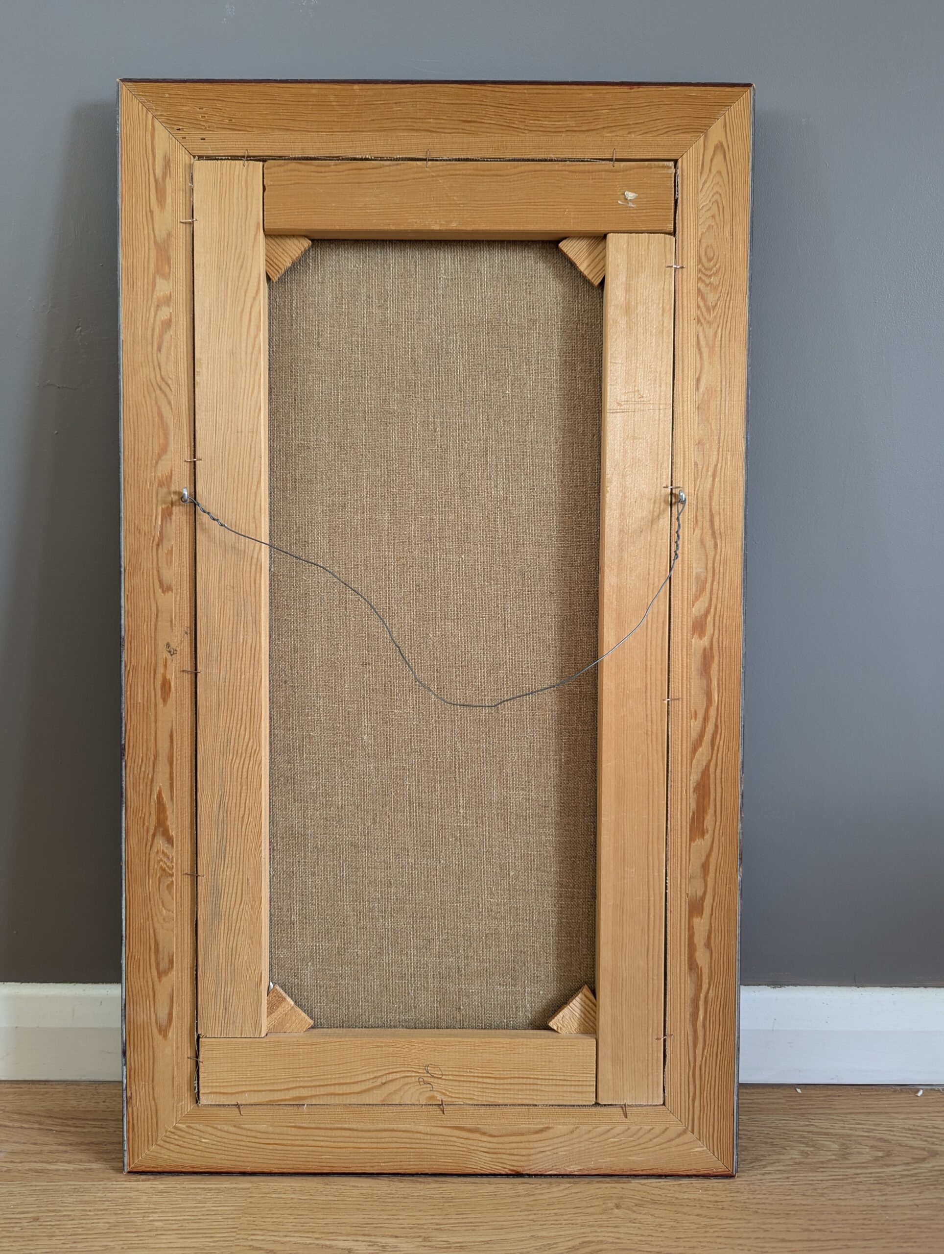 This oil on canvas is housed in a complementary frame with a hessian lined border. Both the painting and frame are in excellent vintage condition