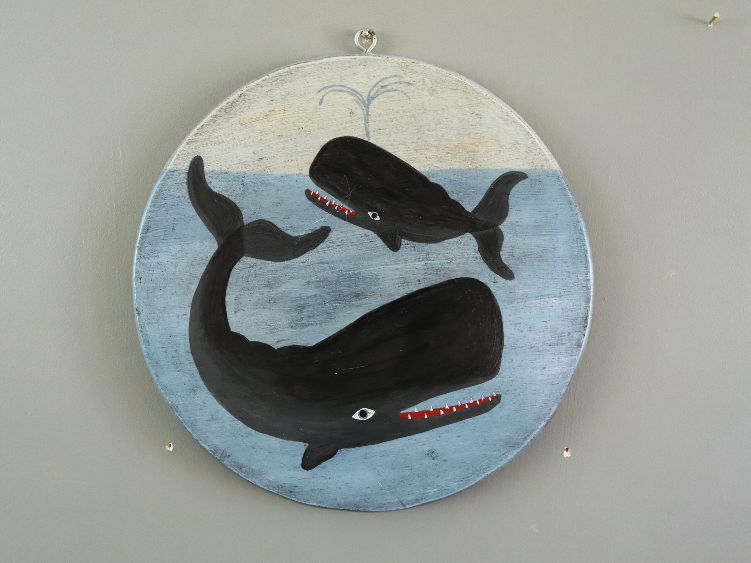 A very engaging nautical whale scene, painted in a naïve style in oil onto canvas, by British artist Matt Rix.