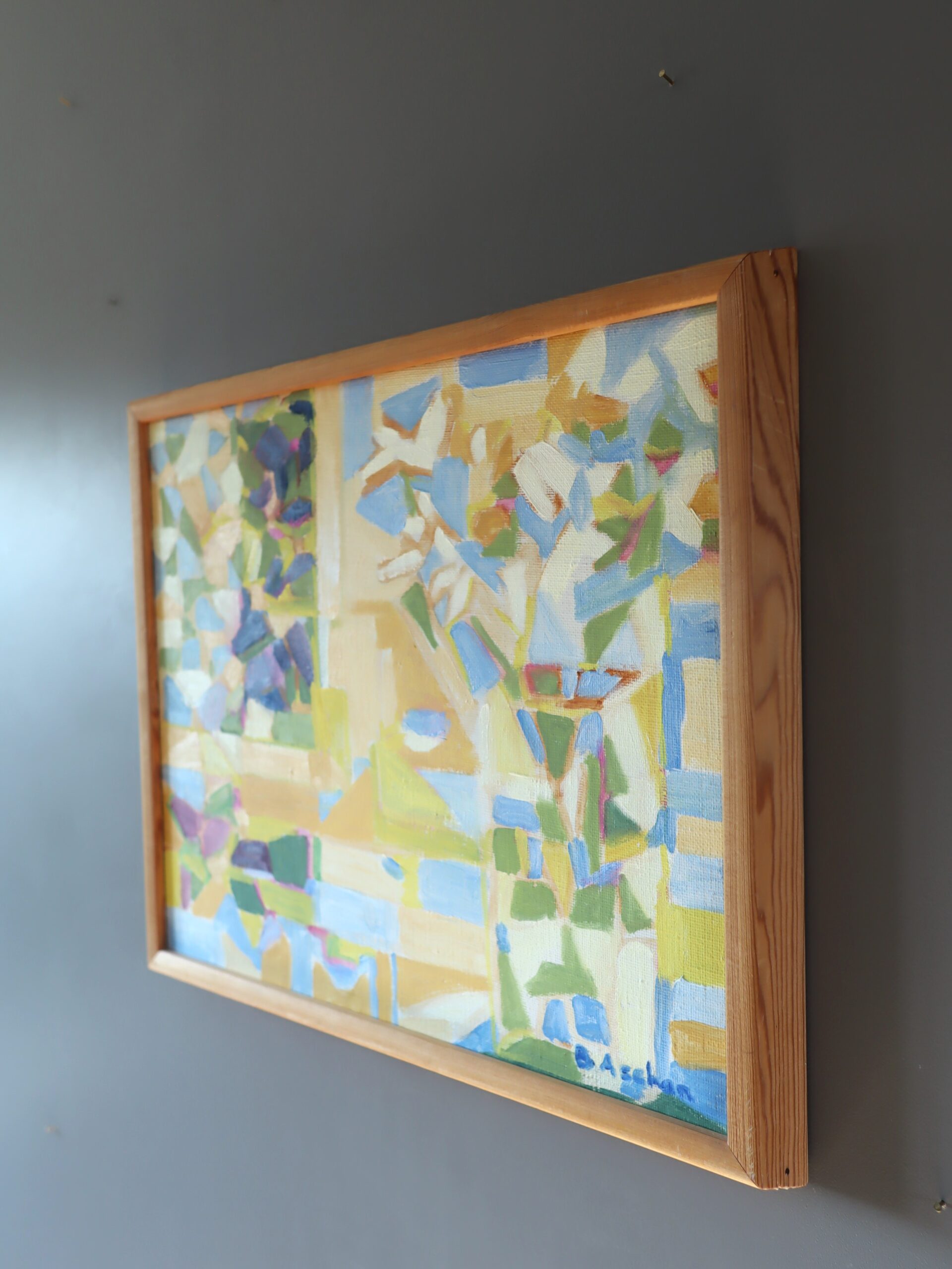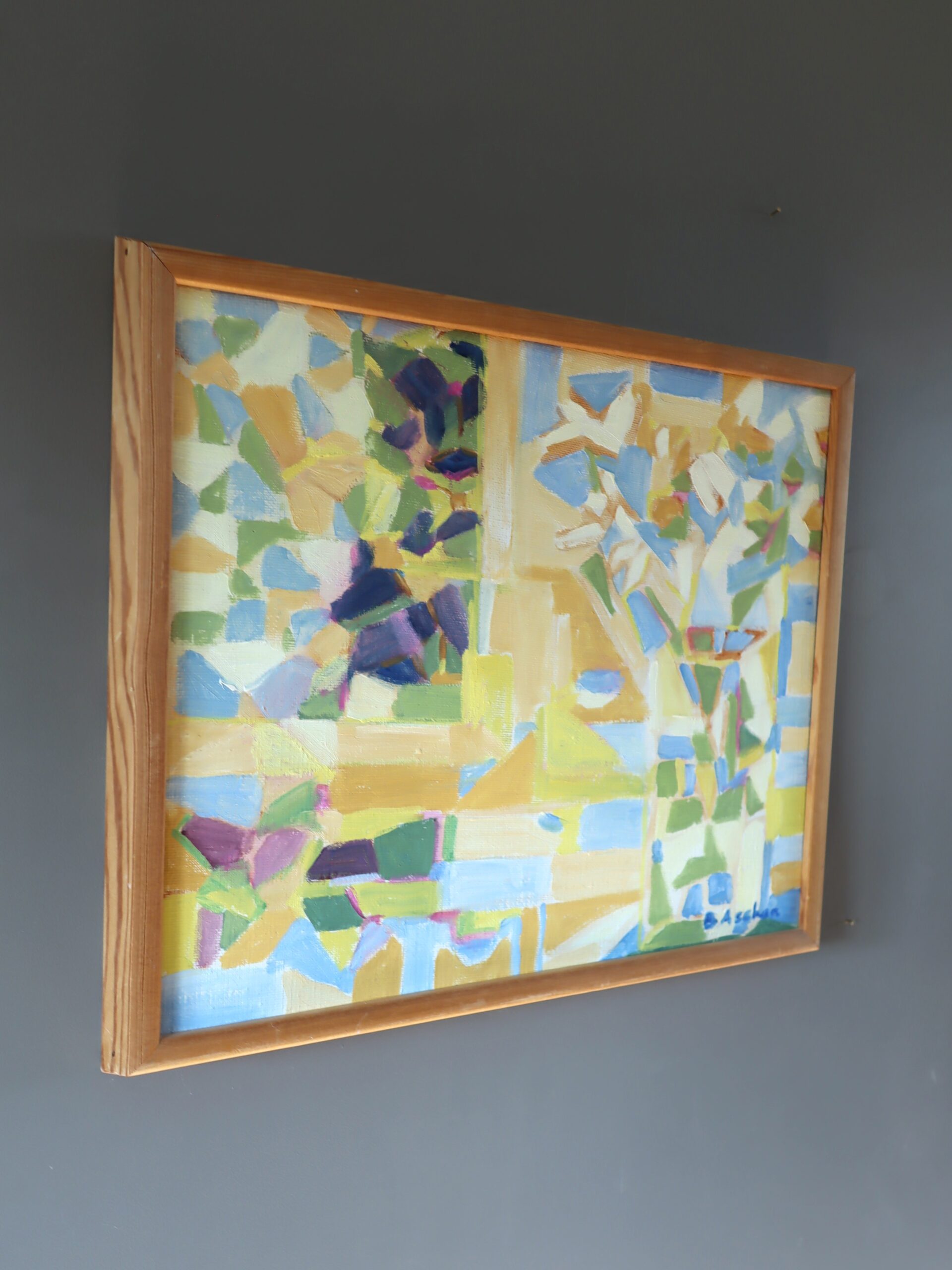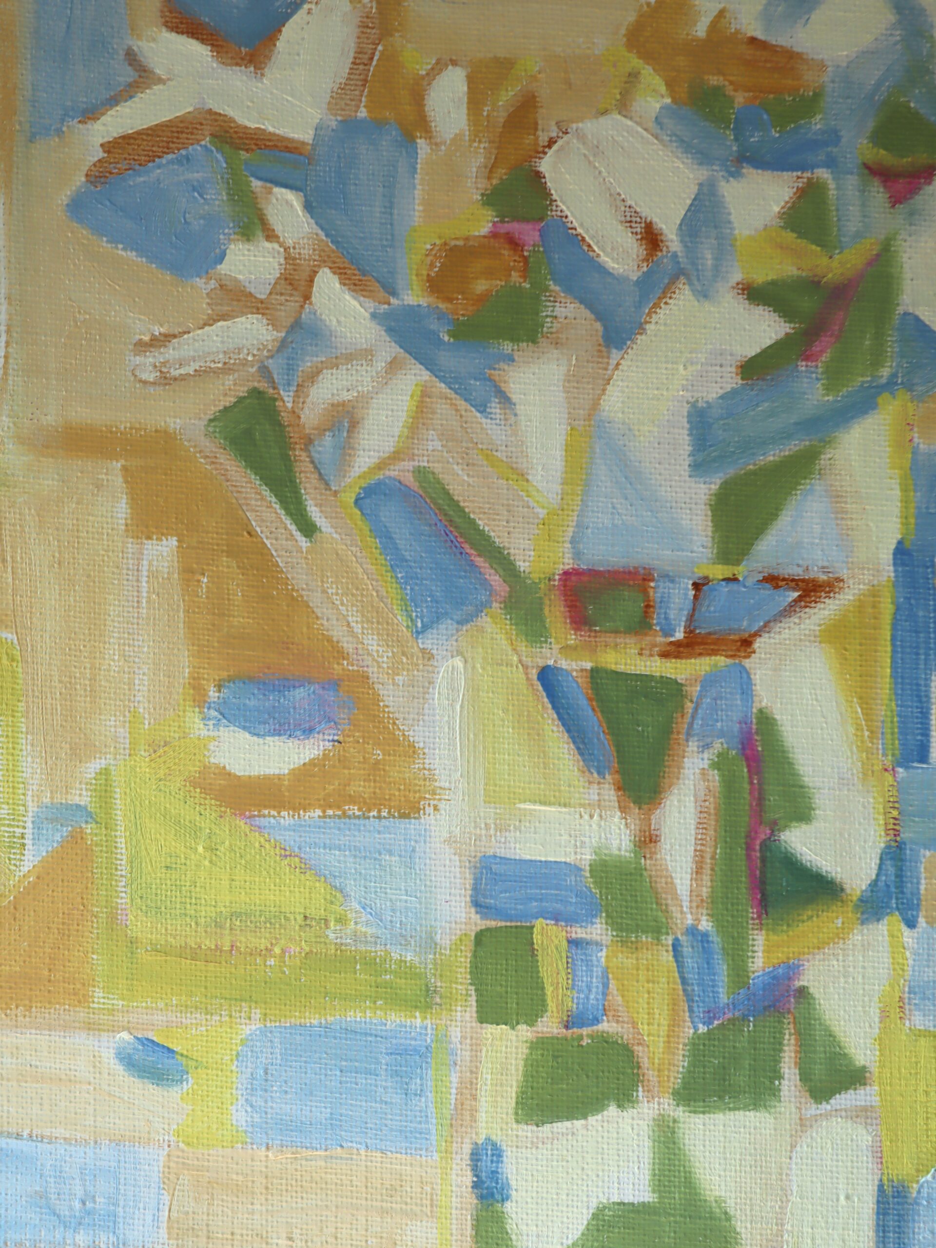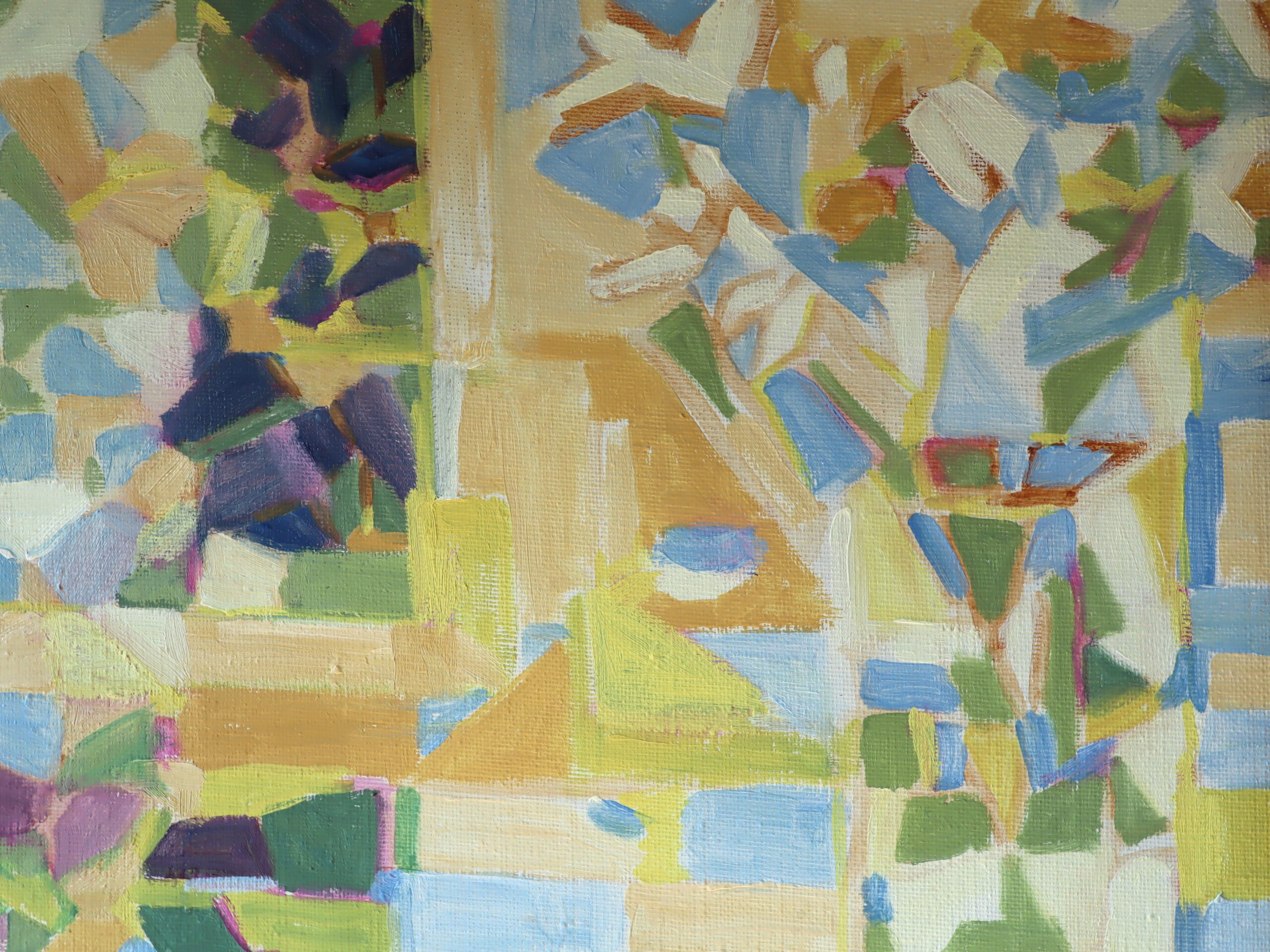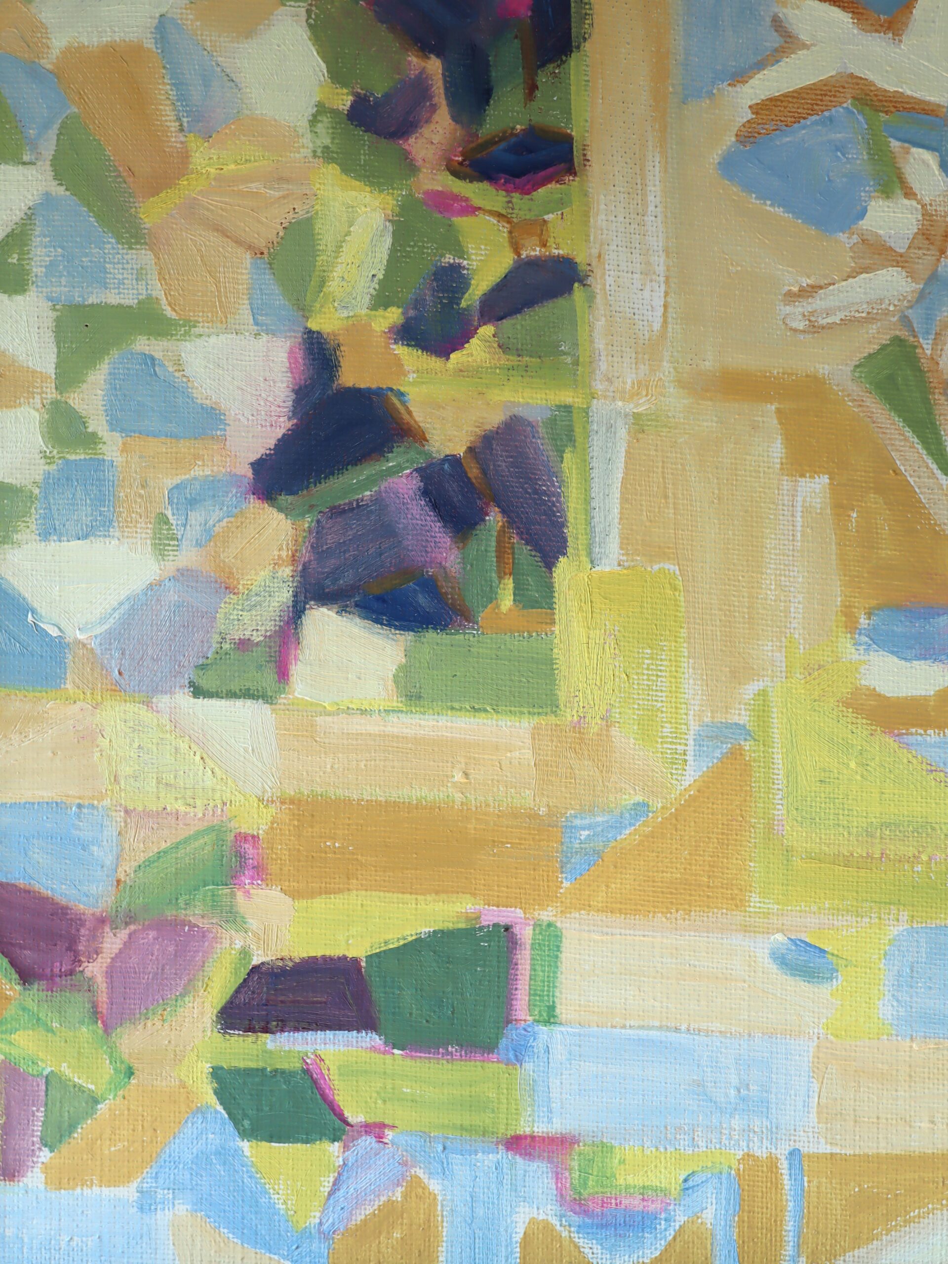 This painting evokes the feeling of light filtering through a window onto a lively garden. Fragmented planes and overlapping shapes hint at foliage, architectural lines and perhaps a vase or tabletop, yet the subject remains intentionally fluid – an interplay between interior and exterior, structure and nature.