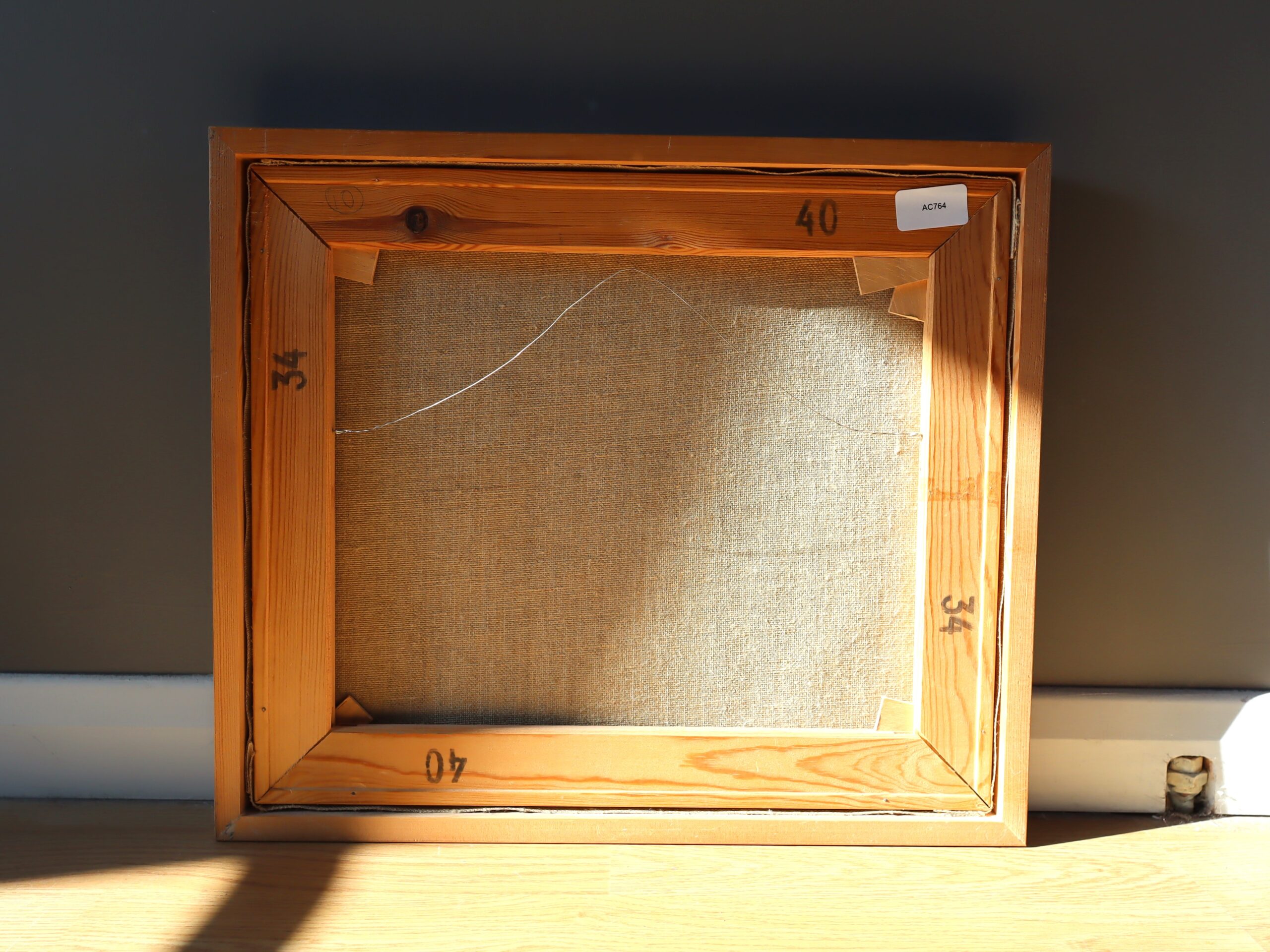 This oil on canvas is housed in a complementary wood frame. Both the painting and frame are in excellent vintage condition.