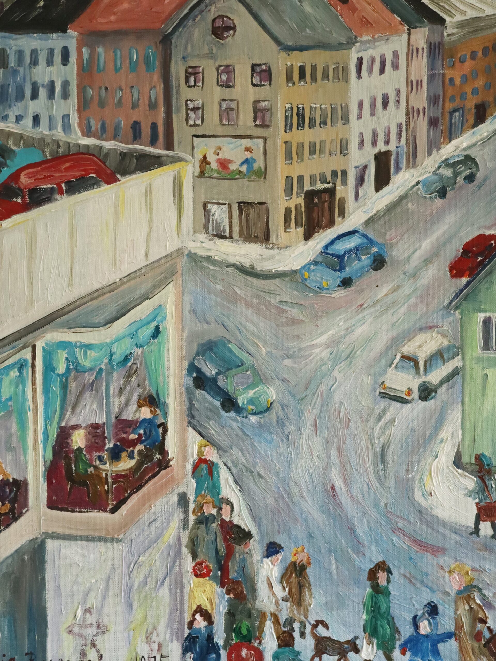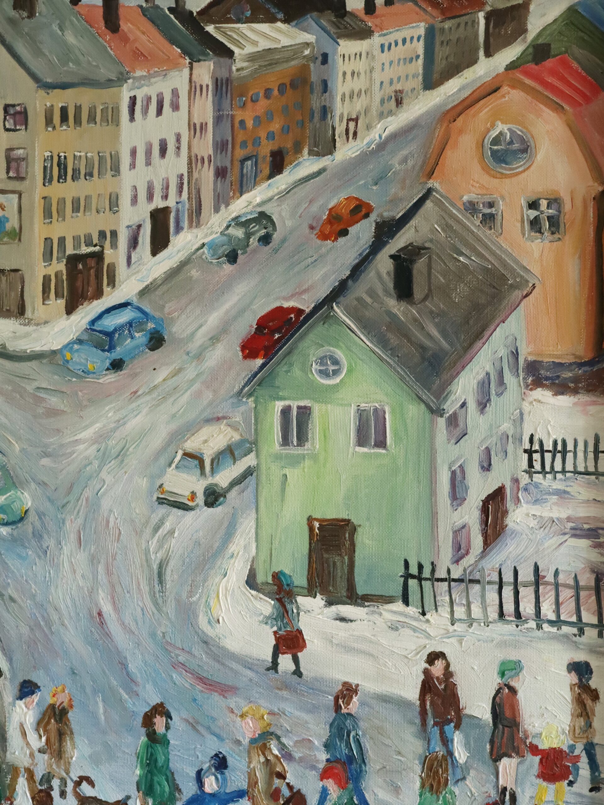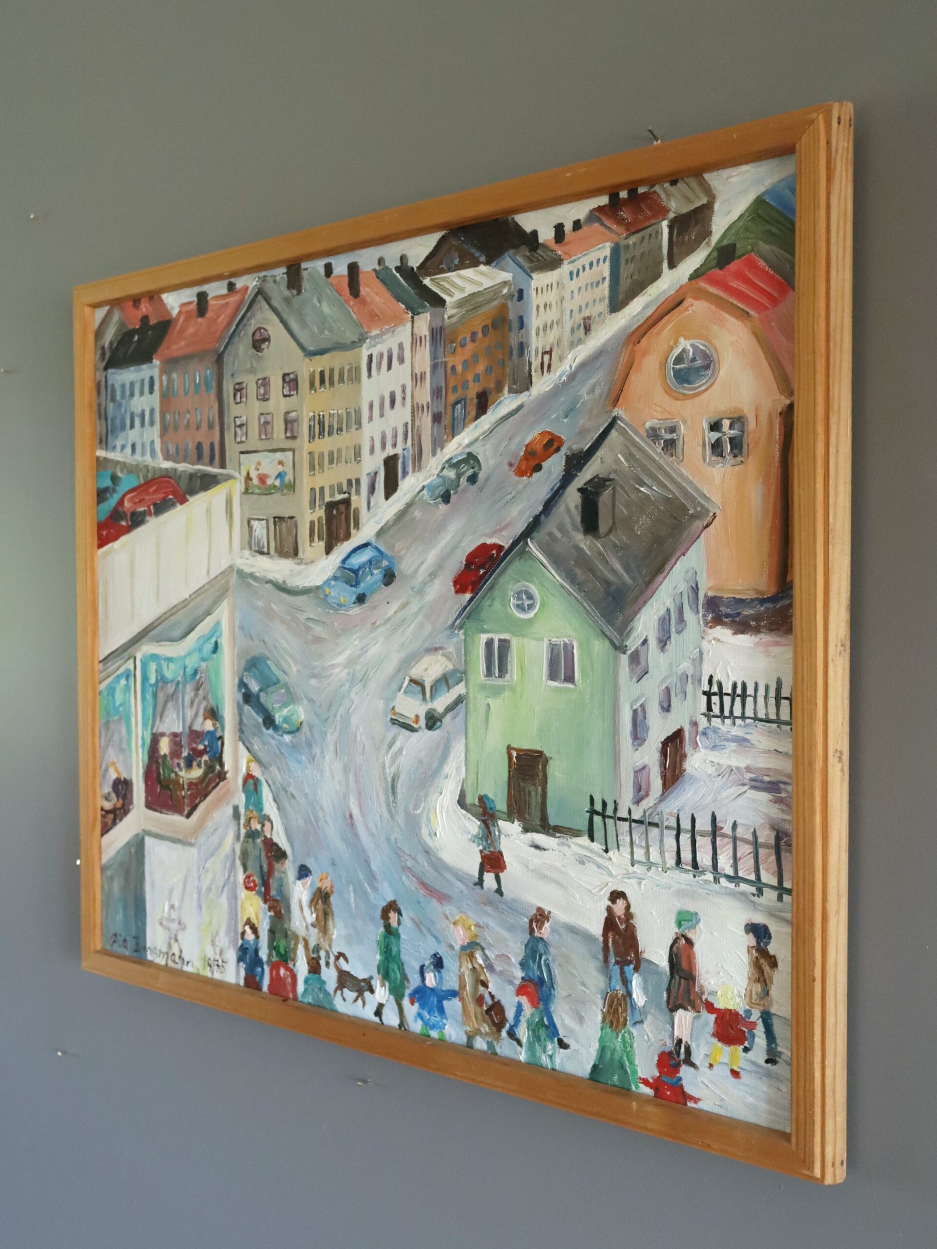 A charming and lively winter street scene composition animated by everyday life, painted in a Naïve, expressive style, executed in oil onto canvas and dated 1975.