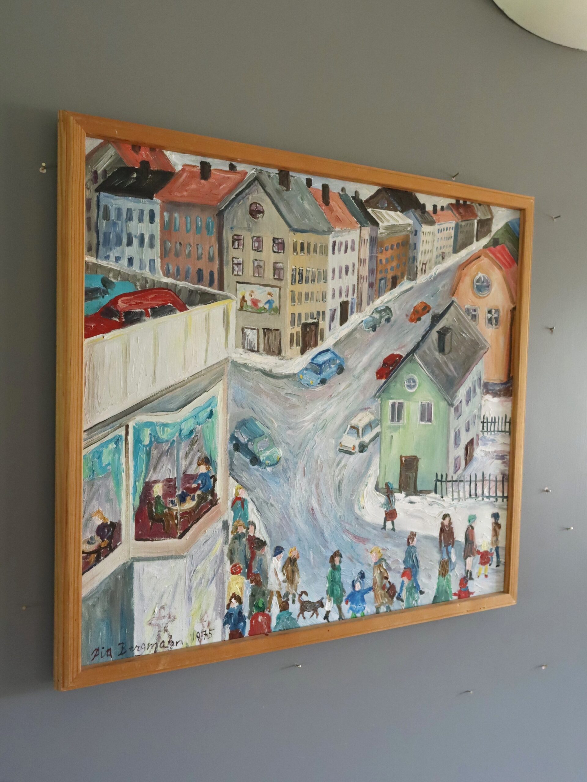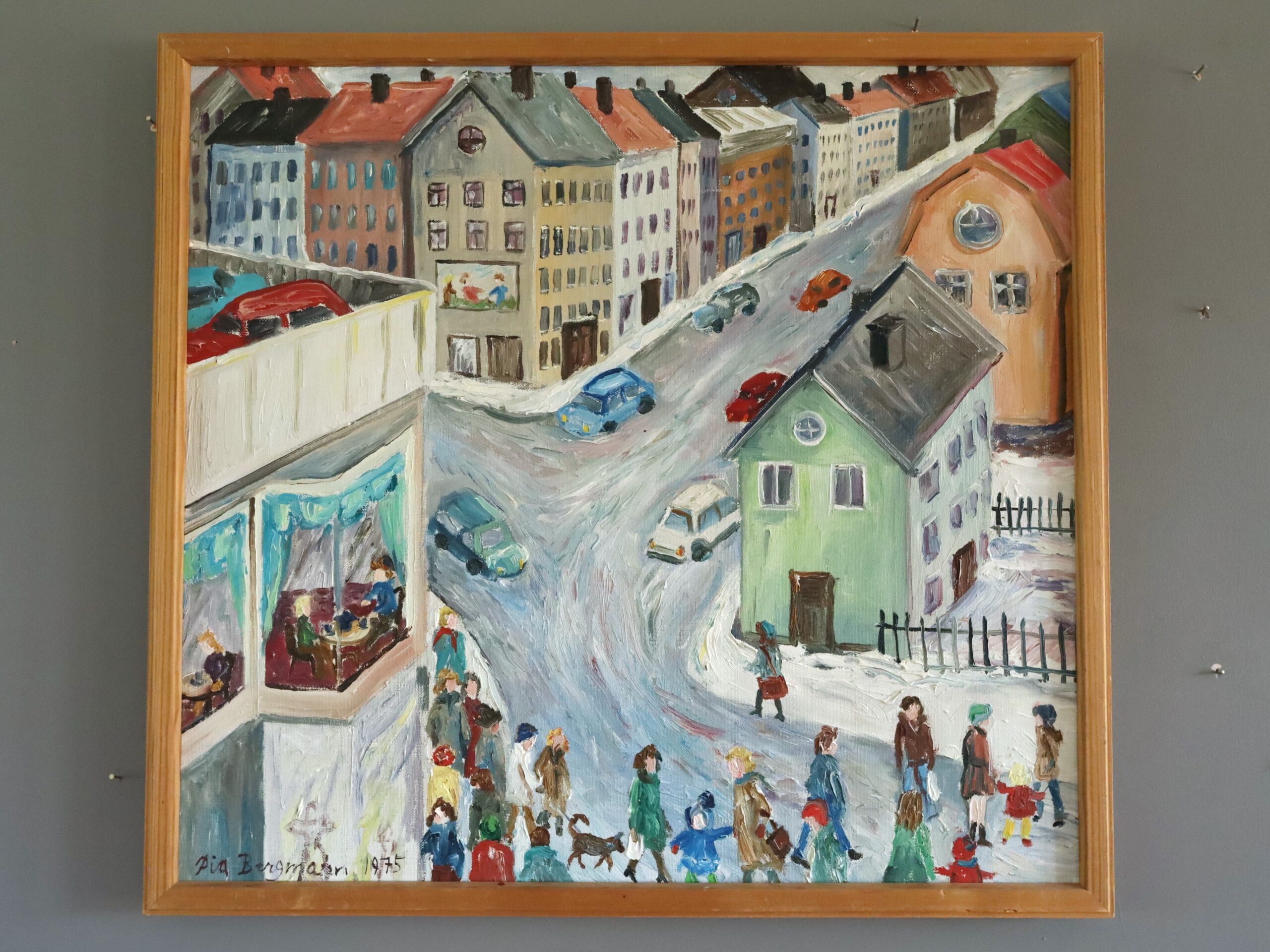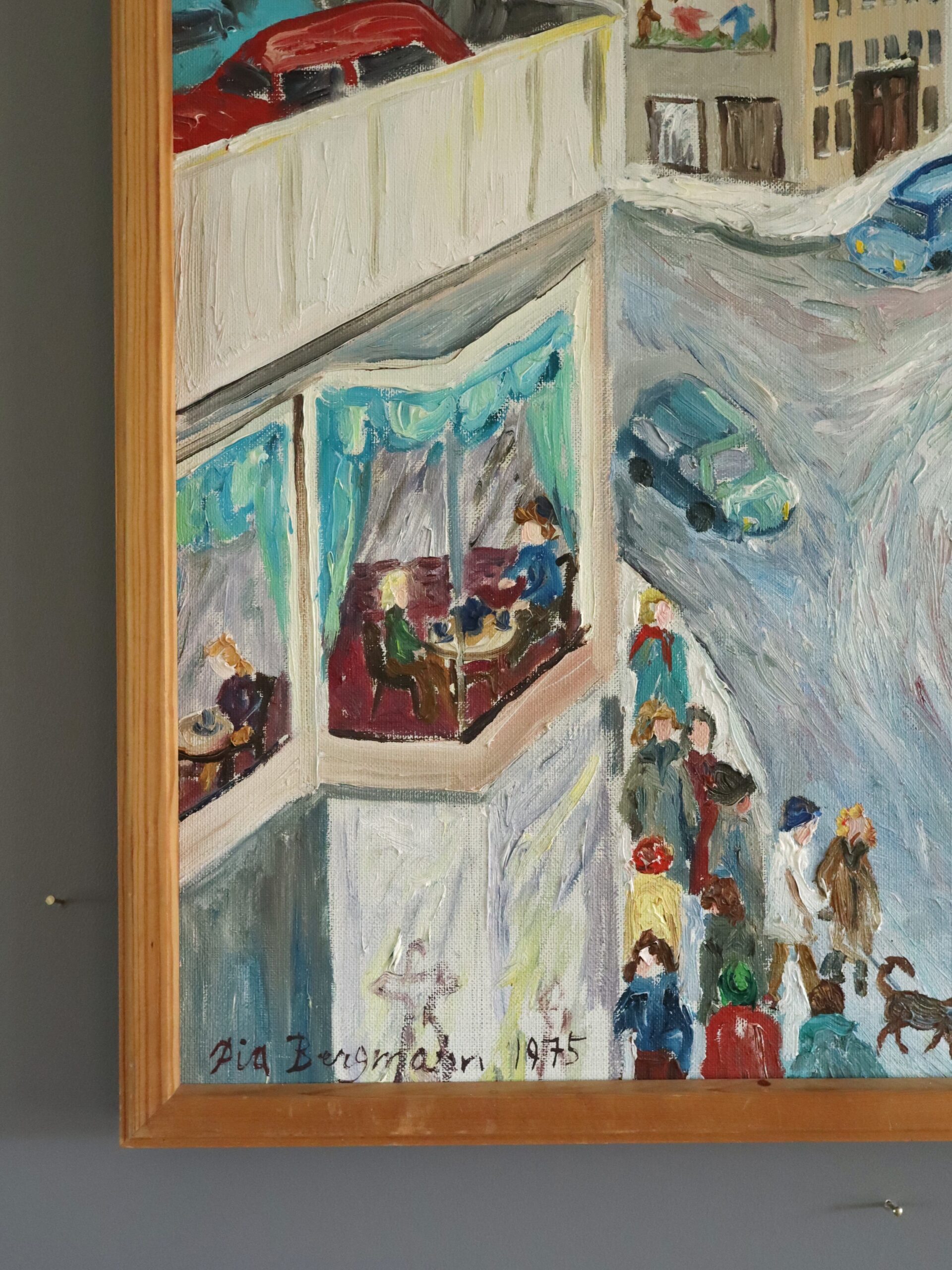 A charming and lively winter street scene composition animated by everyday life, painted in a Naïve, expressive style, executed in oil onto canvas and dated 1975.