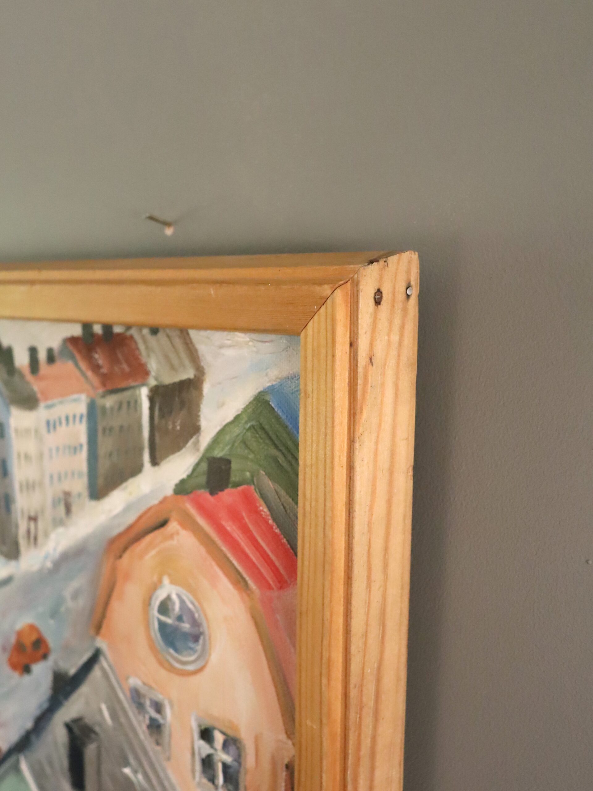 Rendered in a naïve style, the work is rich in storytelling detail and communal warmth. The brushstrokes are expressive and confident, with thick applications of paint lending a textured, tactile quality to the icy streets and clothing folds. The palette is joyful and vivid – icy blues, moss greens, reds, and apricot tones come together to enliven the cold winter setting, while bold outlines and rhythmic patterns give the composition a whimsical structure.